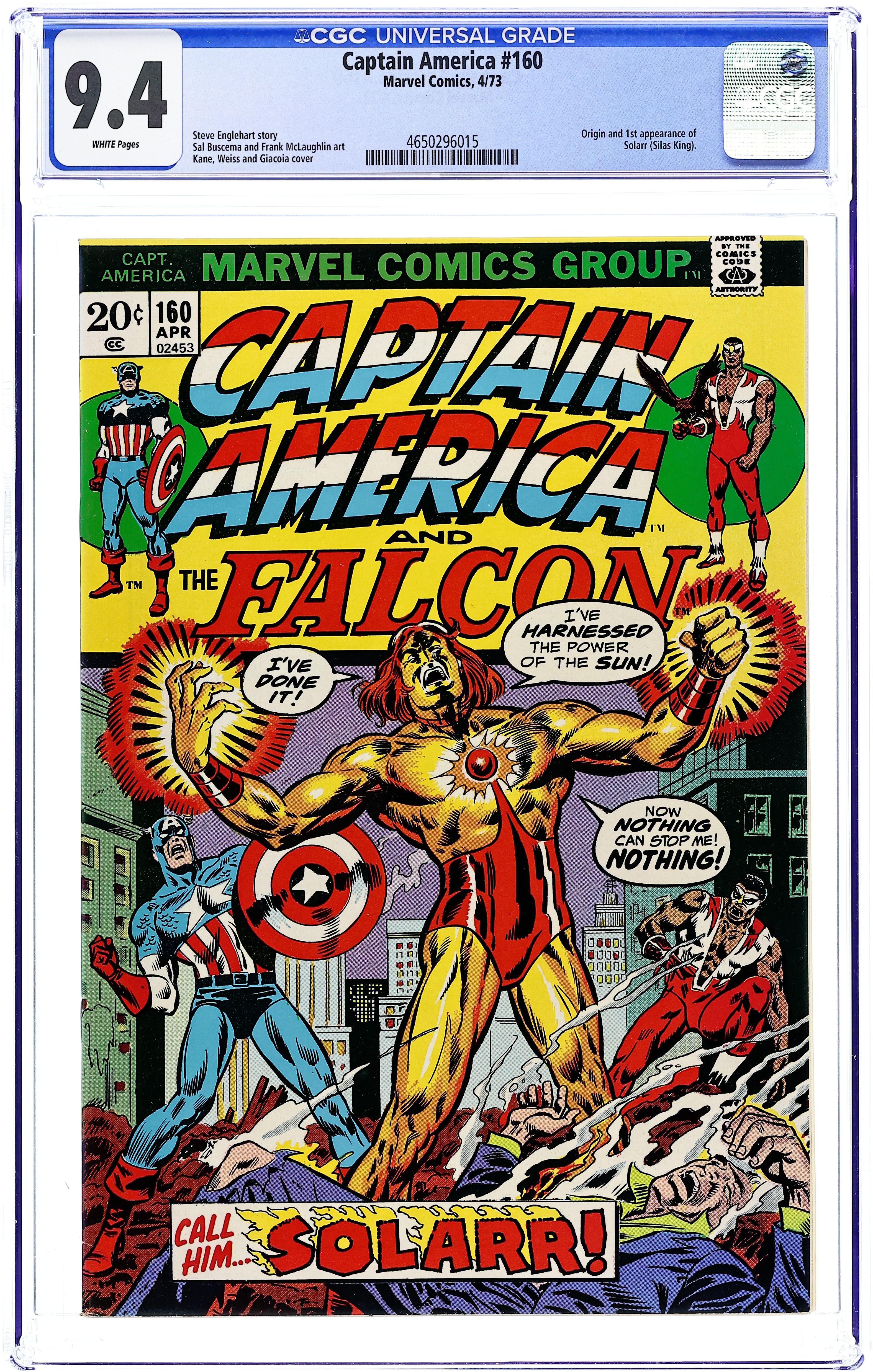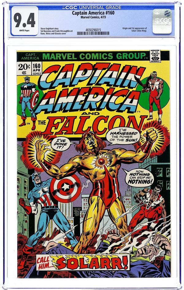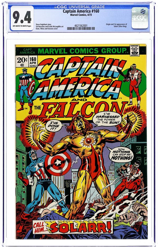 "Enter: Solarr!" First appearance of Solarr. Script by Steve Englehart. Pencils by Sal Buscema. Inks by Frank McLaughlin. Cover by Alan Weiss (pencils), Frank Giacoia (inks), and John Romita Sr. (alterations). A new super-villain bursts on the scene with the power of the sun! Solarr barges into the New York Stock Exchange and robs the venerable institution! And in the process, he kills several innocent bystanders. Fortunately, the star-spangled avenger is in Lower Manhattan this particular afternoon, and he quickly engages Solarr! Will Cap's newfound super-strength lead to victory against his solar-powered foe? In the meantime, the Falcon wonders how he will measure up to his new and improved partner. Origin of Solarr. Cameo appearances by Leila Taylor and Sharon Carter. (Note: Solarr appears next in Avengers 126.) 36 pages. Cover price $0.20.