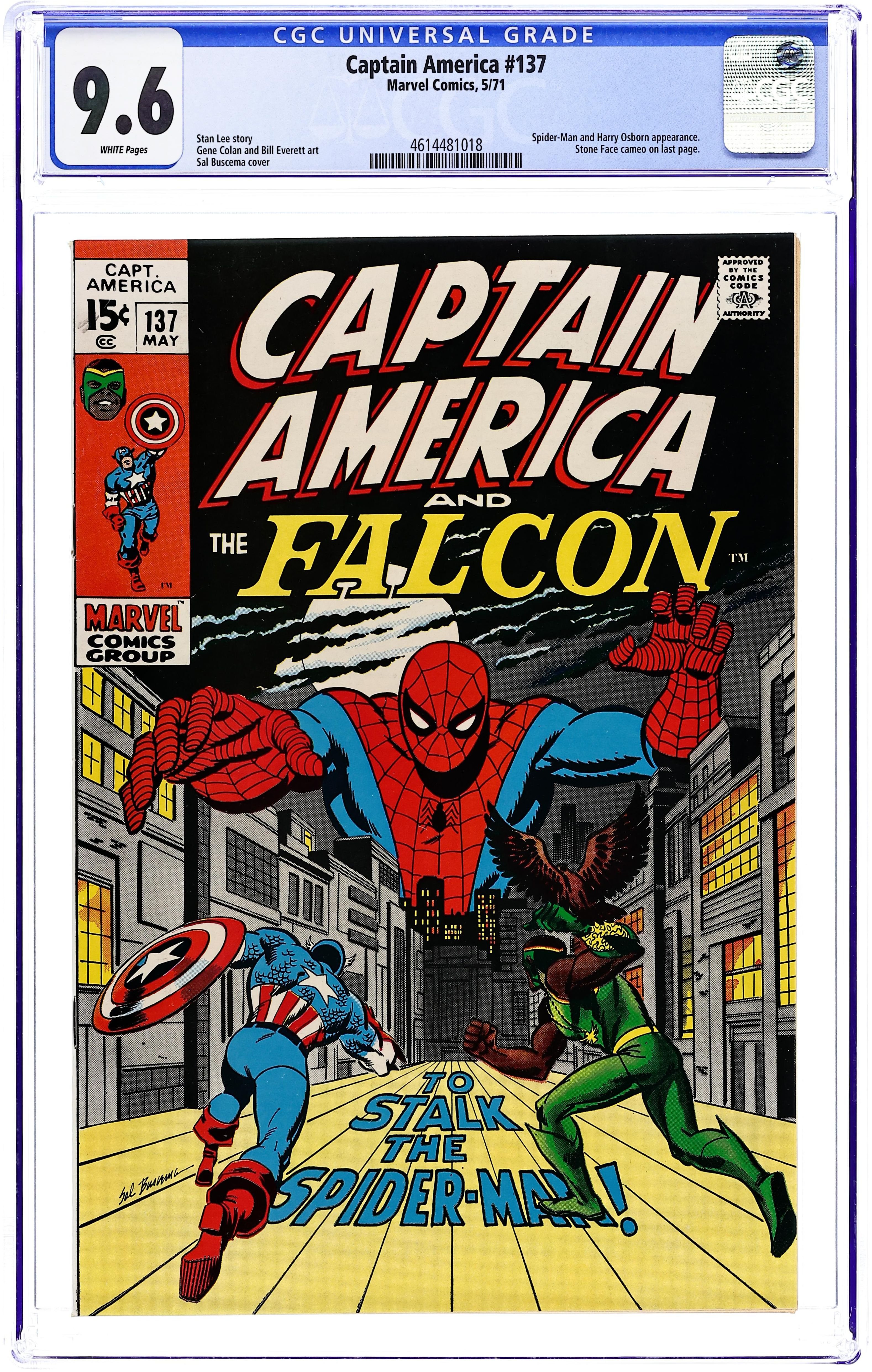 Cover art by Sal Buscema. "To Stalk the Spider-Man," script by Stan Lee, pencils by Gene Colan, inks by Bill Everett; Mole Man raises Captain America and the Falcon to the surface with his levitation beam; The Falcon sees Spider-Man, who is currently wanted by the police, swinging through the city; He decides to capture the Web-Slinger; Falcon stops a mugging, but continues his pursuit of Spidey; Falcon thinks Harry Osborne is Spider-Man and captures him; Peter Parker changes into his Spidey suit goes to rescue Harry; Spidey defeats the Falcon and plants a Spider-Tracer on him; The gangster Stone Face is out on bail and seeking revenge. Brief appearances by Nick Fury and Sharon Carter. 36 pgs., full color. $0.15. Cover price $0.15.
