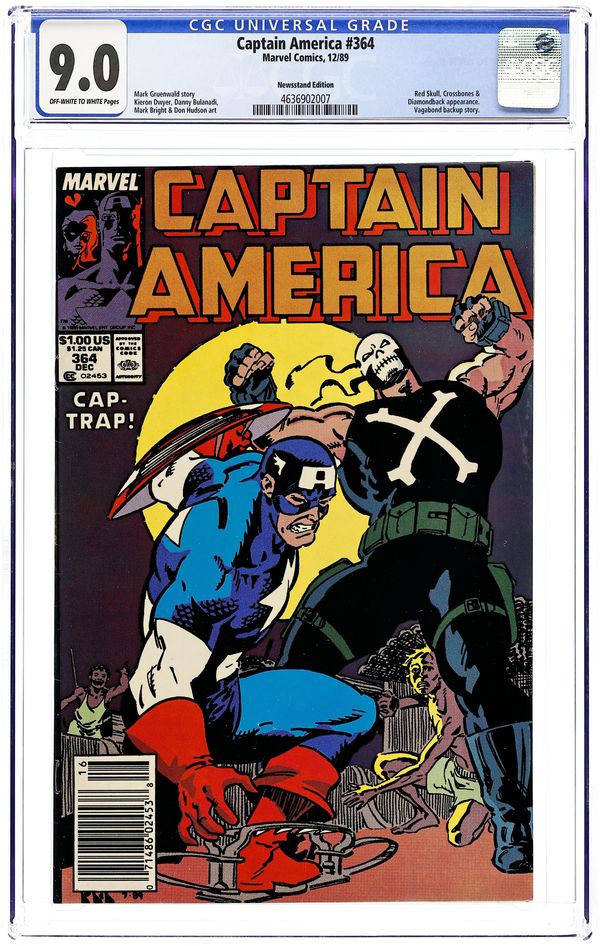 Newsstand Edition. "Man Trap" Story by Mark Gruenwald. Art by Kieron Dwyer and Danny Bulanadi. Cover by Kieron Dwyer. It's the first battle between Crossbones and Captain America! However, Cap must get the bear trap off his leg before engaging Crossbones. Meanwhile, Diamondback battles Mister Phun through the streets of Madripoor! Cameo appearance by the Red Skull. Back up story: "Wristy Business" Story by Mark Gruenwald. Art by Mark Bright and Don Hudson. Vagabond foils the plans of Dr. Malus. 36 pages Cover price $1.00.