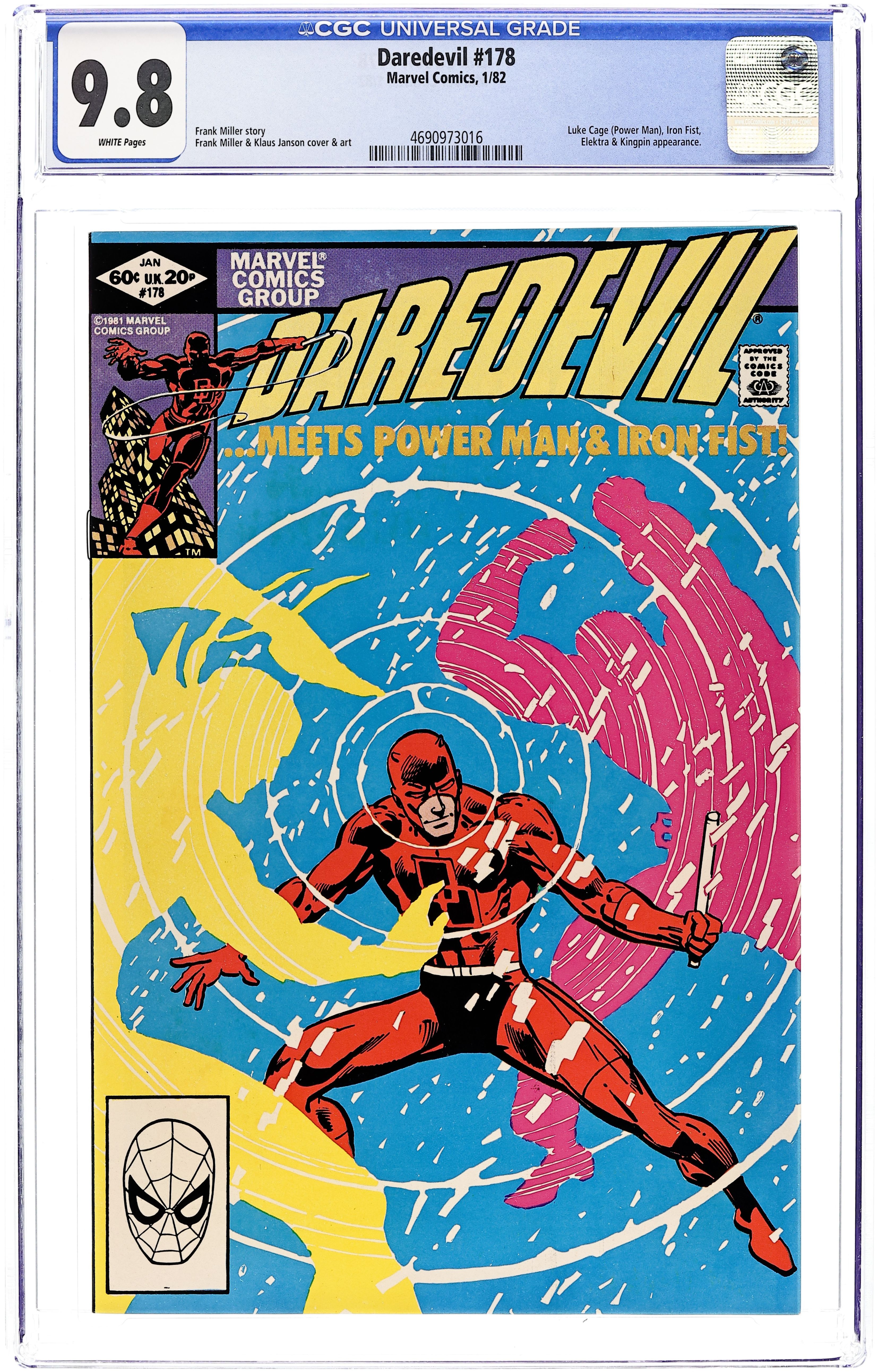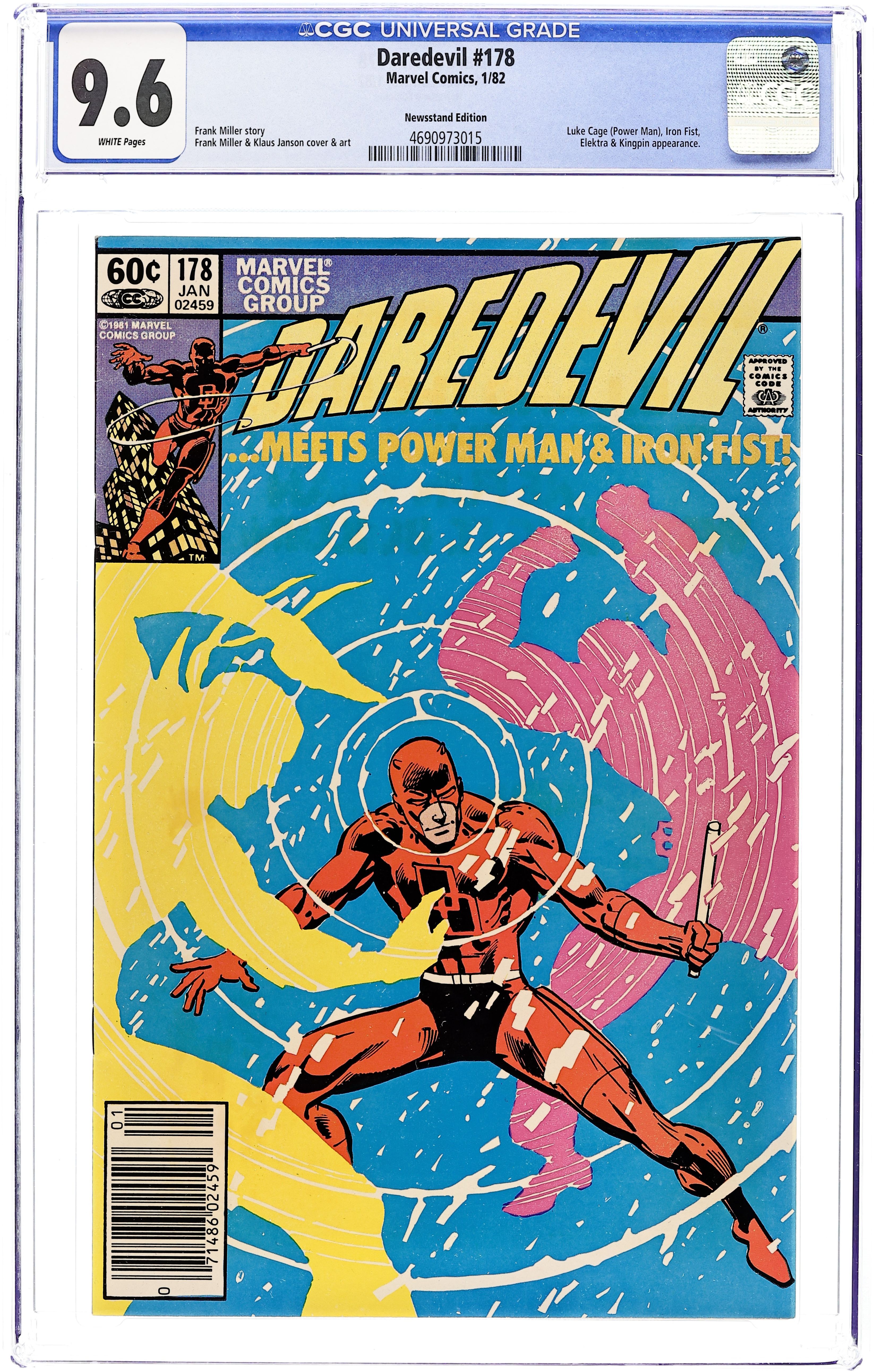 Direct Edition. "Paper Chase" Written by Frank Miller. Pencils by Frank Miller (breakdowns) and Klaus Janson (finished art), inks by Klaus Janson. Cover pencils by Frank Miller with inks by Klaus Janson. Foggy hires Power Man and Iron Fist to help protect the stooge who is going to help Nelson and Murdock link Mayoral candidate Cherryh to the Kingpin. Kingpin talks to Elektra about employment opportunities. Appearance by J. Jonah Jameson. Notes: Story continued in Power Man and Iron Fist #77. Promo Pin-Up for Power Man and Iron Fist #77 with art by Denys Cowan. First 60-cent issue. Cover price $0.60.