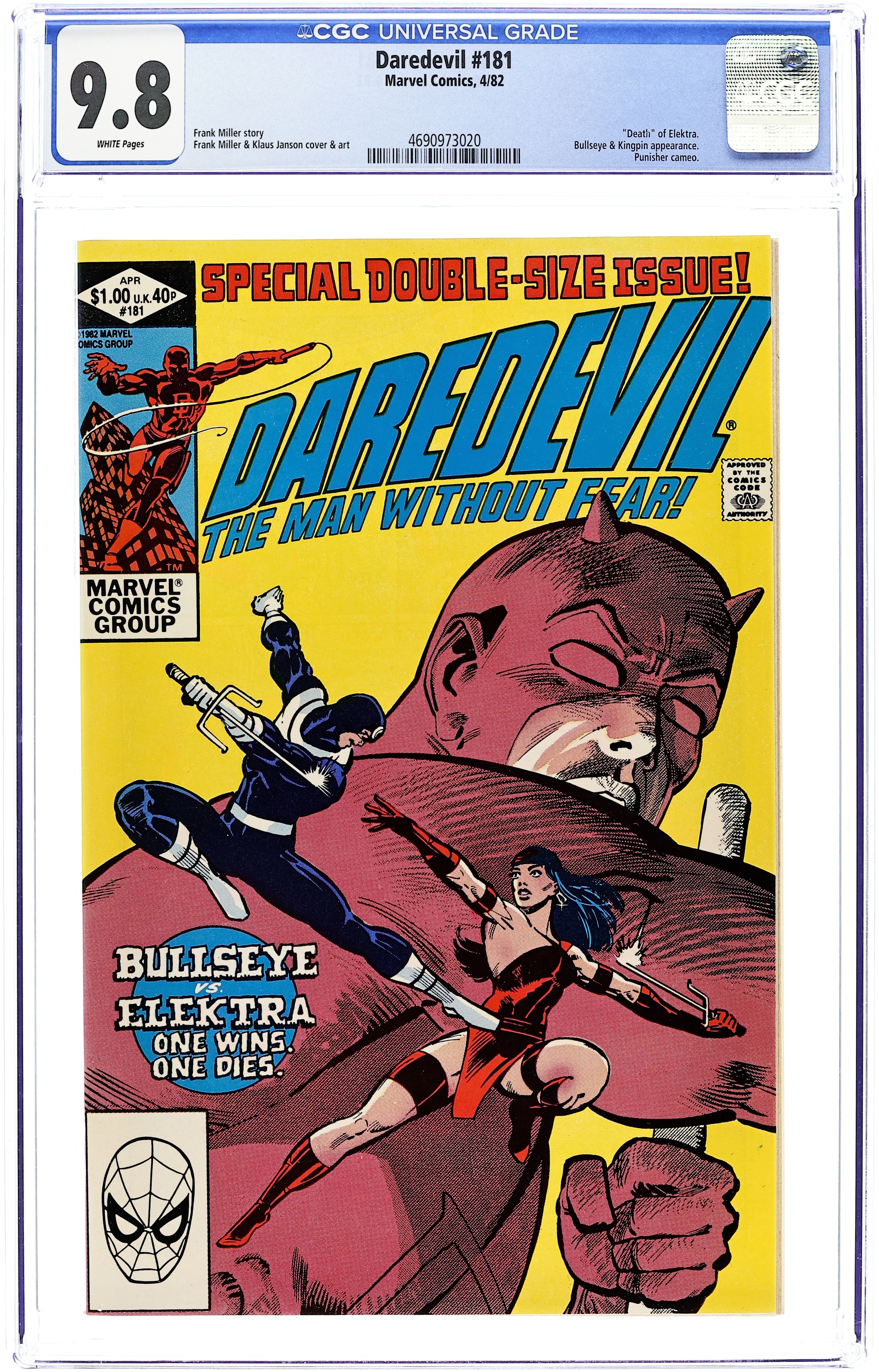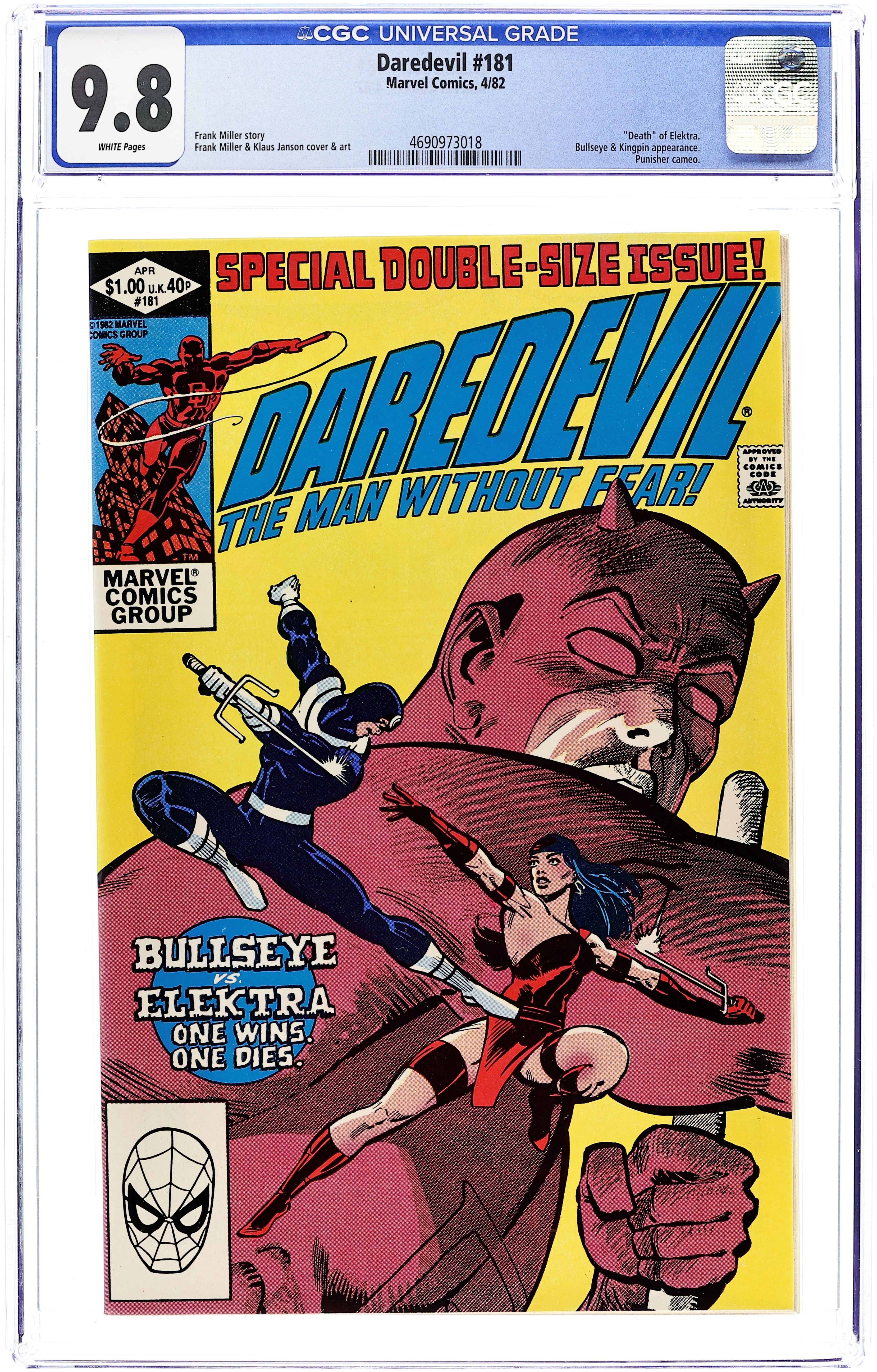 Direct Edition. "She's Alive" Written by Frank Miller. Pencils by Frank Miller (breakdowns) and Klaus Janson (finished art). Inks by Klaus Janson. Cover pencils by Frank Miller with inks by Klaus Janson. Severely distraught with grief, Matt begins to believe that Elektra is really alive and proceeds to dig her up; Punisher escapes from prison; brief appearances by the Kingpin and the Punisher. Cover price $0.60.