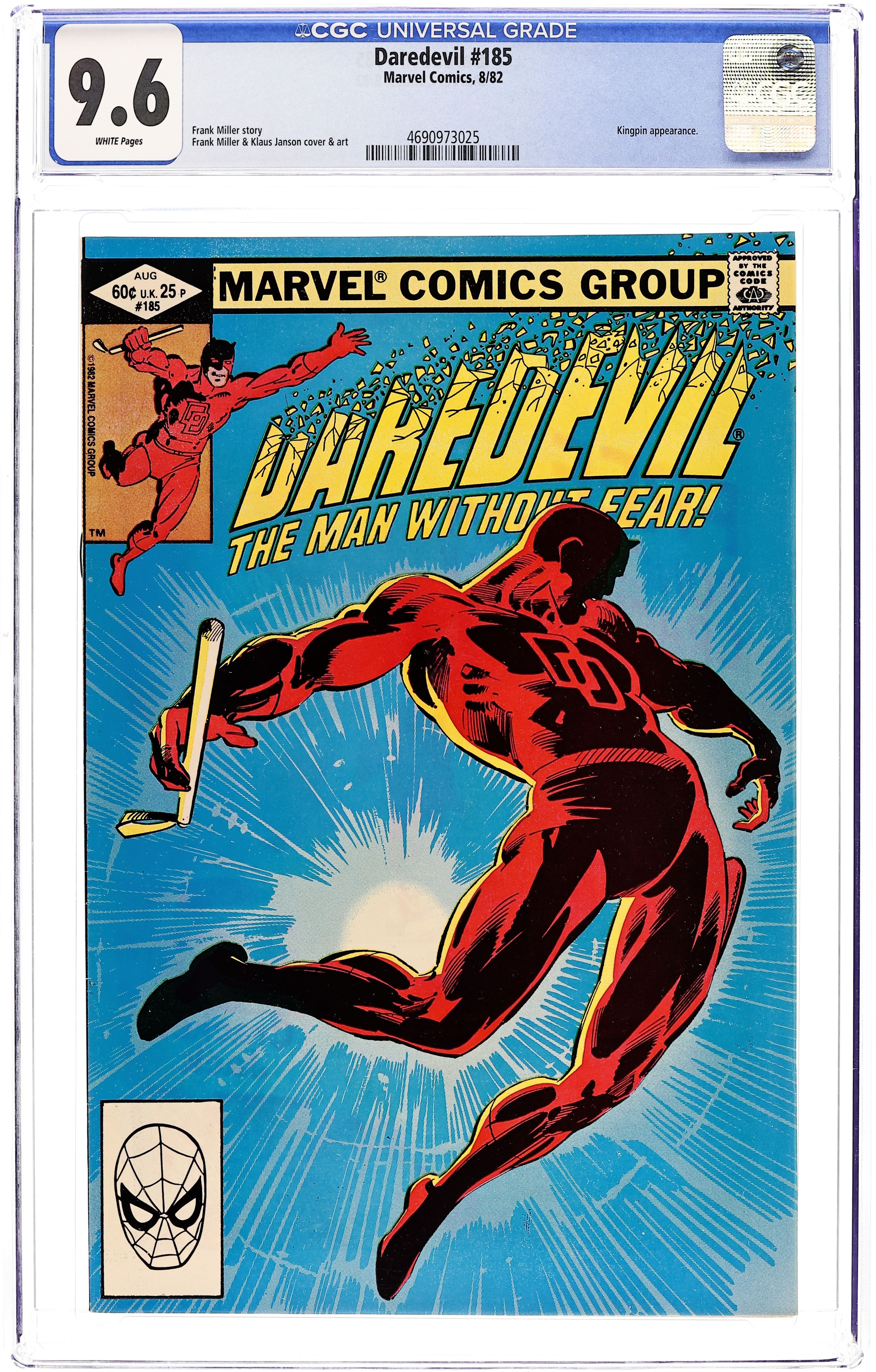 Direct Edition. Cover pencils by Frank Miller, inks by Klaus Janson. The Kingpin Must Die, script by Frank Miller, pencils by Frank Miller, inks by Klaus Janson; Kingpin, retired in Japan, sends his wife to New York to hire Nelson and Murdock so he can turn states evidence against the East Coast crime bosses; Vanessa is captured by the mob so they can lure Kingpin back to New York so they can kill him; Daredevil gets in the way and has a confrontation with Bullseye. 32 pgs. Cover price $0.50. Cover price $0.50.