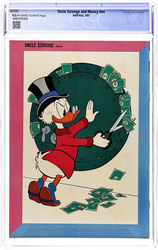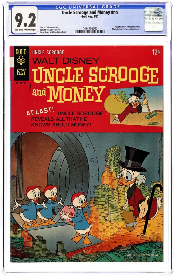 Stories and art by Carl Barks, Dan Spiegle, Don R. Christensen, Tony Strobl, Larry Mayer and Steve Steere. A one-shot from Gold Key, based on the 1967 Disney animated short "Scrooge McDuck and Money." Scrooge narrates the history of money to his nephews, in an adaptation of the 1967 Disney short "Scrooge McDuck and Money." Various fact pages describe the use, appearance and value of money from ancient times to the present. In a story by Carl Barks, Donald gives Uncle Scrooge an old dime to pay a debt, then learns it's worth $5 and tries to get it back. Uncle Scrooge and Money; Coins of Ancient Greece and Rome; Paper Money; Money Words; United States Coinage; Did You Know This About Coins?; The Story of Wampum Money; The United States Bureau of Engraving and Printing. 32 pages, Full Color. Cover price $0.12.