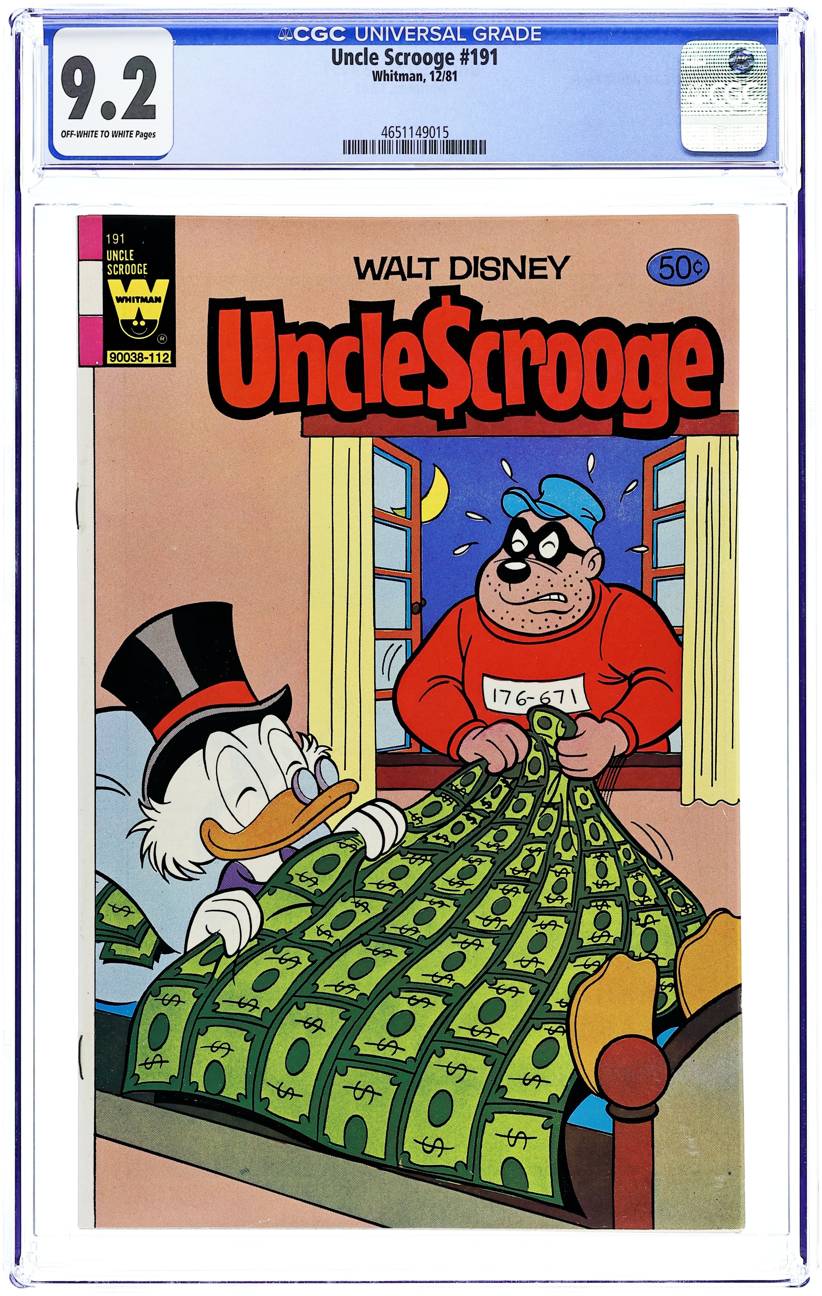 Cover by Pete Alvarado. Stories and art by Vic Lockman, Jack Manning, Eulie Liggera, Pete Alvarado and Tony Strobl. Comics legend Carl Barks creates his masterpiece, featuring the adventures of Donald Duck's Uncle Scrooge, the richest duck in the world. The Beagle Boys get money from Scrooge the legal way, for once, when they sell him their ancient automobile. But when they learn that it's a valuable antique, they plot to steal it back. When Gyro Gearloose's robot mailbox runs amok, he must put on his thinking cap. Antique Antics; The Cash Register Mystery; The New Buck-Mobile; Gyro Gearloose: The Cantankerous Mailbox; Goofys Getter-Upper; The Nightwatchers. 32 pages, Full Color. Cover price $0.50.