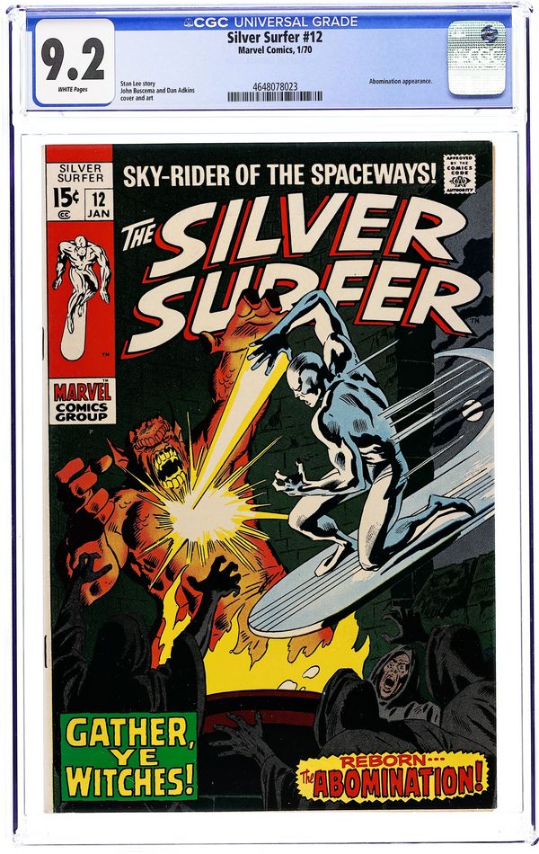 "Gather, Ye Witches!" Written by Stan Lee. Art by John Buscema and Dan Adkins. Can even the Silver Surfer hope to survive an encounter with the awesome might of the Abomination, a creature whose strength rivals that of the Incredible Hulk himself? Cover price $0.15.