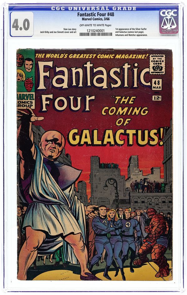 Cover pencils by Jack Kirby, inks by Joe Sinnott. First appearance of Galactus and the Silver Surfer in one of the most famous stories of the Silver Age, The Coming of Galactus!, script by Stan Lee, pencils by Jack Kirby, inks by Joe Sinnott; Black Bolt and the Fantastic Four put an end to Maximus's plan to destroy all the humans; Once the Fantastic Four return to New York the Watcher tells them of the coming danger of Galactus. Letter to the editor from comics writer Don McGregor. 36 pages, full color. Cover price $0.12.