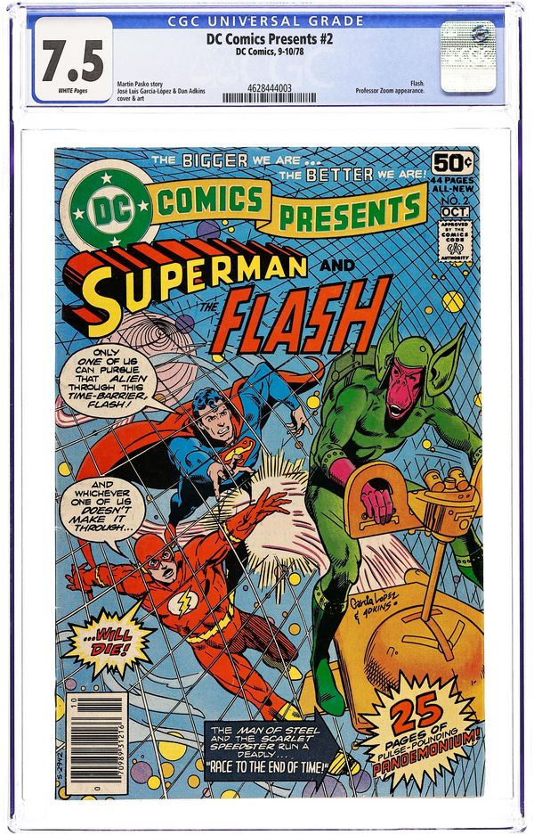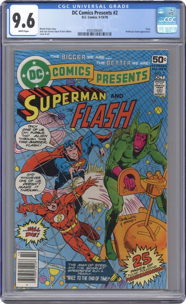 First 50c cover-priced issue. Race to the End of Time! - Written by Martin Pasko. Art and Cover by José Luis García-López and Dan Adkins. Continued from the previous issue. In the 25th century, Superman secretly helps Flash deal with Professor Zoom, before the two head off again across time after Iylar, who is trying to reach the past and end an alien civil war before it began. Flash wants to make sure Iylar makes it through time, so that the Zelkot do not destroy Earth. Superman wants to ensure the war begins so that the Volkir visit Earth in the past and seed life on it. After a number of stops across time, Superman and Flash catch up to Iylar, stop him from preventing the war, and neutralize the aliens' threat against the Earth in the present. Characters in this issue: Superman [Clark Kent]; The Flash [Barry Allen]; Legion of Super-Heroes [Superboy; Brainiac 5; Wildfire; Mon-El; Cosmic Boy; Princess Projectra]; Reverse-Flash [Professor Zoom; Eobard Thawne]; Iylar; a Zelkot; a Volkir. 40 pages, full color. Cover price $0.50.