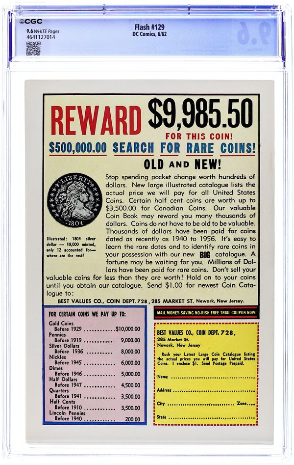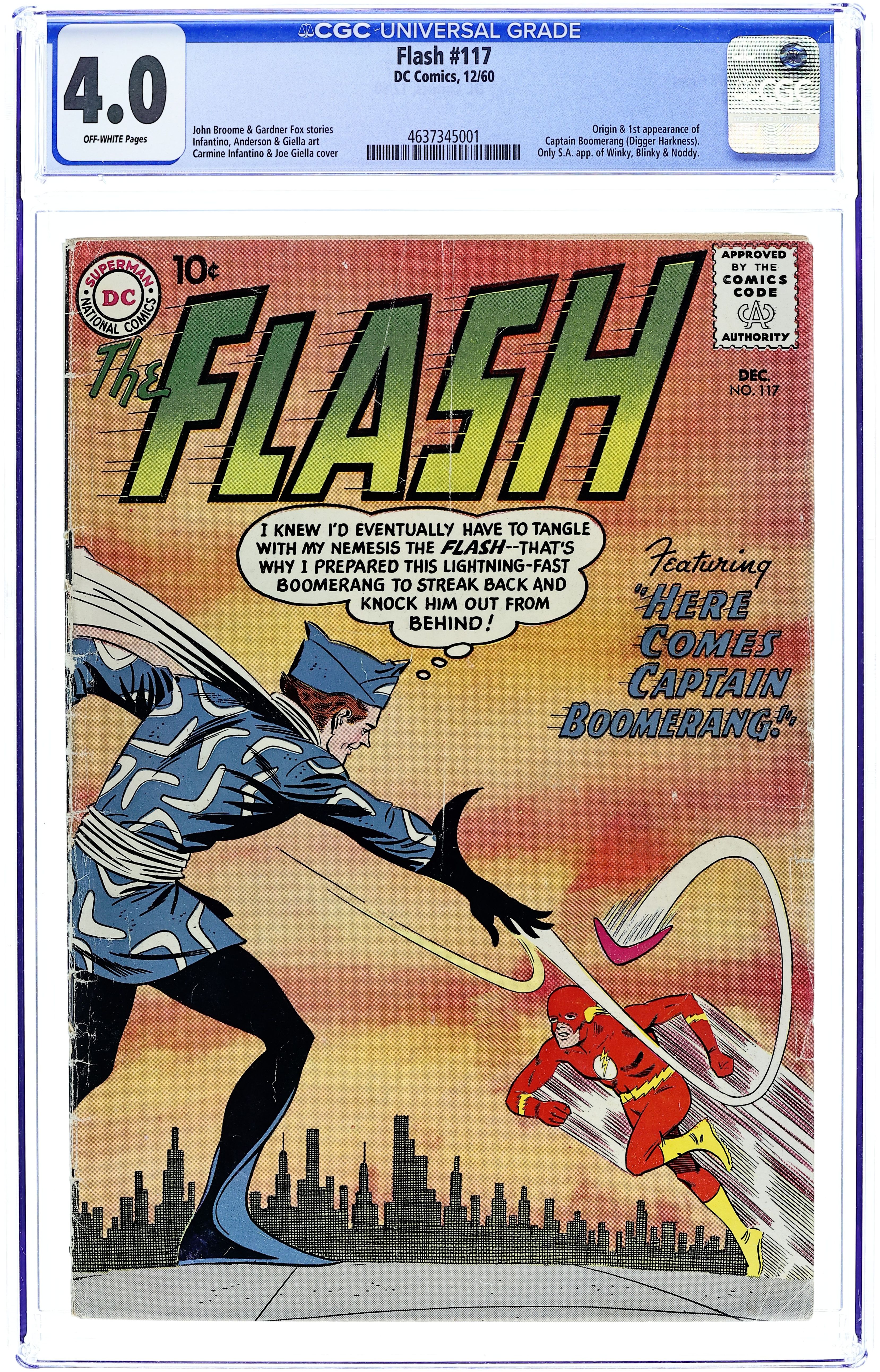 Cover pencils by Carmine Infantino, inks by Joe Giella. First appearance of Captain Boomerang in Here Comes Captain Boomerang!, script by John Broome, pencils by Carmine Infantino, inks by Murphy Anderson; W.W. Wiggins, the head of a game company, hires Digger Harkness to be his boomerang expert; Harkness becomes Captain Boomerang, commits crimes, and battles Flash. The Madcap Inventors of Central City!, script by Gardner Fox, pencils by Carmine Infantino, inks by Joe Giella; Winky, Blinky, and Noddy build a machine and start an inventing business. Letter to the editor from Fox himself! Ad for Giant Superman Annual. Comparative Speed Records fact page. Training Secrets Manual ad featuring Bob Cousy, Doak Walker, Carmen Basilio, and Kyle Rote. 36 Pages, Full Color. Cover price $0.10.