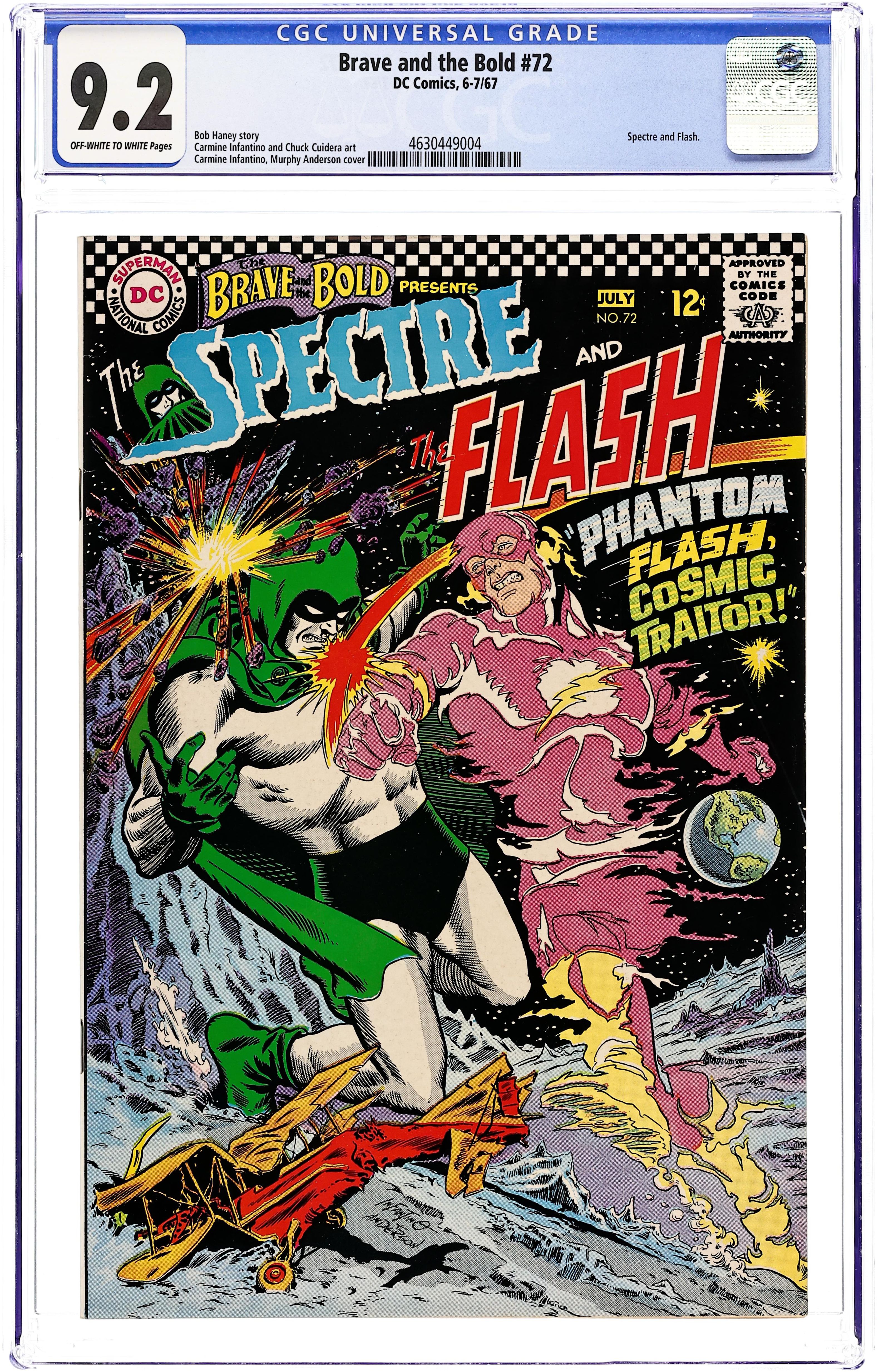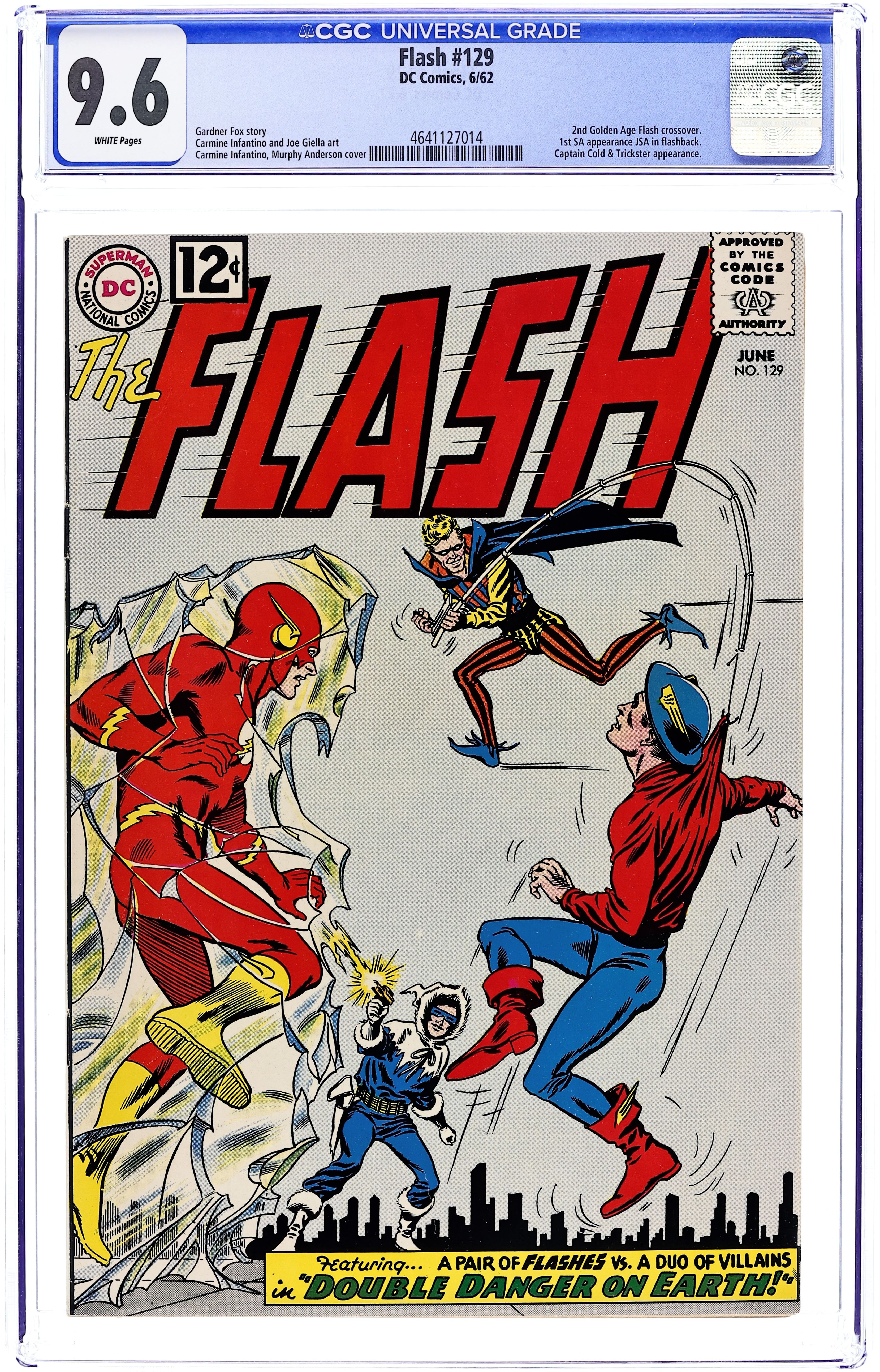 Cover pencils by Carmine Infantino, inks by Murphy Anderson. 2nd Silver Age appearance of Golden Age Flash from Earth-2 in Double Danger on Earth, script by Gardner Fox, pencils by Carmine Infantino, inks by Joe Giella; a comet strikes the sun, endangering Earth 2 with radiation; Barry and Iris attend a costume party on Earth 1, and the proceeds are stolen by Captain Cold; Jay and Barry team up; Cameo of the JSA vs. the Key. Ad for Atom #1. Palisades Amusement Park ad with Superman. Brave and the Bold ad with Hawkman. Letters to the editor from comics writer Don McGregor, publisher Bill Warren, and super fan Bernie Bubnis. 36 Pages, Full Color. Cover price $0.12.