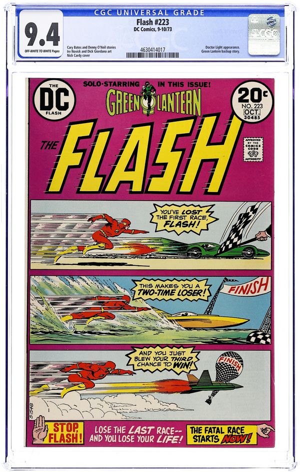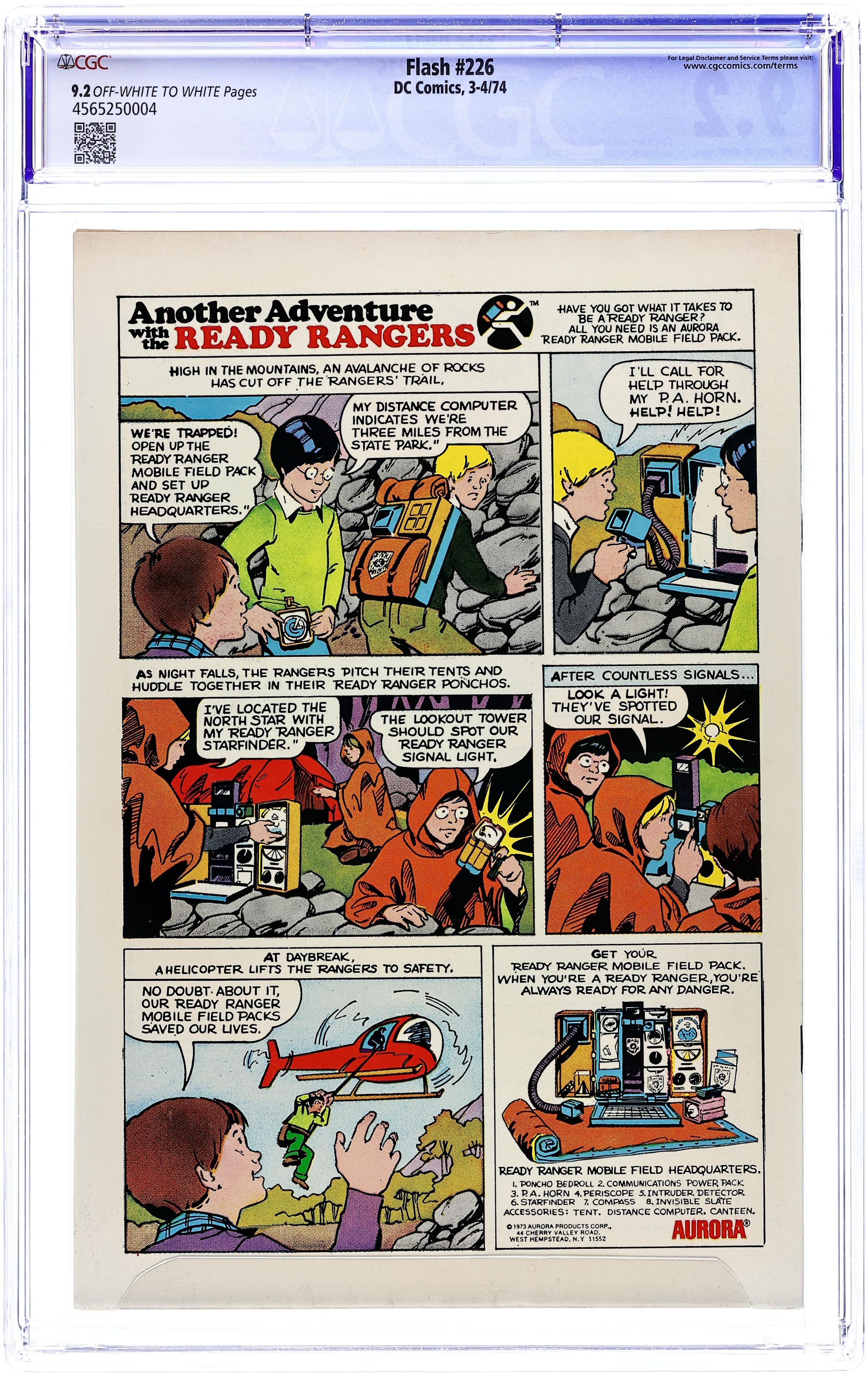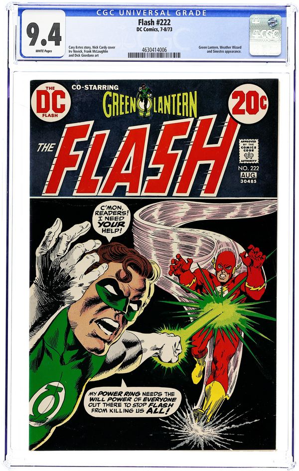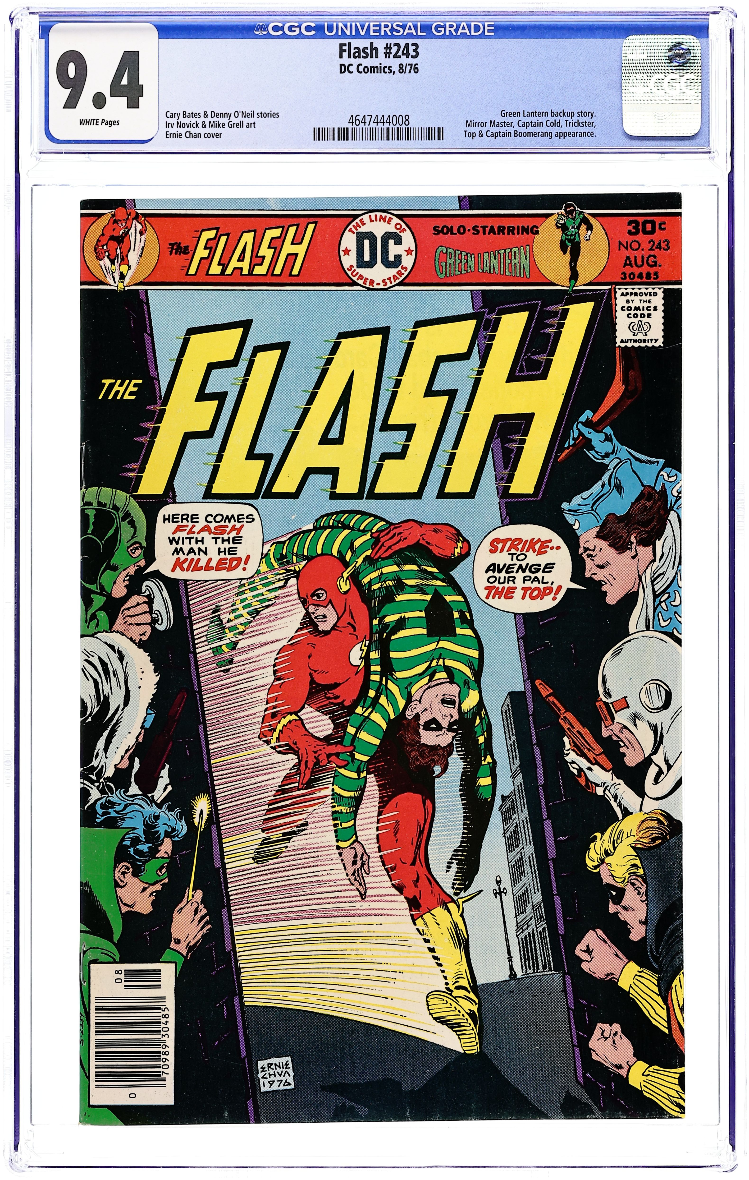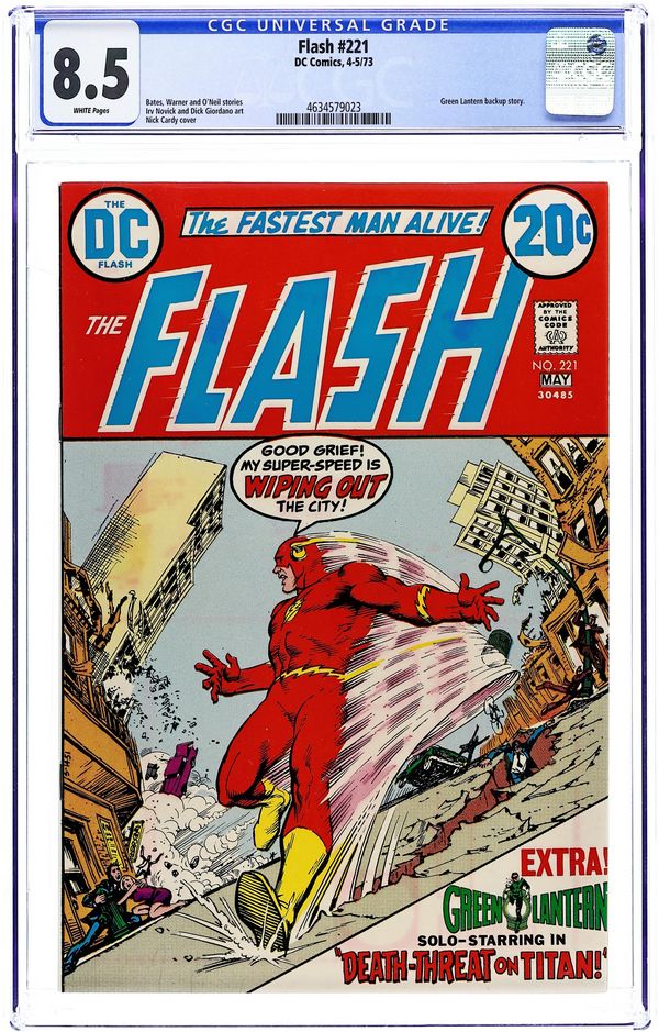 100-page giant. Cover art by Nick Cardy. Flash and the Golden Age Flash team up in the new story The Rag Doll Runs Wild!, script by Cary Bates, pencils by Irv Novick, inks by Frank McLaughlin; Barry Allen travels to Earth-2 when Joan Garrick contacts him and tells him that Jay is acting strangely; the two Flashes stop The Thinker and Rag Doll who are on a crime spree. The other stories in this 100-page special are reprints. Half a Green Lantern Is Better Than None!, script by John Broome, pencils by Gil Kane, inks by Sid Greene; Black Hand has created a device to store Green Lantern's ring energy and tries to use that energy to imprison Green Lantern in another dimension. Pinup including all three Flashes. Find-a-Word Flash puzzle. Secret of the Handicapped Boys! starring Kid Flash, script by John Broome, pencils by Carmine Infantino, inks by Joe Giella. Trivia questions on Flash history and foes. The Man Who Wore Ten Hats! starring Johnny Quick, script by Bill Finger, pencils by Mort Meskin, inks by George Roussos. The Secret City starring Jay Garrick, script by Robert Kanigher, pencils by Carmine Infantino, inks by Frank Giacoia. Girl From the Super-Fast Dimension! starring Barry Allen, script by Gardner Fox, pencils by Carmine Infantino, inks by Joe Giella. 100 Pages, Full Color. Cover price $0.60.