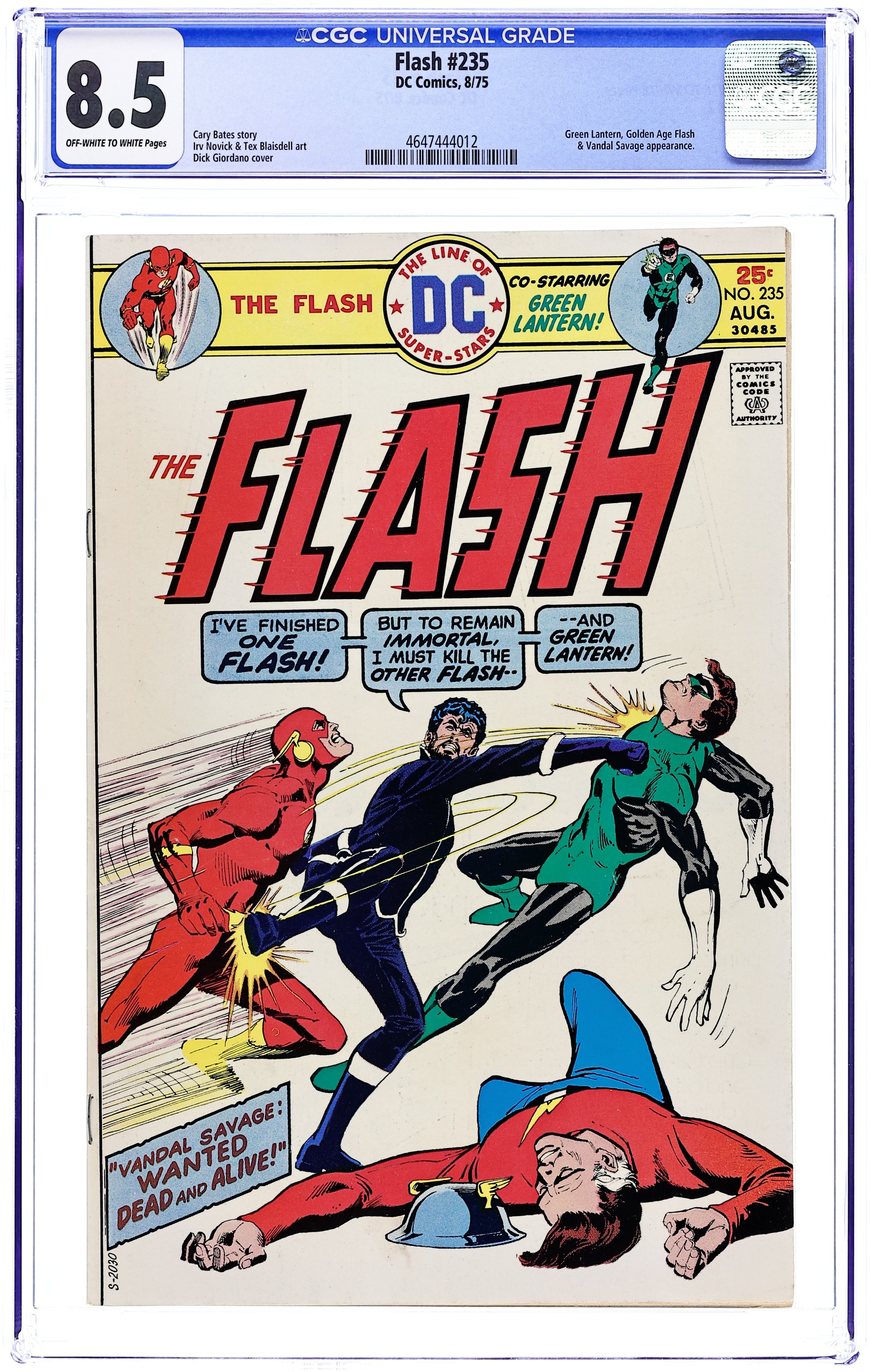 Cover art by Dick Giordano. Vandal Savage--Wanted Dead and Alive!, script by Cary Bates, pencils by Irv Novick, inks by Tex Blaisdell; Vandal Savage kidnaps Iris and Carol to try to force Flash and Green Lantern to do his wishes. House ad for tabloid Famous 1st Editon Flash 1 and Limited Collectors' Edition Batman. Hostess baseball cards ad. 36 Pages, Full Color. Cover price $0.25.