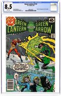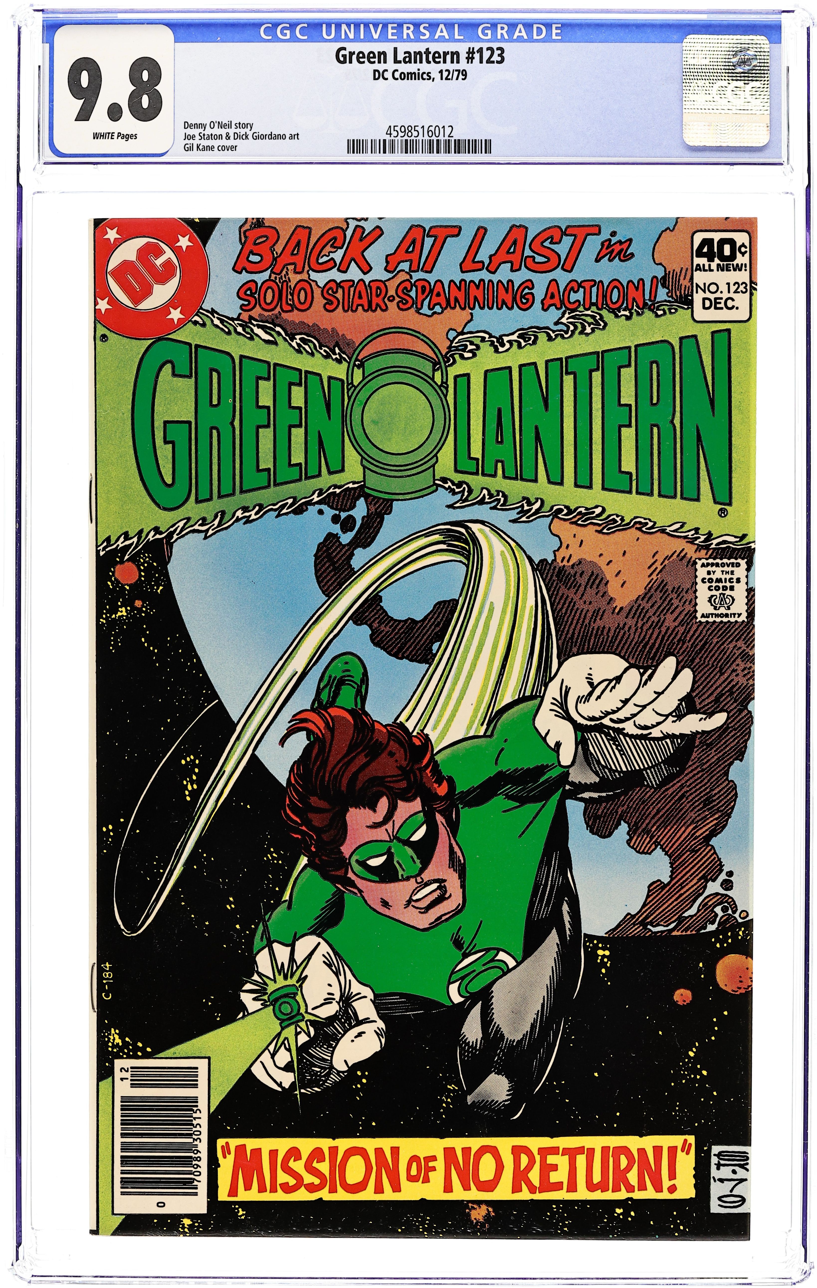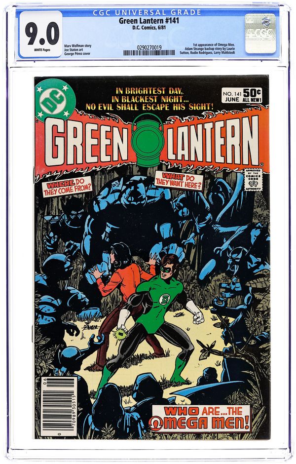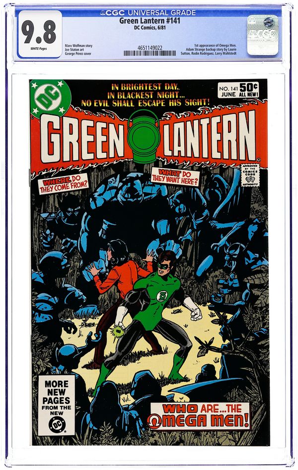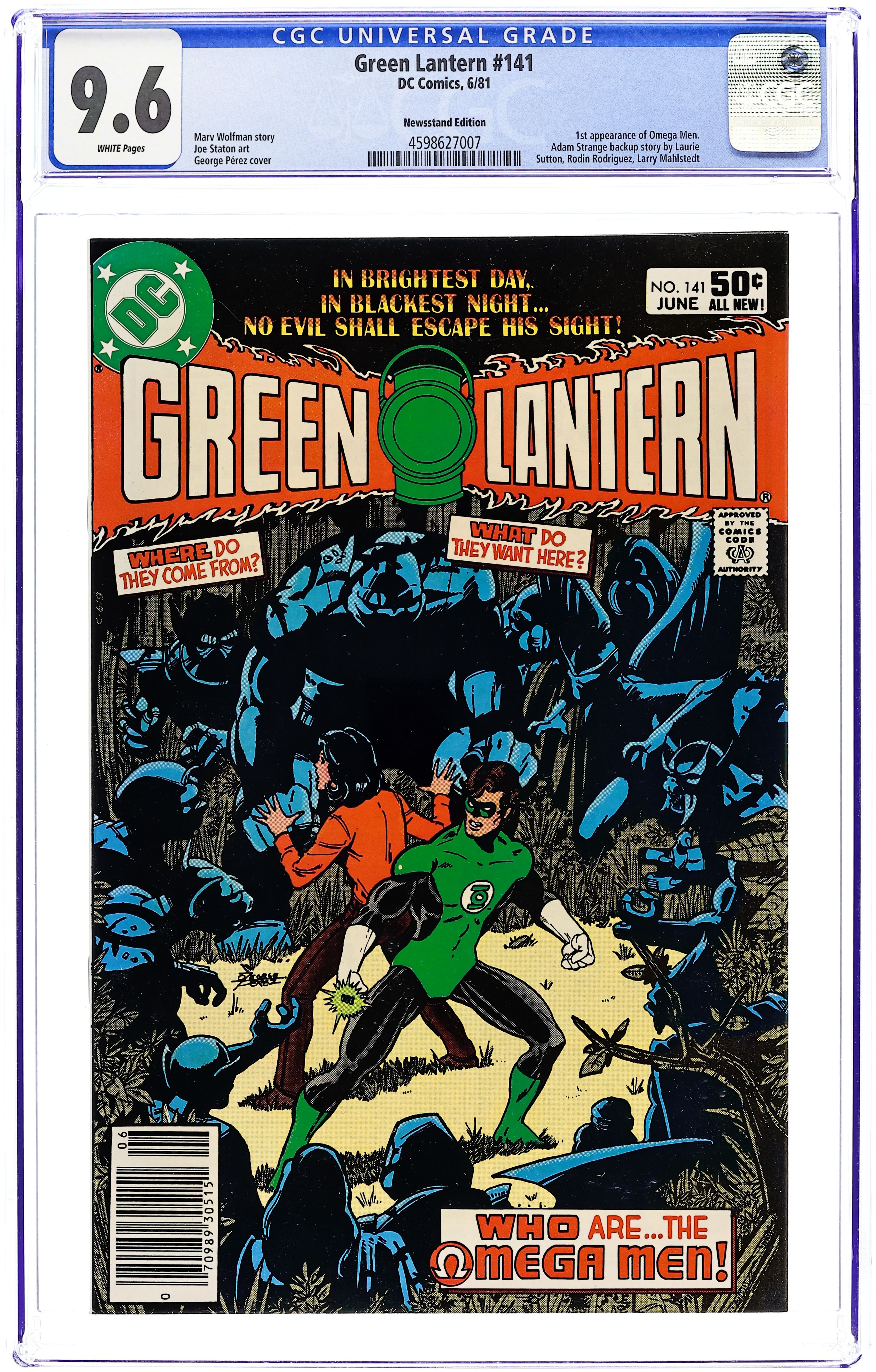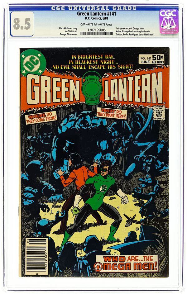 Newsstand Edition. 1st appearance of Omega Men. "The Lurkers in the Shadow." While vacationing in Canada, Green Lantern and Carol Ferris are captured by the Omega Men, who make their first appearance. Script by Marv Wolfman, art by Joe Staton. Cover by George Pérez. Cover price $0.50.