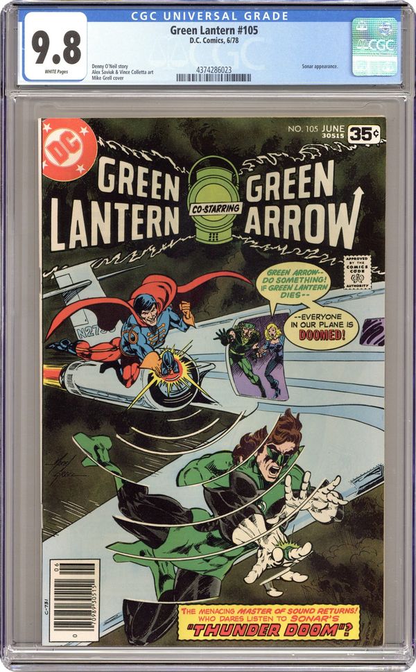 "Thunder Doom." Guest-starring Black Canary, Air Wave, & Ray Palmer (Atom). Sonar intends to disrupt a beauty pageant, and Green Lantern, Green Arrow, and Black Canary step in. The second Air Wave and Ray Palmer guest star. Script by Denny O'Neil, pencils by Alex Saviuk, inks by Vince Colletta. Cover by Mike Grell. Cover price $0.35.