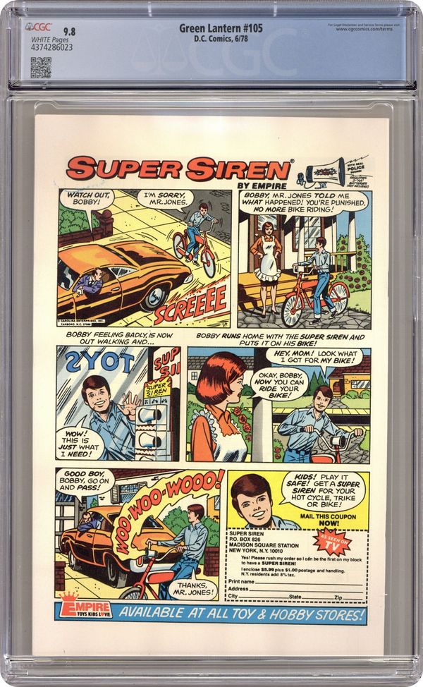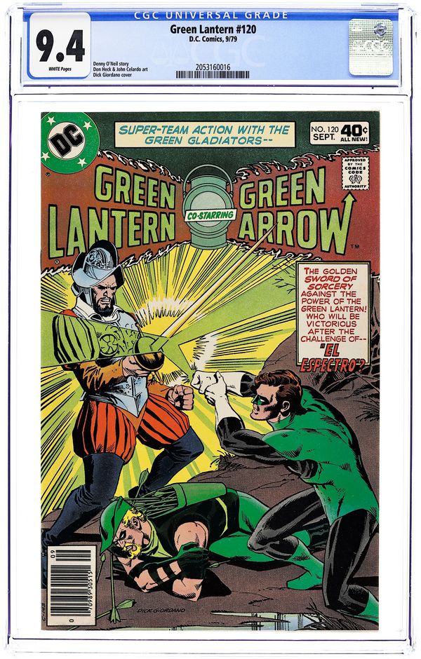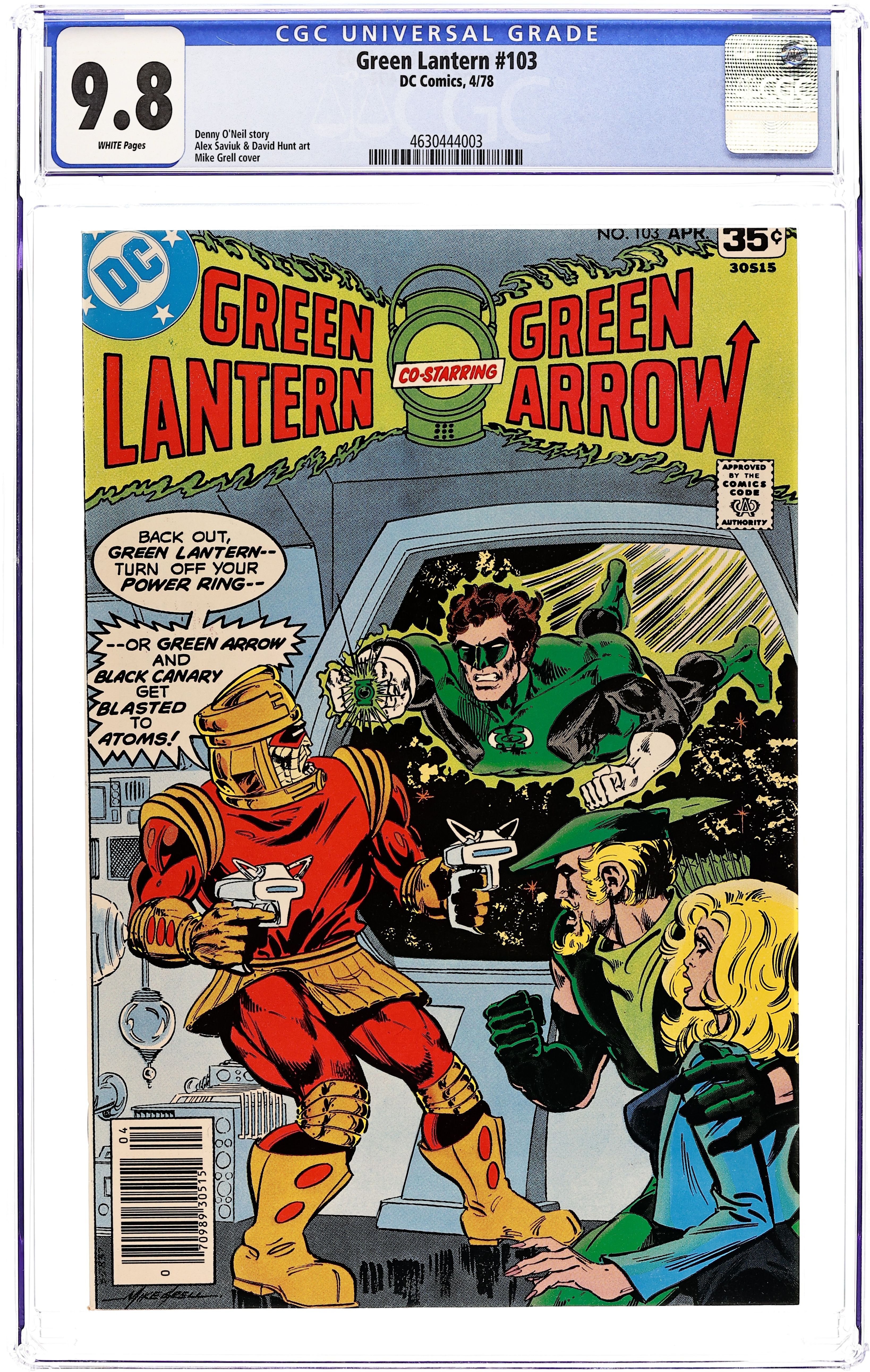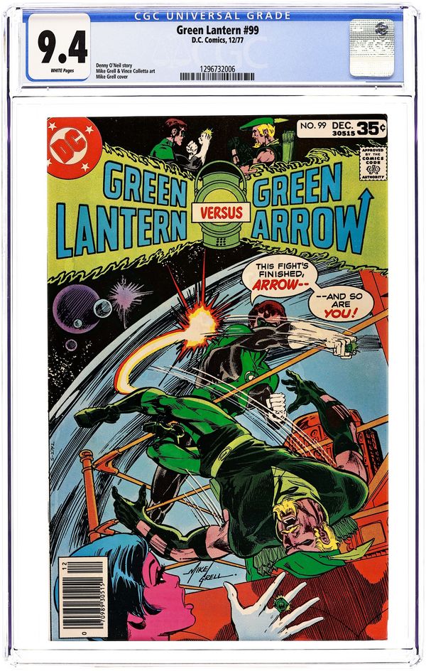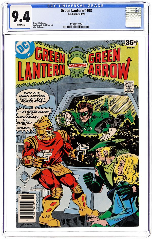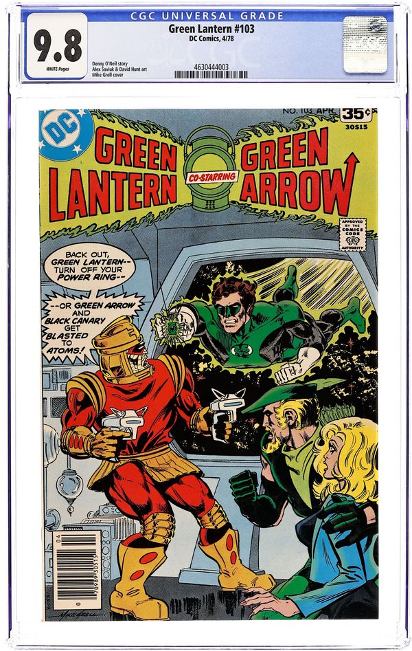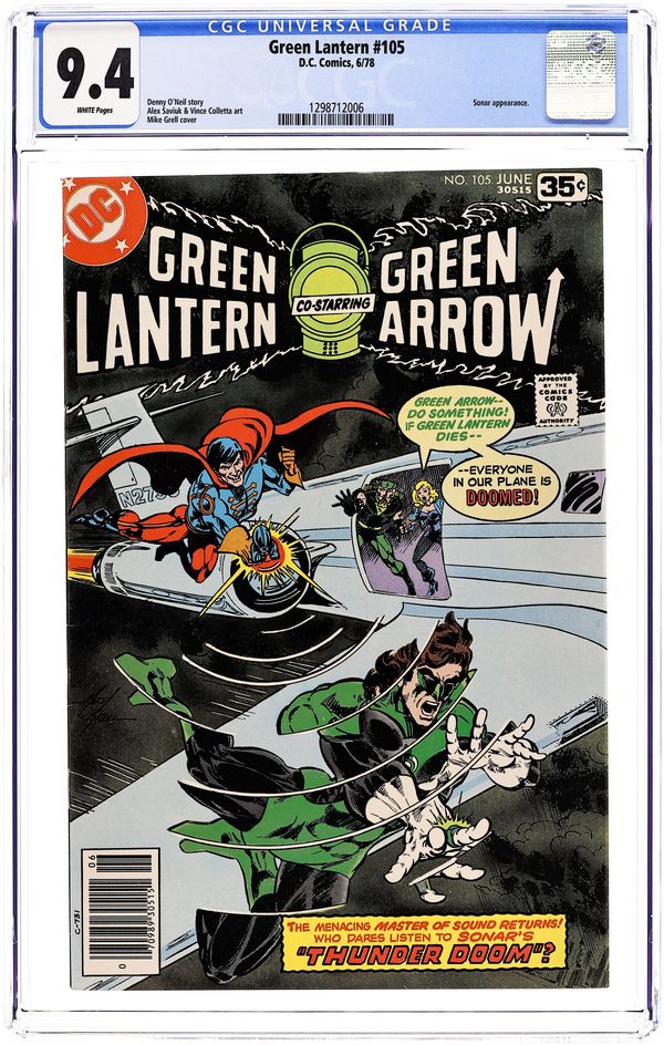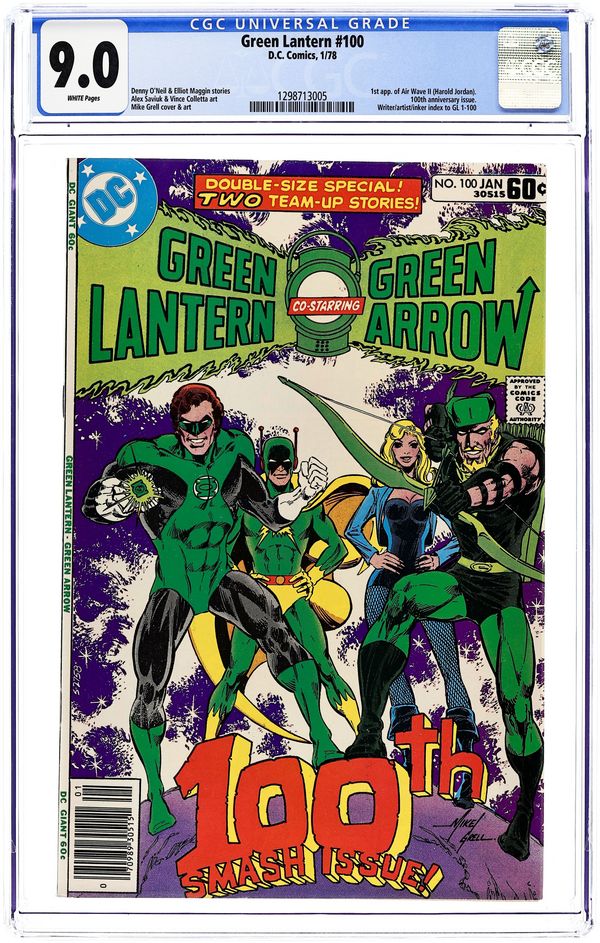 Giant-size 100th issue. "Rider of the Air Waves." Guest-starring Black Canary & Air Wave. Green Lantern and the new Air Wave take on Master-Tek, a technological terrorist. The story reveals that the original Air Wave was Hal Jordan's uncle, Larry Jordan. Script by Denny O'Neil, pencils by Alex Saviuk, inks by Vince Colletta. Cover by Mike Grell. Cover price $0.60.