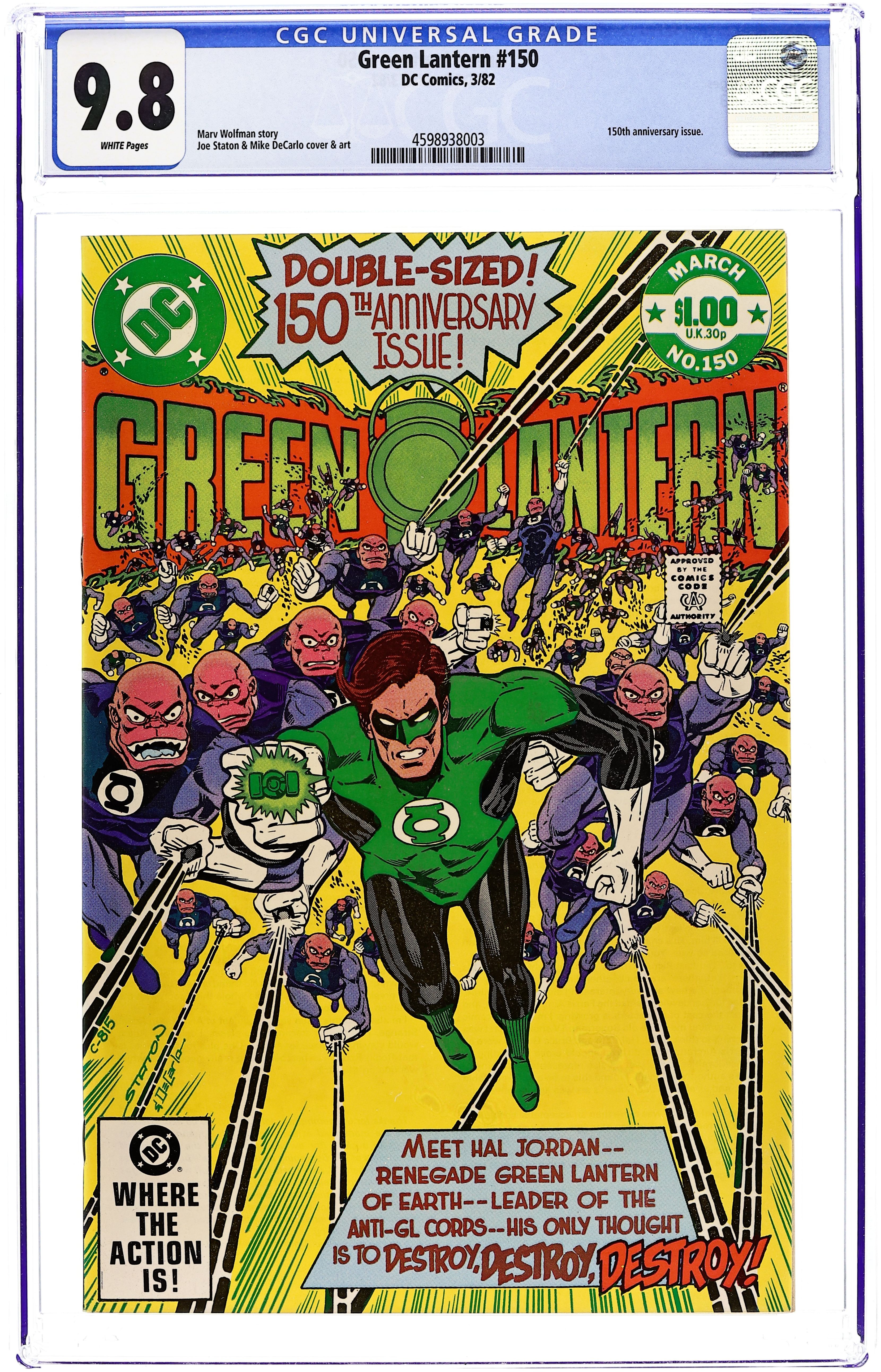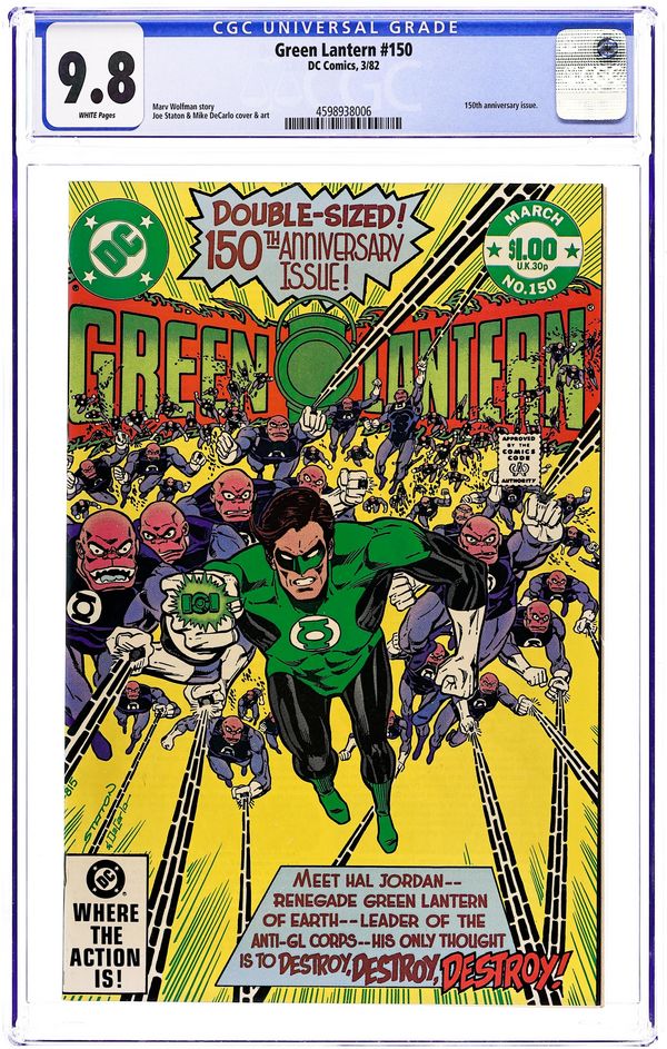 Double-Sized 52-page giant. 150th Anniversary Issue. "From Qward With Hate." The Guardians tell Green Lantern to leave Earth to serve other planets until he serves penance. The Qwardians, using St'nlli's power, make Hal Jordan serve their cause. Script by Marv Wolfman, pencils by Joe Staton, inks by Mike DeCarlo. "Meanwhile." Carl and Carol Ferris and their pals fight back against the Bloch brothers. Script by Wolfman, art by Staton. Cover by Staton and Mike DeCarlo. Cover price $1.00.