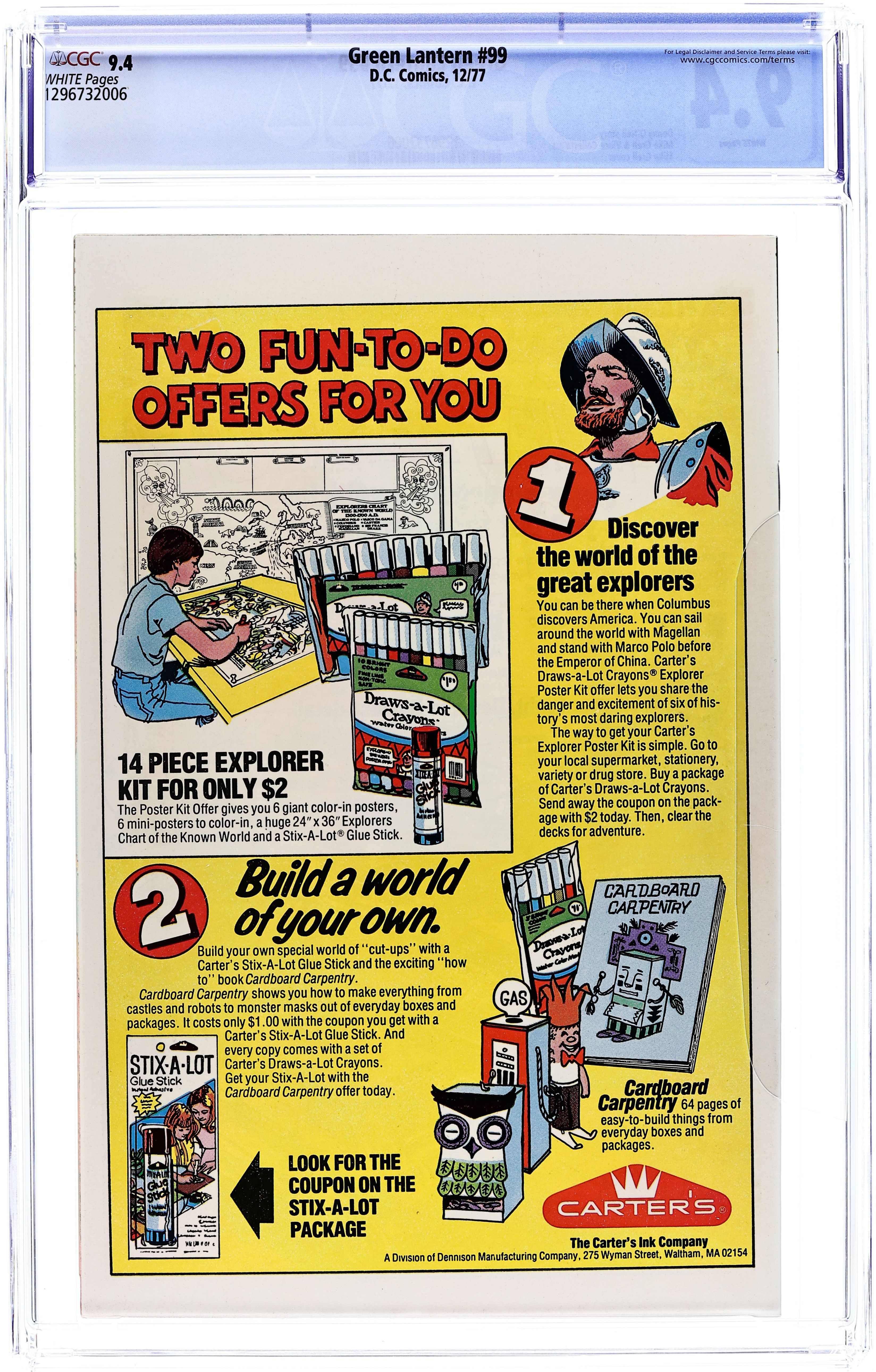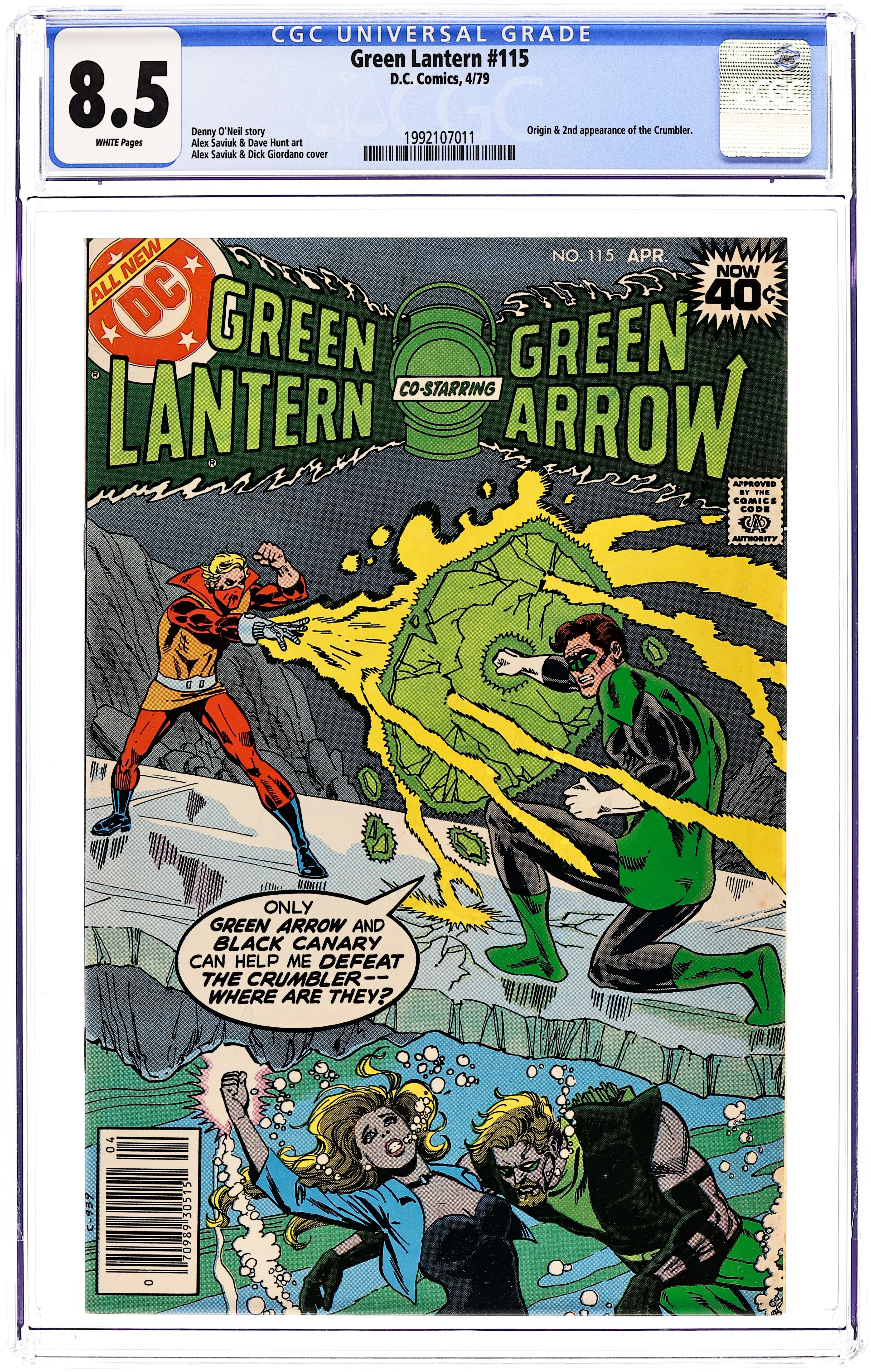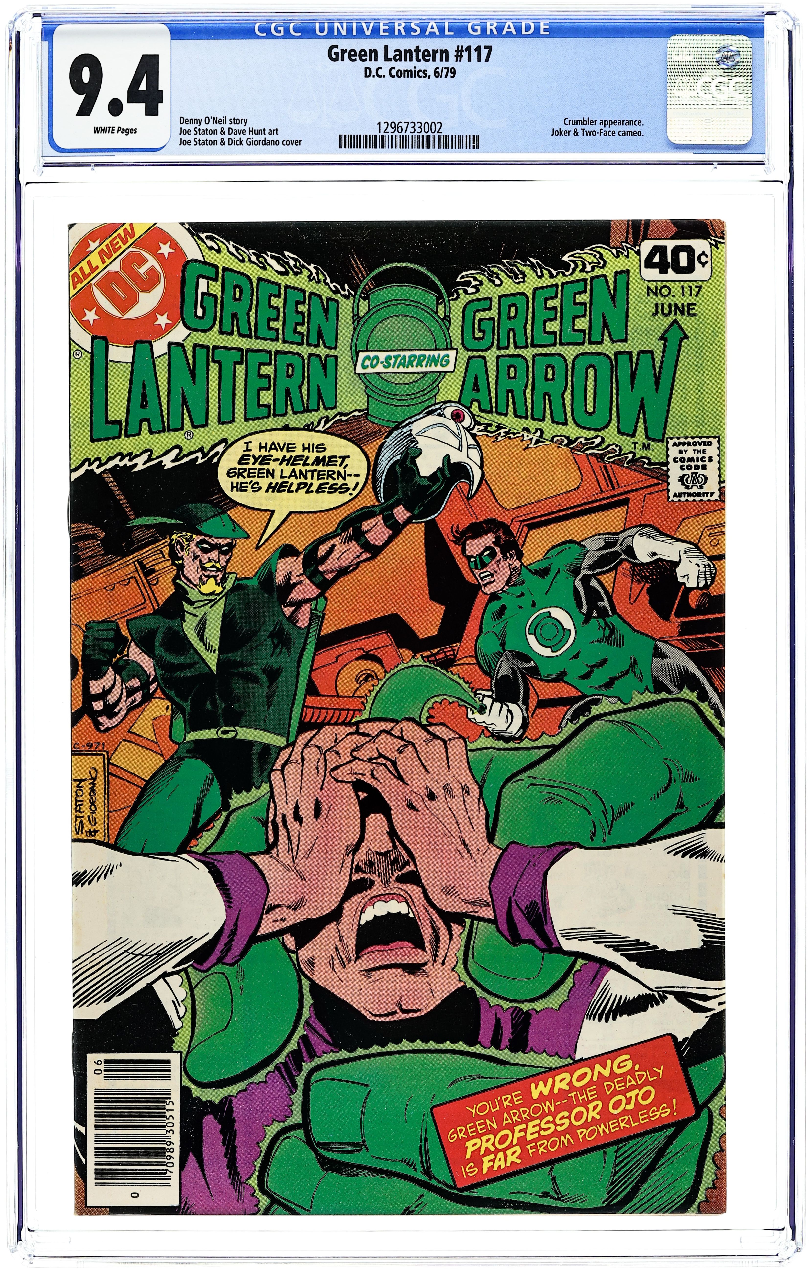 "The Green that Got Away." Green Lantern tells Carol and Pieface about the time Hector Hammond tried to mentally steal his power ring energy. Script by Denny O'Neil, pencils by Joe Staton and Dave Cockrum, inks by Dick Giordano and Bob Smith. Green Arrow stars in a one-page Hostess ad, "An Arrow in Time." Cover by Dick Giordano. Cover price $0.40.