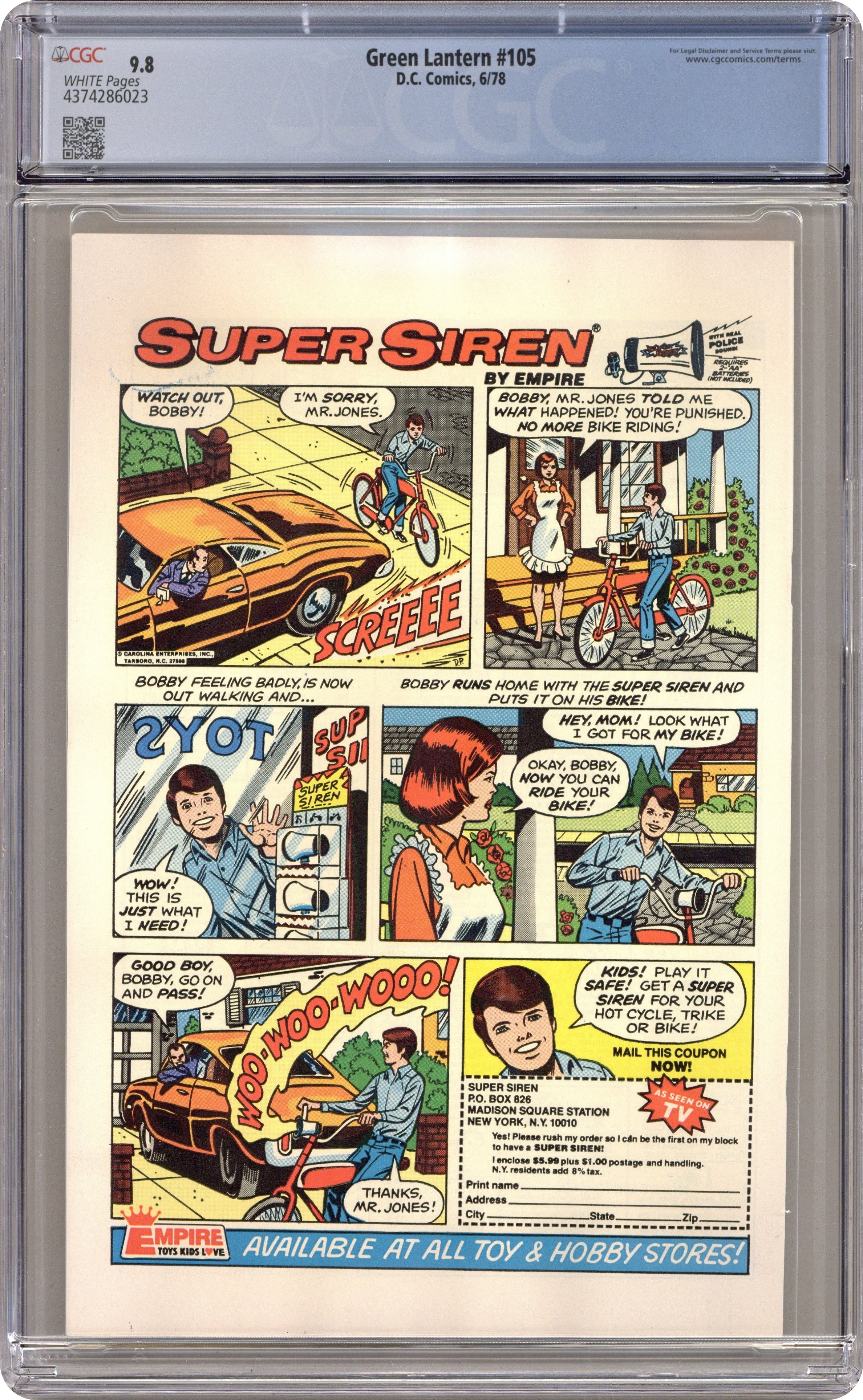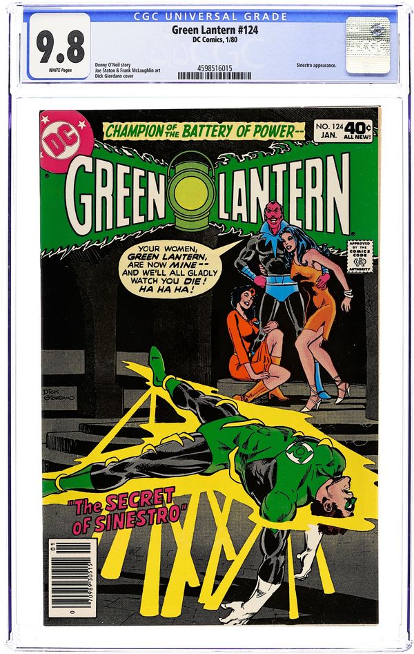 "The Secret of Sinestro." Green Lantern dissolves his partnership with Green Arrow and proceeds to Korugar to get help from Katma Tui in battling Sinestro. Script by Denny O'Neil, pencils by Joe Staton, inks by Frank McLaughlin. Superman stars in a one-page Hostess ad, "The Rescue." Cover by Dick Giordano. Cover price $0.40.