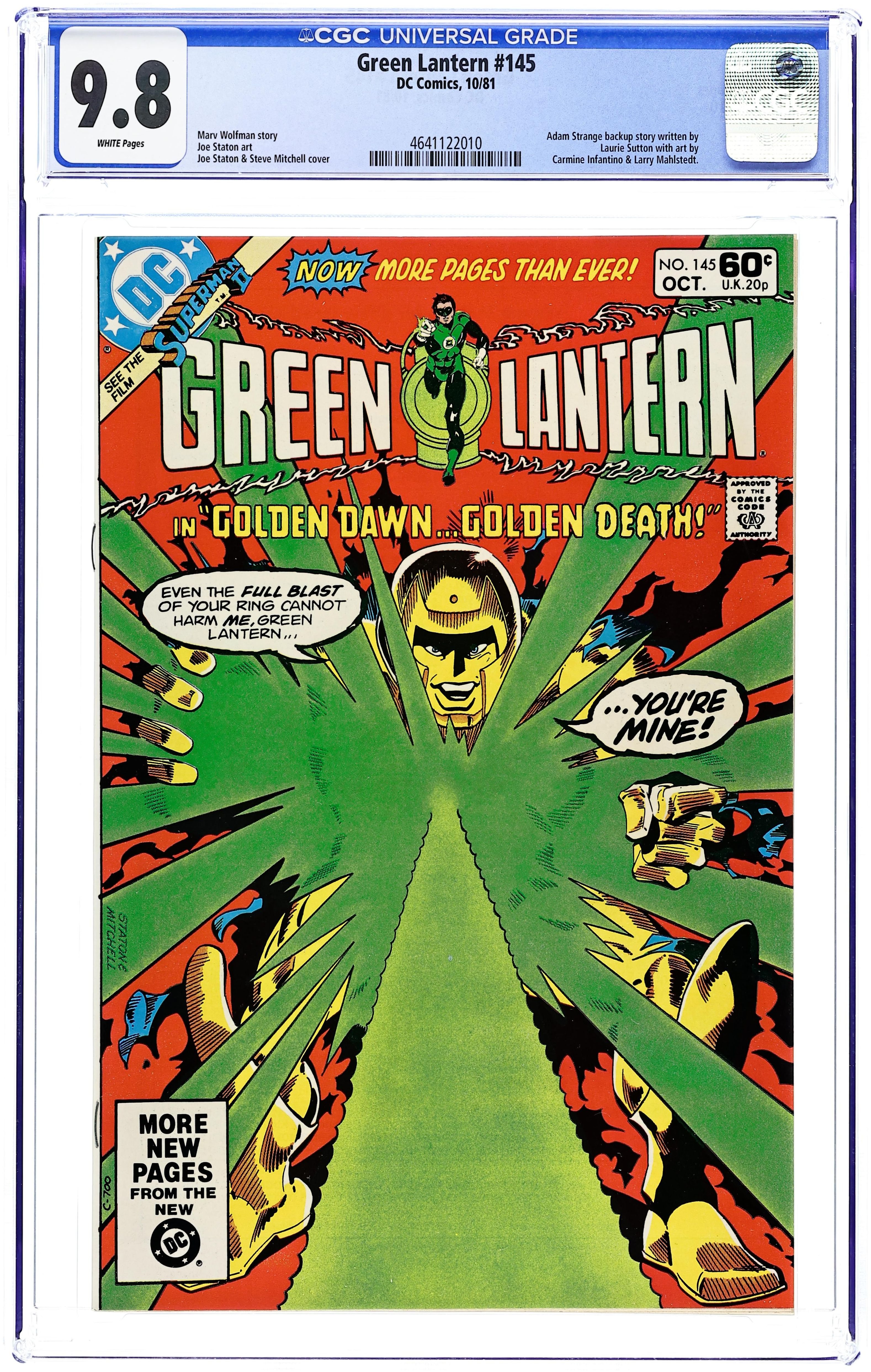 Direct Edition. "Golden Dawn, Golden Death." Green Lantern faces a new and improved Goldface while searching for the Tattooed Man's killer. Script by Marv Wolfman, art by Joe Staton. Cover by Joe Staton and Steve Mitchell. Note: The letters column includes the unused cover art for #145 by George Perez. The published cover by Staton & Mitchell was deemed to be more reflective of the story within the issue. Cover price $0.60.