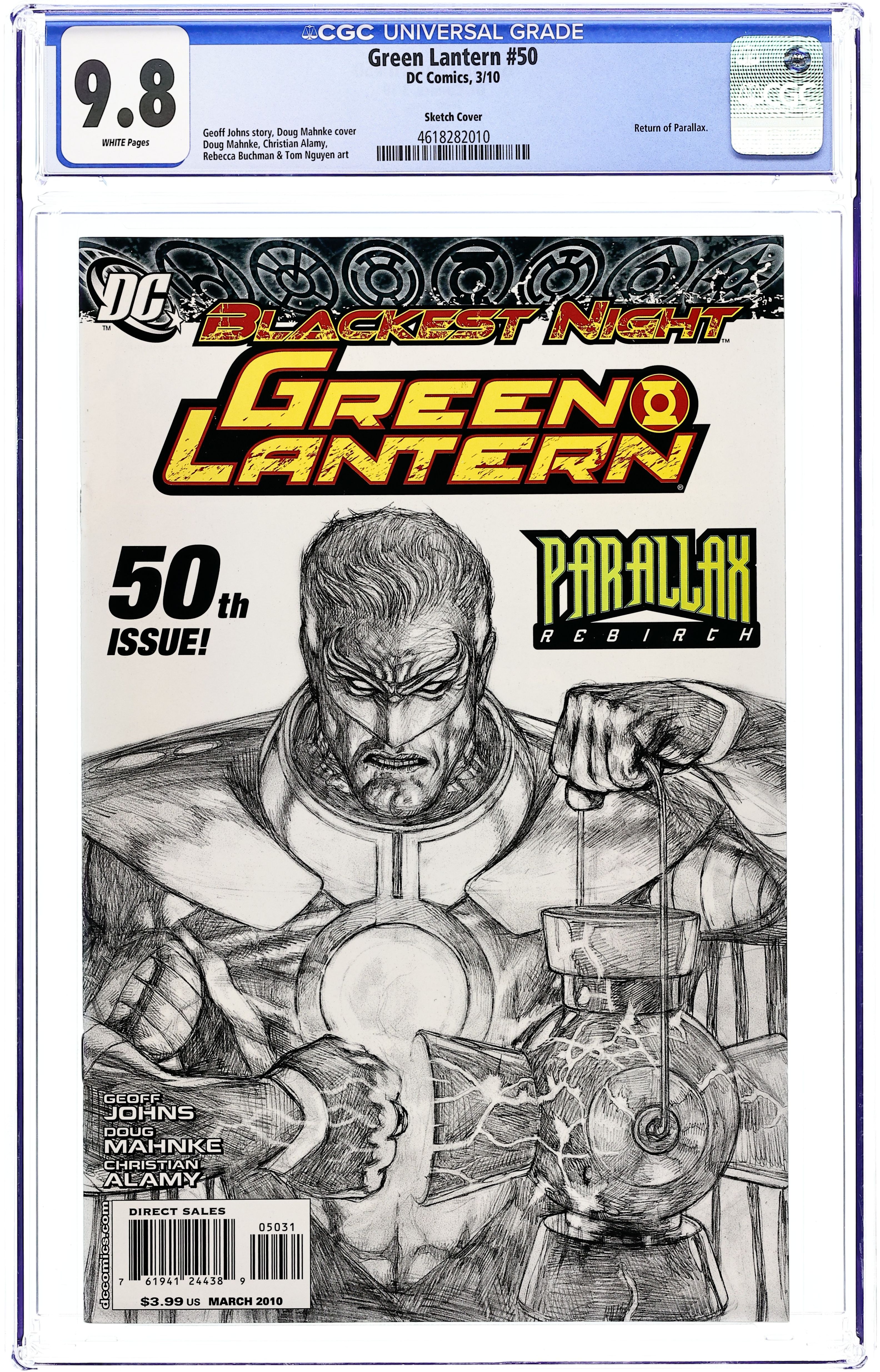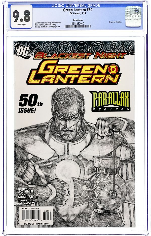 Limited 1 for 100 Sketch Variant cover by Doug Mahnke. Blackest Night tie-in - Parallax Rebirth: Part 1 - Written by Geoff Johns. Art by Doug Mahnke and Christian Alamy. BLACKEST NIGHT spreads with an oversized anniversary issue! Surrounded by friends and enemies, Hal Jordan goes into battle with a being he will never defeat - the Black Lantern Spectre! Can Saint Walker, Sinestro and the others put a stop to this bizarre Spectre rebirth? Plus, Atrocitus reveals a tie to a power that may make him the most unbeatable of all the Lanterns! 40 pages, full color. Cover price $2.99.