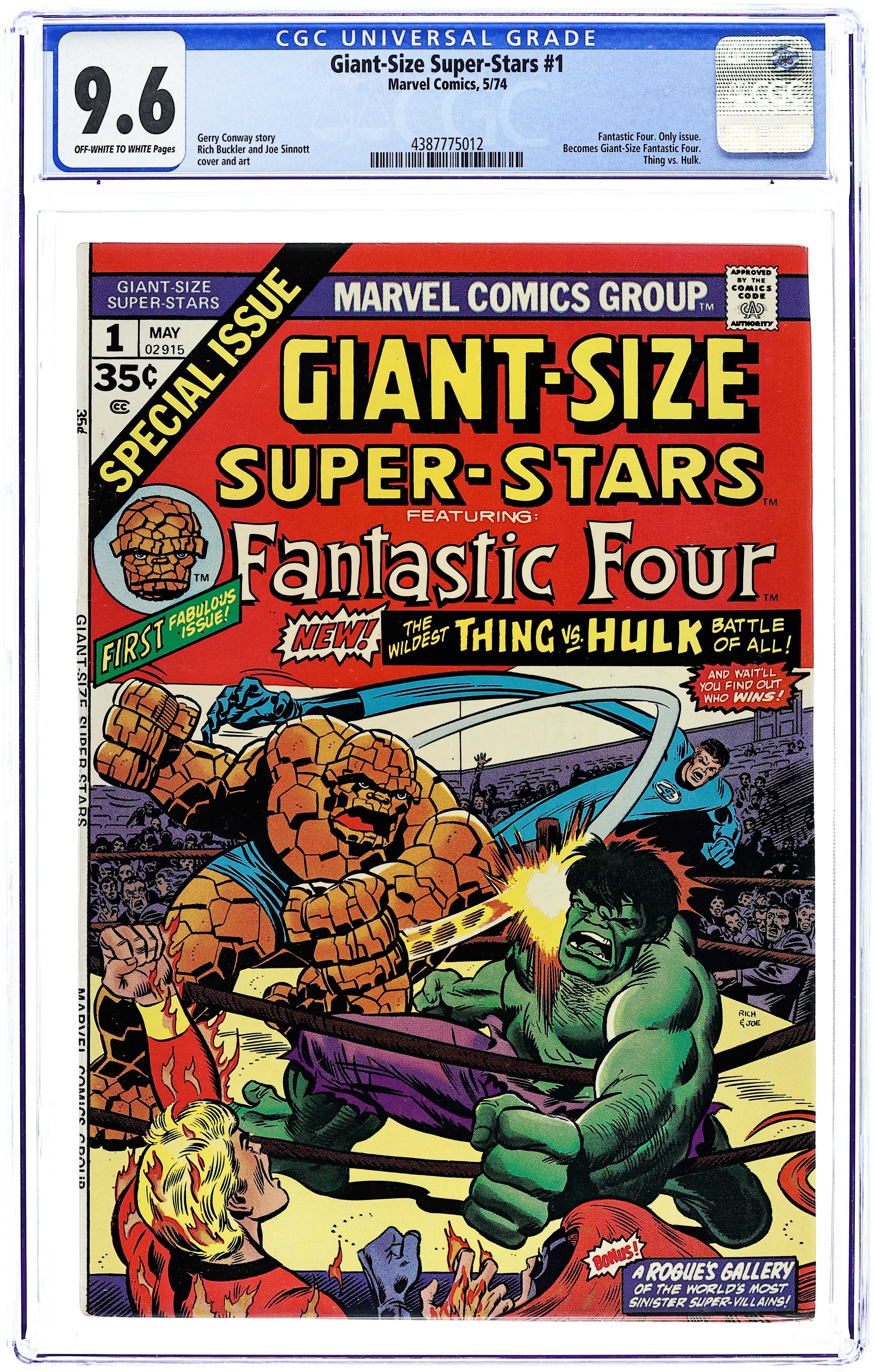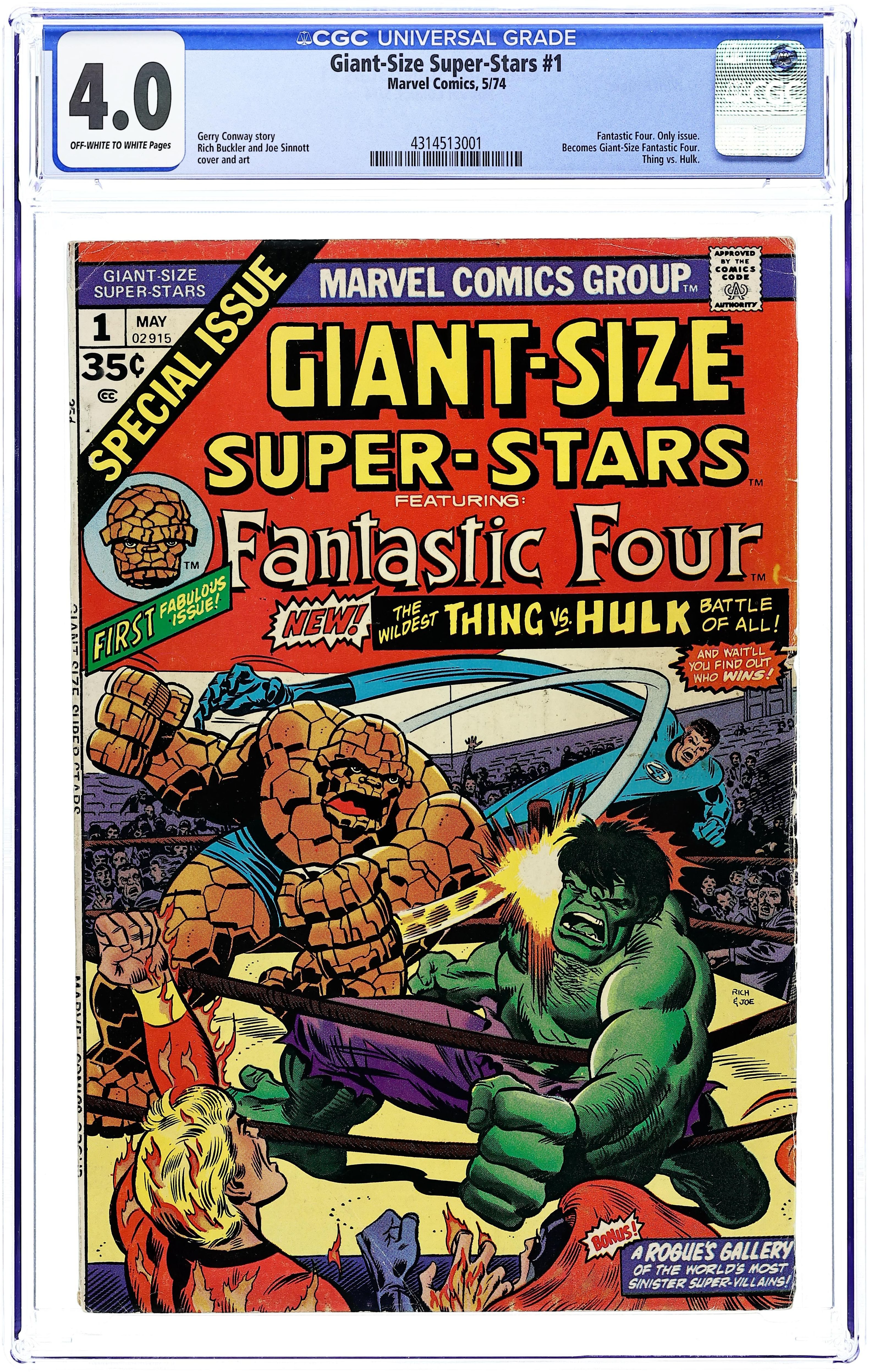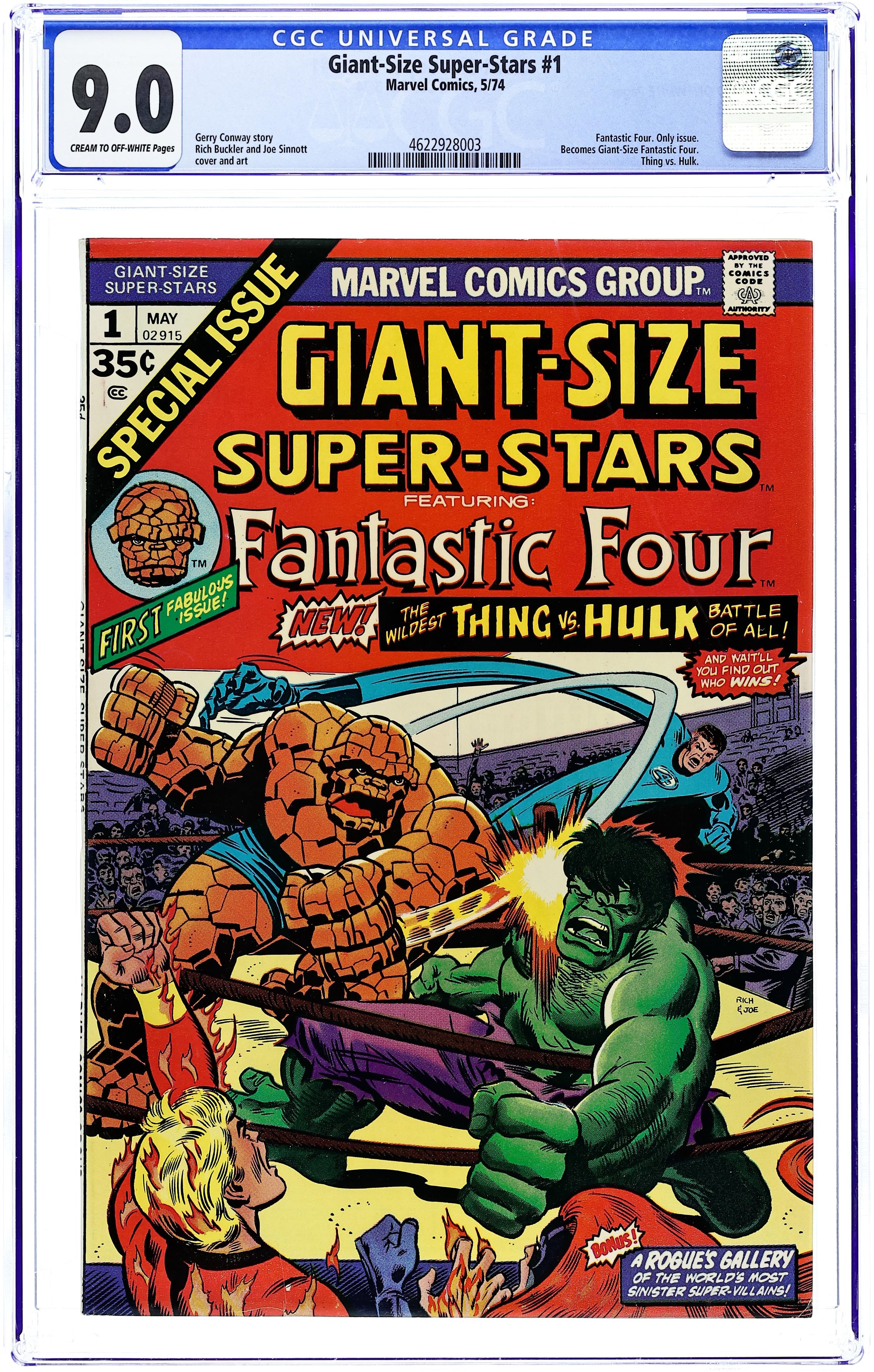 48-page giant. "The Mind of the Monster!" Guest-starring the Fantastic Four, the Hulk, and Thundra. Story by Gerry Conway. Art by Rick Buckler and Joe Sinnott. Bruce Banner visits the Baxter Building and devises a plan to turn the Thing back in Ben Grimm and also rid himself of the Hulk forever. But something goes wrong...and a brand new Hulk vs. Thing battle erupts! Fantastic Four members: Mr. Fantastic, Human Torch, Medusa, and the Thing. This issue includes a 4-page write-up from Roy Thomas describing the format and next story planned for the Giant-Size series. This issue also contains a 7-page rogues' gallery of famous FF foes. (Note: The title of the series changes to Giant-Size Fantastic Four for the next issue.) Cover price $0.35.