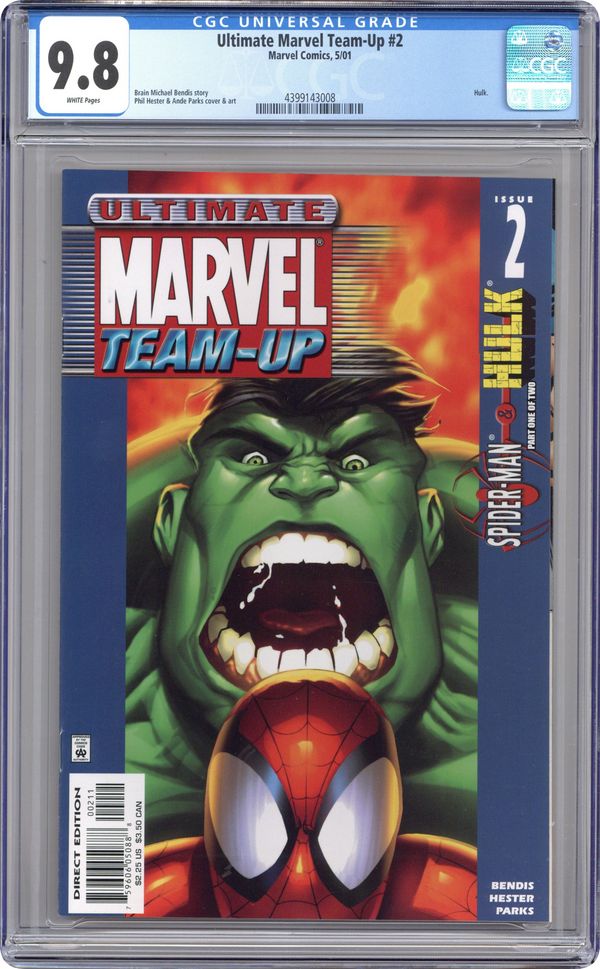 First appearance of the Hulk in the Ultimate universe! THE SCOOP: Spidey meets the ULTIMATE version of the walking engine of destruction known as the Hulk! THE STORY: Our spanking new Spider-Man has already encountered one green menace (of the Goblin kind) but nothing could prepare him for the car-throwing, street-smashing jade giant! It's mass mayhem as our fledgling hero desperately attempts to stop the city-wide rampage of the gamma-spawned beast! And did we mention that the U.S. Army is on the man-monster's case too? THE CREATORS: Written by Wizard's "Best Writer of 2000," Brian Michael Bendis with art by Green Arrow's Phil Hester! THE BUZZ: "I was always a fan of MARVEL TEAM-UP, so this new book has an immediate appeal to me. Add to that an excellent creative team and you've got me hooked. This should be great." -Roger Ash, Worlds of Westfield. THE FORMAT: 32 pages, with ads. Printed on that slick ULTIMATE paper and thick cover! Cover price $2.25.