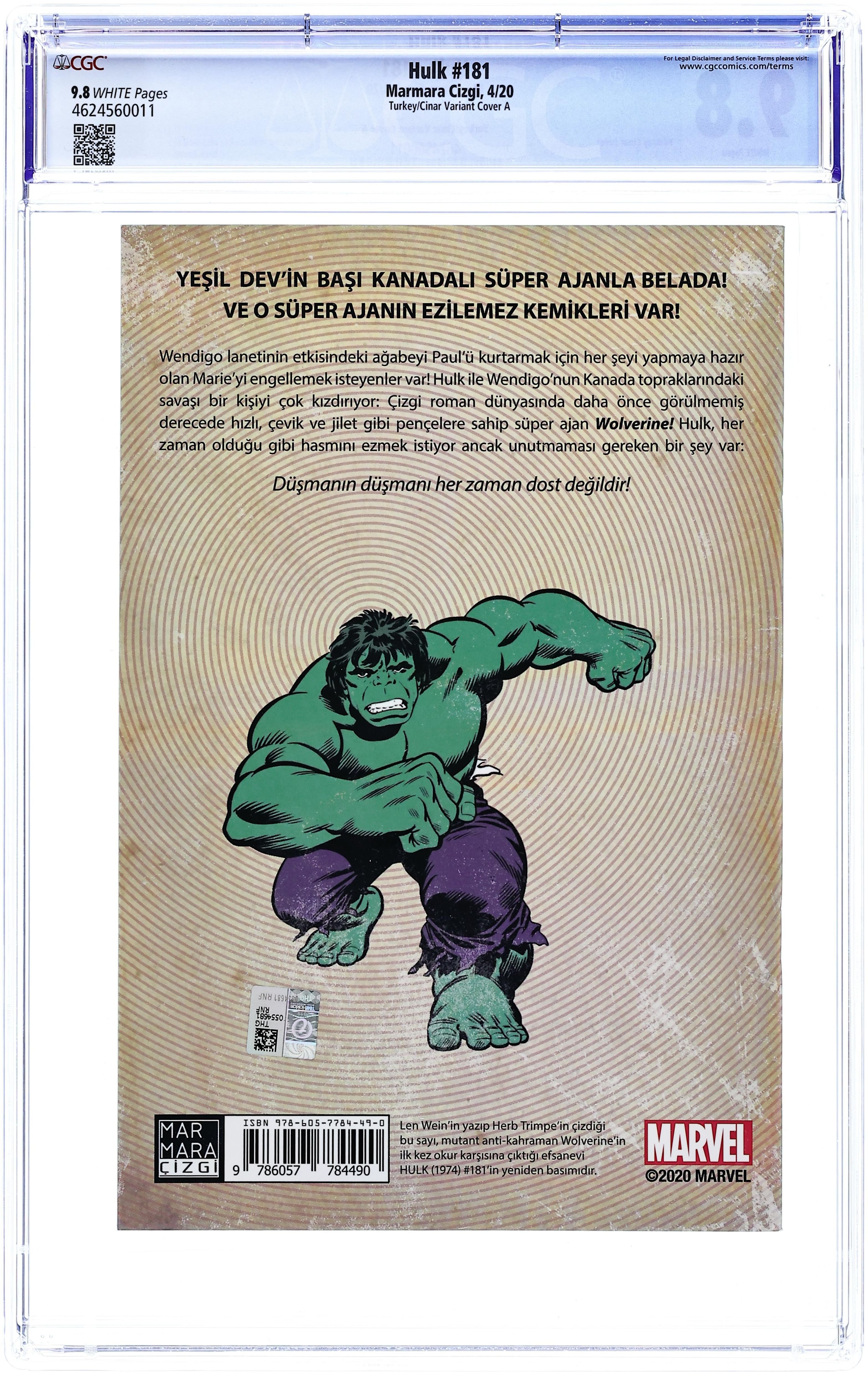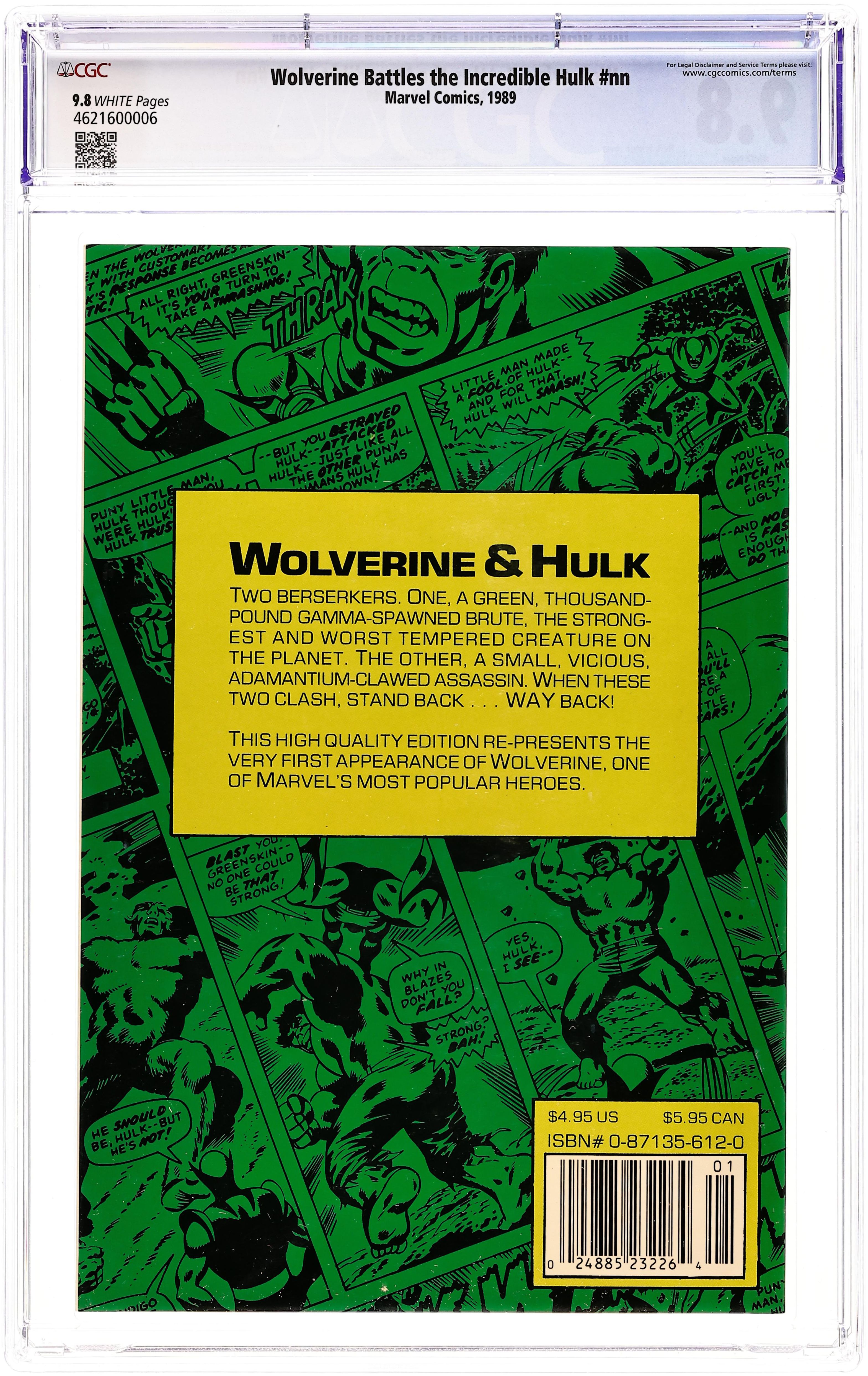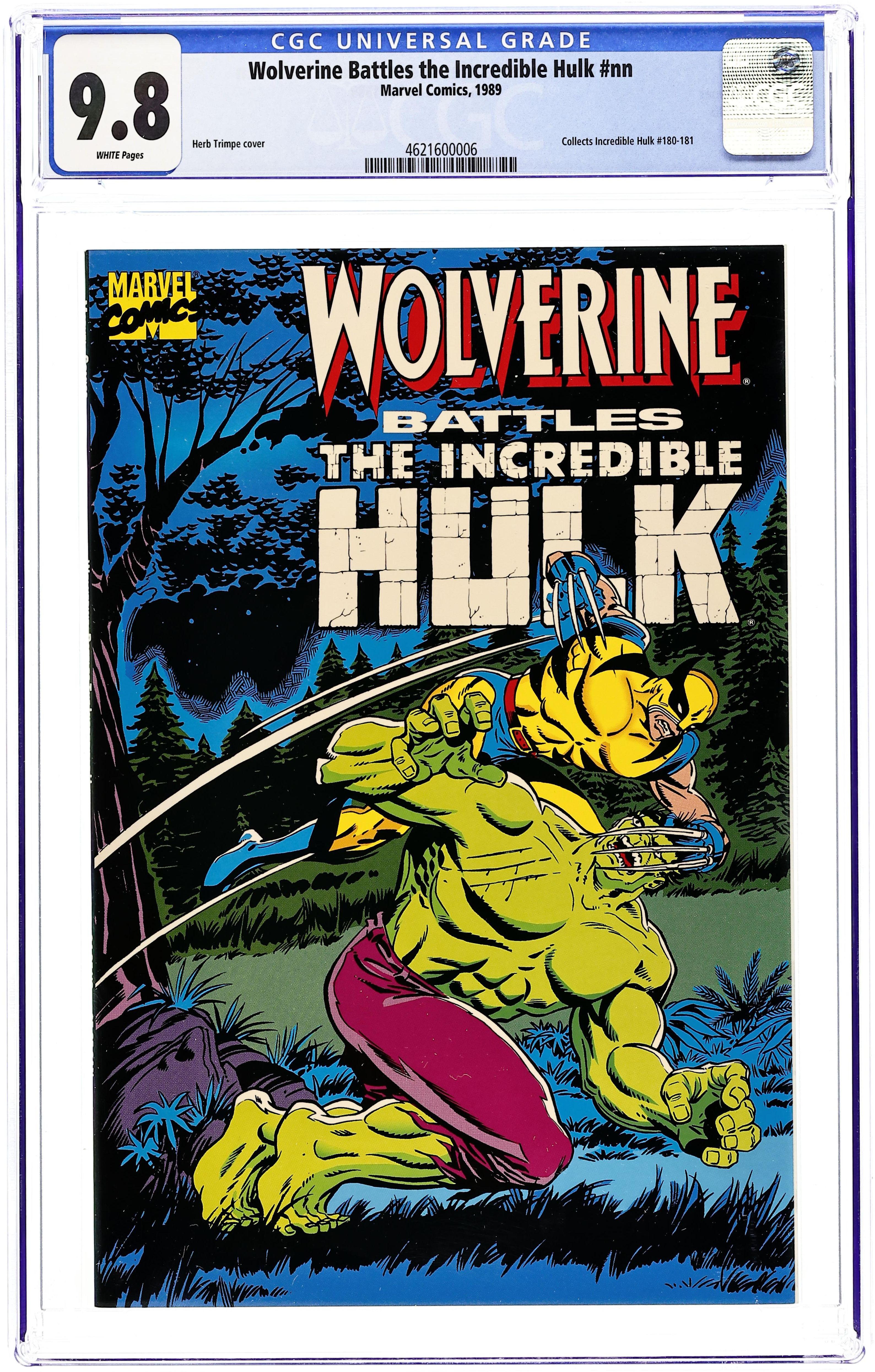 1ST PRINTING; Reprints Incredible Hulk 180-181, the first appearance of Wolverine. Cover art by Herb Trimpe. And The Wind Howls...Wendigo!, script by Len Wein, pencils by Herb Trimpe, inks by Jack Abel; Hulk is in Canada looking for some peace and quiet when he is mysteriously drawn to a cave inhabited by the sister of the man who became the Wendigo; Marie and Georges plan on transferring the power of the Wendigo to the Hulk, thus restoring Paul Cartier to his normal life; Marie's magic isn't strong enough, however, and just as Wendigo shows up, the Hulk wakes up from his magical slumber and the two battle. And Now...The Wolverine, script by Len Wein, pencils by Herb Trimpe, inks by Jack Abel; Canadian super-agent Wolverine teams up with the Hulk to battle Wendigo; Once the monster is felled, however, Wolvie turns on the Hulk and the two battle. At The Sign Of The Lion starring Wolverine, Hercules, and Sibyl, script by Mary Jo Duffy, pencils by Ken Landgraf, inks by George Perez. Wolverine: The Evolution of a Character article by Peter Sanderson, pencils by Paul Smith, John Romita, John Byrne, Frank Miller, and John Romita Jr., inks by Joe Rubinstein, Terry Austin, and Dan Green; Text piece with clip art discussing the creation and evolution of the Wolverine character. Wolverine/Hulk pinup, pencils by Herb Trimpe, inks by Jack Abel. 52 pgs., full color. Cover price $4.95.