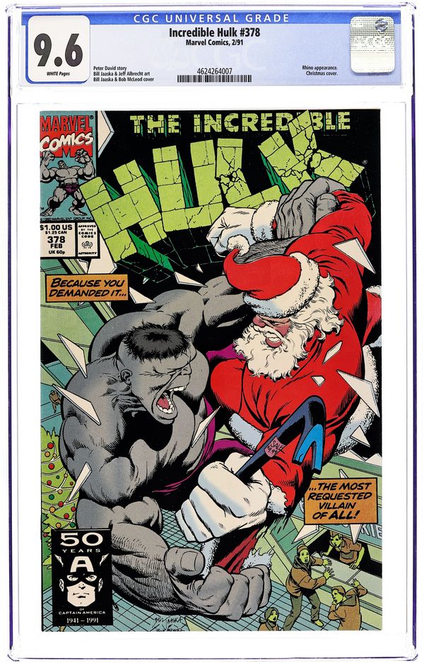 Christmas story. "Rhino Plastered." Story by Peter David. Art by Bill Jaaska and Jeff Albrecht. All during the grey Hulk run readers demanded the return of a certain villain. This issue delivers on that wish. The Incredible Hulk vs. Santa Claus? Not really but what on Earth could possibly convince the Hulk and Rhino to stop fighting long enough to play Santa and Santa's helper for the boys and girls? You have to read it to believe it. 36 pages. Cover price $1.00.
