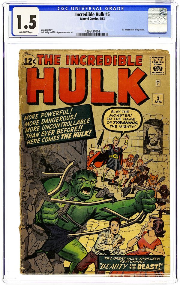 Cover pencils by Jack Kirby, inks by Dick Ayers. "Beauty and the Beast!," script by Stan Lee, pencils by Jack Kirby, inks by Dick Ayers; Underground overlord Tyrannus kidnaps Betty and lures the Hulk into his subterranean kingdom, forcing the Hulk to do his bidding to keep Betty safe. "The Hordes of General Fang!," script by Stan Lee, pencils by Jack Kirby, inks by Dick Ayers; The Hulk thwarts a would-be Genghis Khan conqueror named General Fang from taking over the Asian province of Llhasa, and he only has to dress up as the Abominable Snowman once to do it. 36 pgs., full color. $0.12. Cover price $0.12.