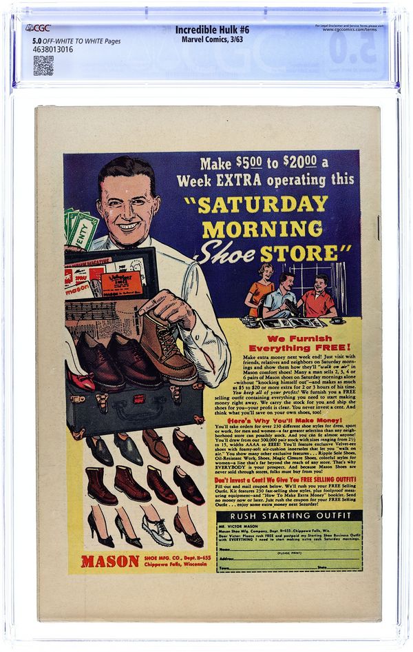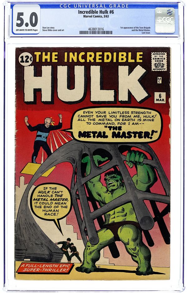 Cover by Steve Ditko. Introduction of the Teen Brigade in "The Incredible Hulk vs The Metal Master!," script by Stan Lee, art by Steve Ditko; Finding his transformations more and more difficult using his gamma ray machine, the Hulk with Banner's brain also finds that he has Banner's features when he zaps himself to face the alien invading Metal Master and his head does not transform; The power of the Metal Master is too much for the Hulk and he is captured by Ross. Rick forms the Teen Brigade; Hulk breaks free of Ross's bunker and then pulls off one of the boldest victories against one of the most powerful aliens ever seen. 36 pgs., full color. The Hulk's solo adventures continue in the pages of Tales to Astonish (1959-1968 1st Series) #59. Cover price $0.12.