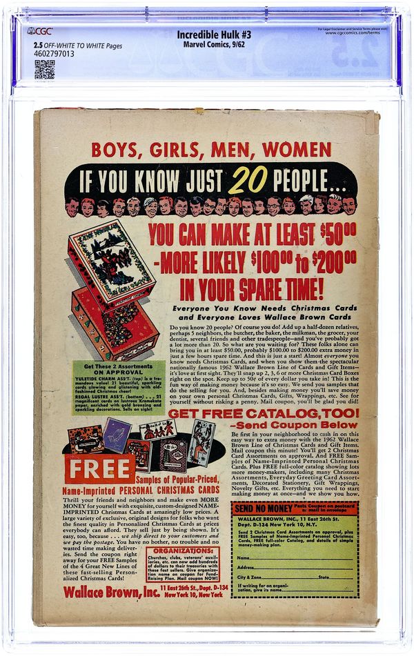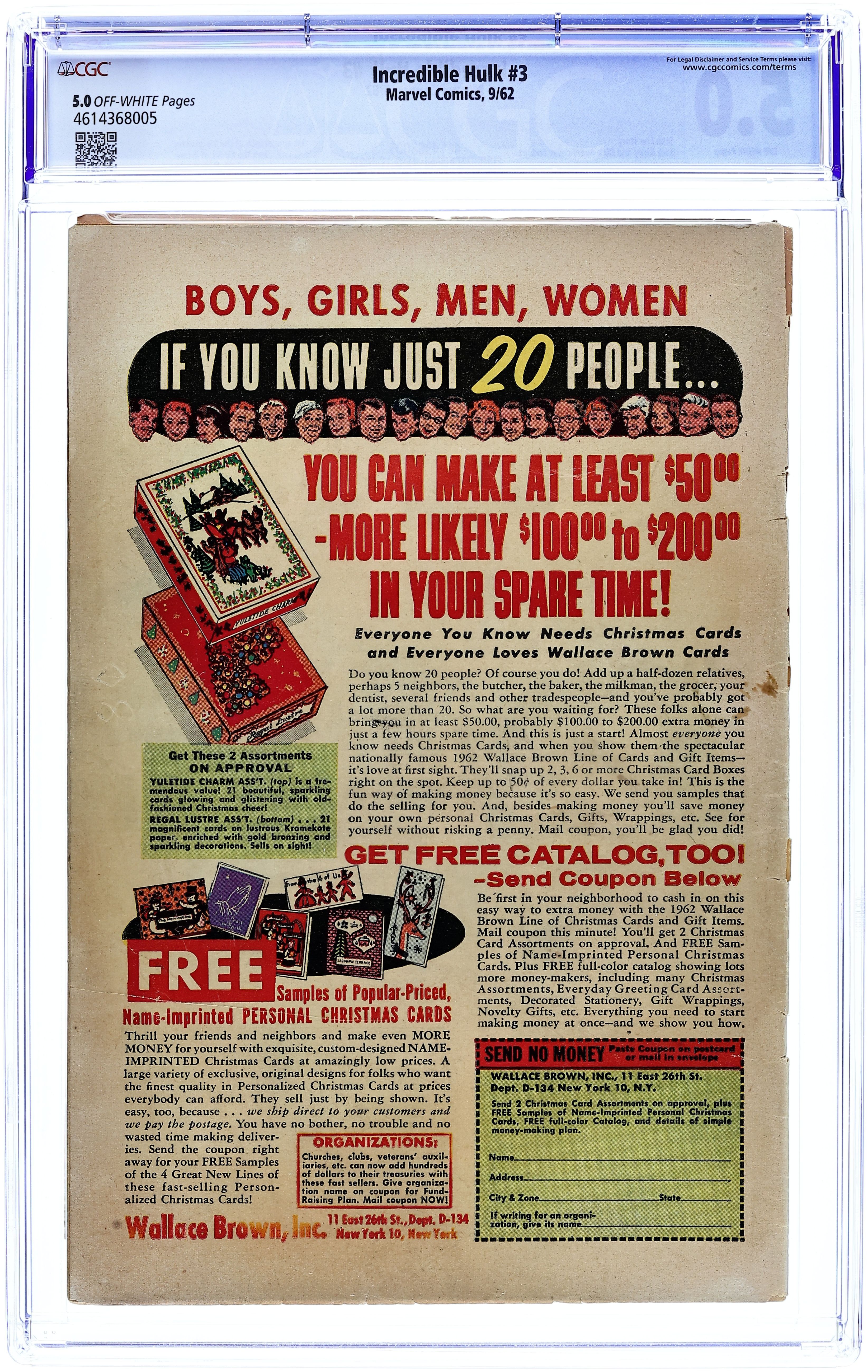 Cover pencils by Jack Kirby, inks by Steve Ditko. First appearance of the green Hulk and the Toad Men in "The Terror of the Toad Men," script by Stan Lee, pencils by Jack Kirby, inks by Steve Ditko; The Toad Men are above Earth, in search of its brightest scientist; Rick and Bruce explore an underground cave where they hope to imprison Hulk each night; The Toad men capture Bruce Banner and bring him to their spaceship; Bruce Banner is found in a Toad Men crashed spaceship while their fleet arrives on Earth; Hulk escapes from his cell while General Ross forget about the Toad Men. Fantastic Four ad. 36 pgs., full color. $0.12. Cover price $0.12.