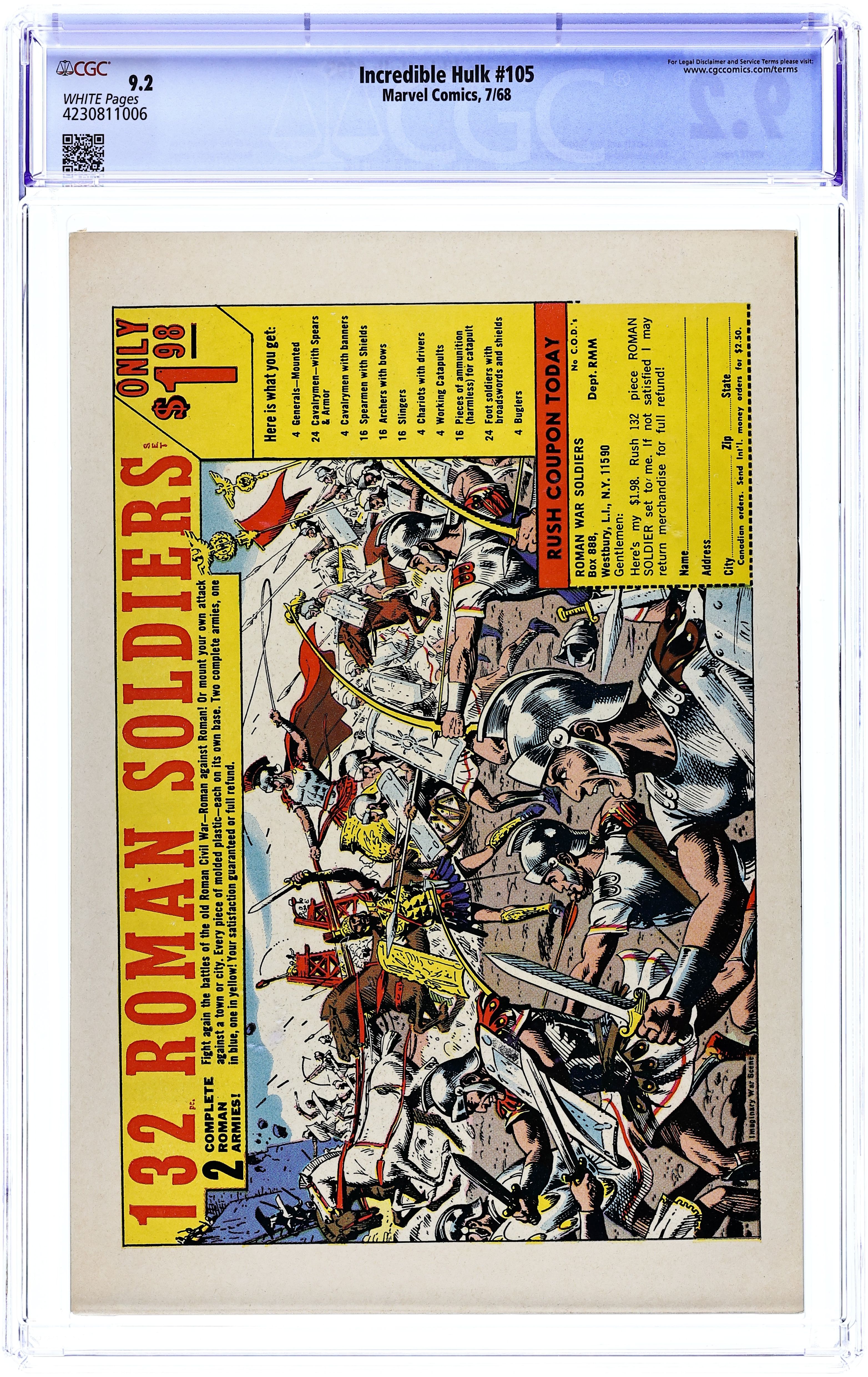 Cover art by Herb Trimpe. No More the Monster!, script by Roy Thomas, art by Herb Trimpe; Mr. Fantastic uses a machine on the Hulk that turns him back into Bruce Banner and allows him to transform into the Hulk at will while still retaining his own intellect; Bruce vows never to become the Hulk again and reunites with Betty who accepts his proposal of marriage; Thunderbolt Ross also makes nice with his soon to be son-in-law but asks him to become the Hulk one last time to protect a new and deadly military weapon during transport; The Leader tries to steal the weapon but is stopped by the Hulk who finds himself feeling more savage as he almost kills his deadliest foe. 36 pgs. $0.15. Cover price $0.15.