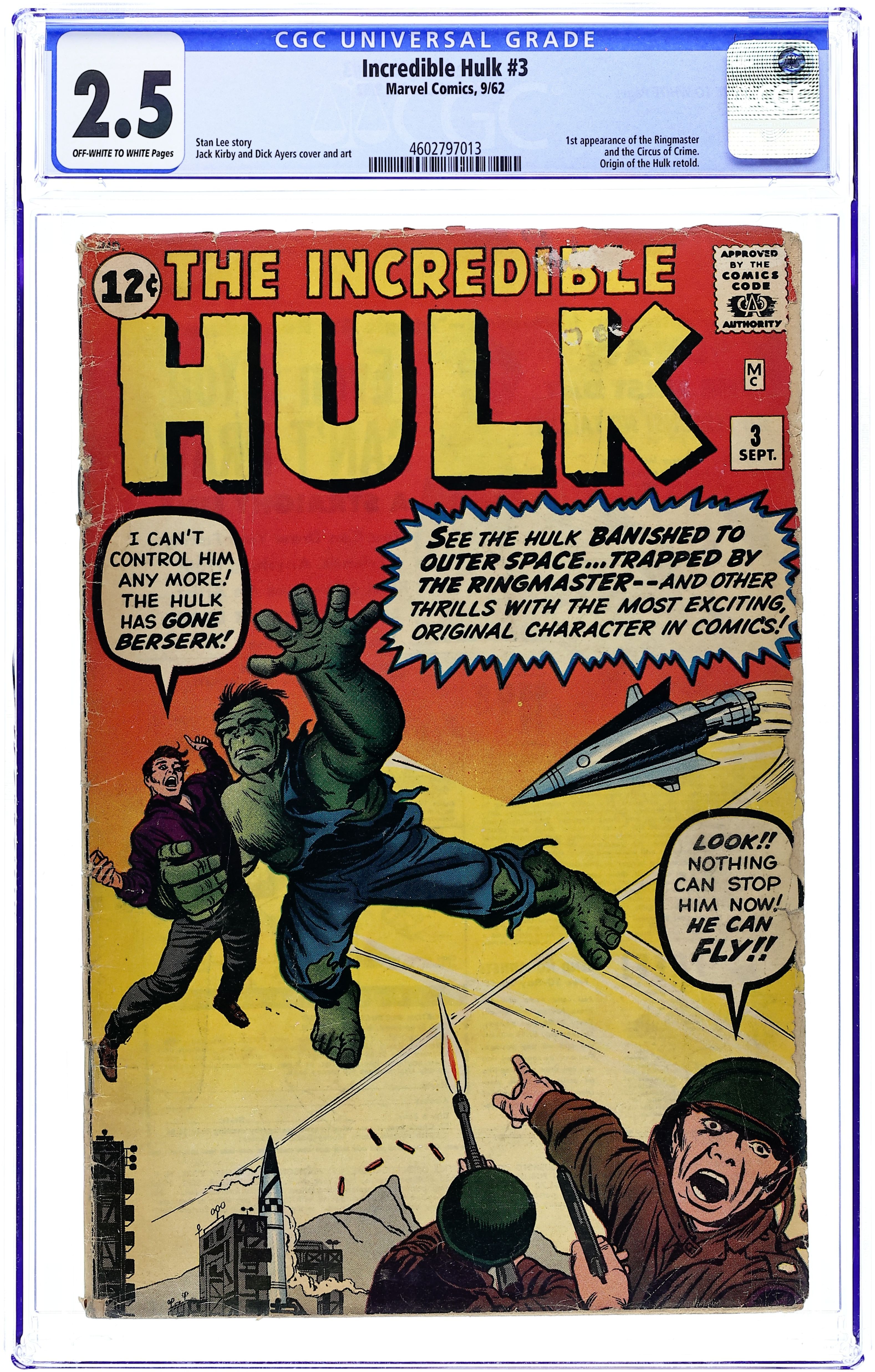 Cover pencils by Jack Kirby, inks by Dick Ayers. First Silver Age appearance of the Ringmaster and the Circus of Crime in "Banished to Outer Space!;" The military captures Rick and Ross convinces him that they need the Hulk to test a new experimental rocket for national security; Rick tricks the jade giant into the capsule but once it is shot into space, he realizes that Ross deceived him to get rid of his foe. "The Origin of the Hulk!," script by Stan Lee, pencils by Jack Kirby, inks by Dick Ayers. The Ringmaster, script by Stan Lee, pencils by Jack Kirby, inks by Dick Ayers; Rick takes a break from his Hulk-sitting duties and goes to the circus. 36 pgs., full color. $0.12. Cover price $0.12.