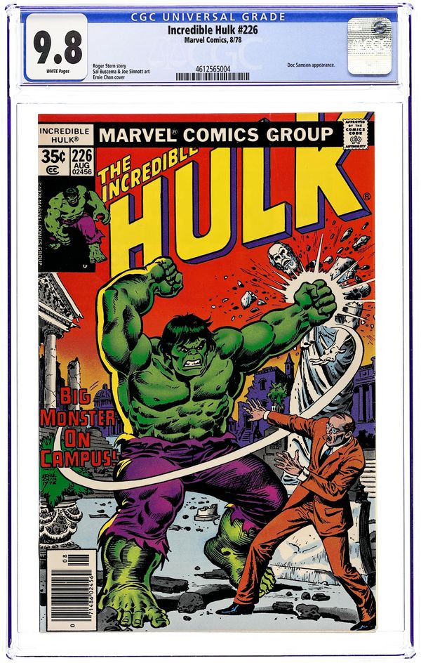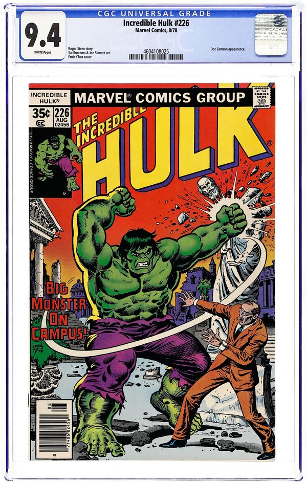 Cover by Ernie Chan. "Big Monster on Campus!", script by Roger Stern, pencils by Sal Buscema (breakdowns) and Joe Sinnott (finished art), inks by Joe Sinnott; Hulk punches Doc Samson away and leaps from Gamma base; After a while, Ol'Greenskin reaches Desert State University, college where Bruce Banner attended; Some of Banner's memories bother him immensely; Extremely confused, Hulk unloads his anger against a Socrates statue which reads 'Know thyself'; As the giant picks up the statue's head, he turns into Banner crying; Bruce wonders who he really is; And Doc Samson shows up offering his professional help. 36 pgs., full color. $0.35. Cover price $0.35.