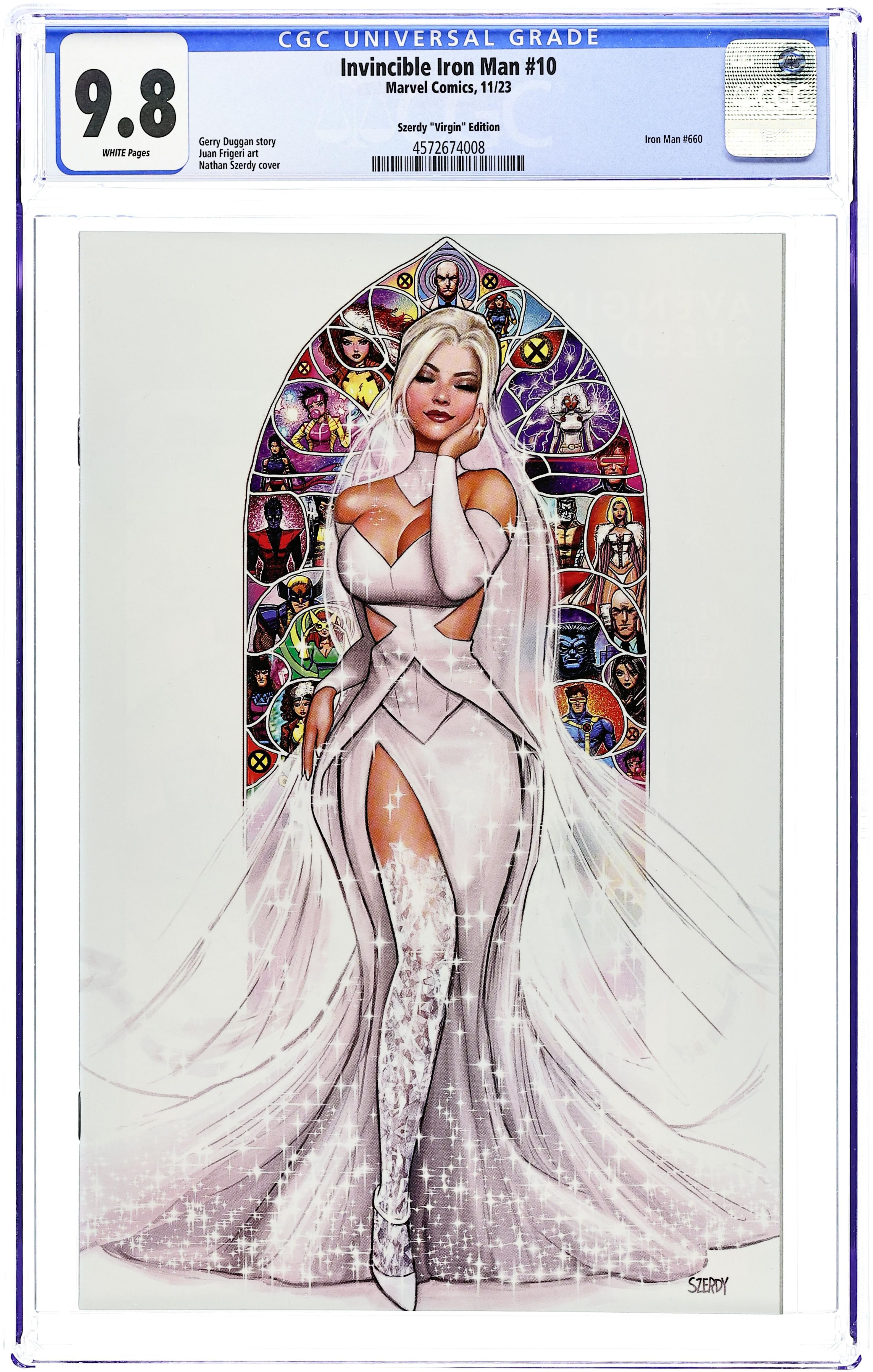 Comics Illuminati (Unknown Comics, Comic Traders, Anti-Hero Gallery, and The 616 Comics) Exclusive Virgin Cover by Nathan Szerdy. Written by Gerry Duggan. Art by Juan Frigeri. You are cordially invited to the wedding of Anthony Edward Stark and Emma Grace Frost…Come join the lucky couple as they exchange vows. Attire is Hellfire formal. Orchis raid to follow. Plus some exclusive wedding extras! 36 pages, full color. Rated T+