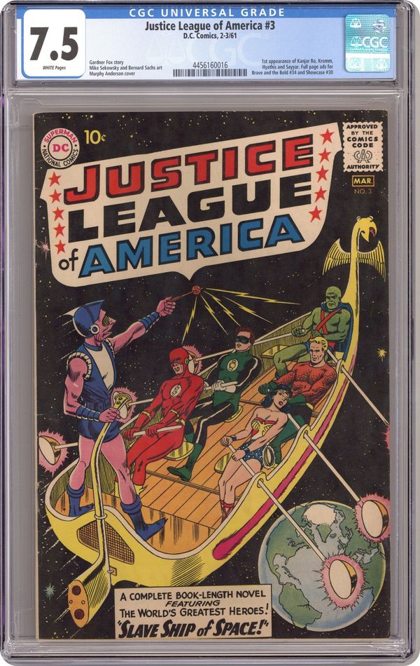 Cover art by Murphy Anderson. The Slave Ship of Space!, script by Gardner Fox, pencils by Mike Sekowsky, inks by Bernard Sachs; Kanjar Ro forces the Justice League to help him defeat his enemies by freezing the people of Earth motionless. Only the combined voices of his enemies--Kromm, Hyathis, and Sayyar--saying "Kanjar Ro" can release them. 36 pgs. $0.10. Cover price $0.10.