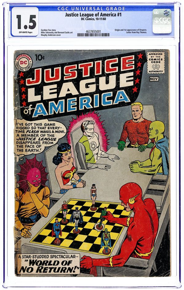 Cover art by Murphy Anderson. The World of No Return!, script by Gardner Fox, pencils by Mike Sekowsky, inks by Bernard Sachs; The Flash must beat Despero in a strange chess-like game to save the other members of the Justice League and the people of Despero's home dimension, Kalanor. Letter to the editor from comic writer Roy Thomas. 36 pgs. $0.10. Cover price $0.10.