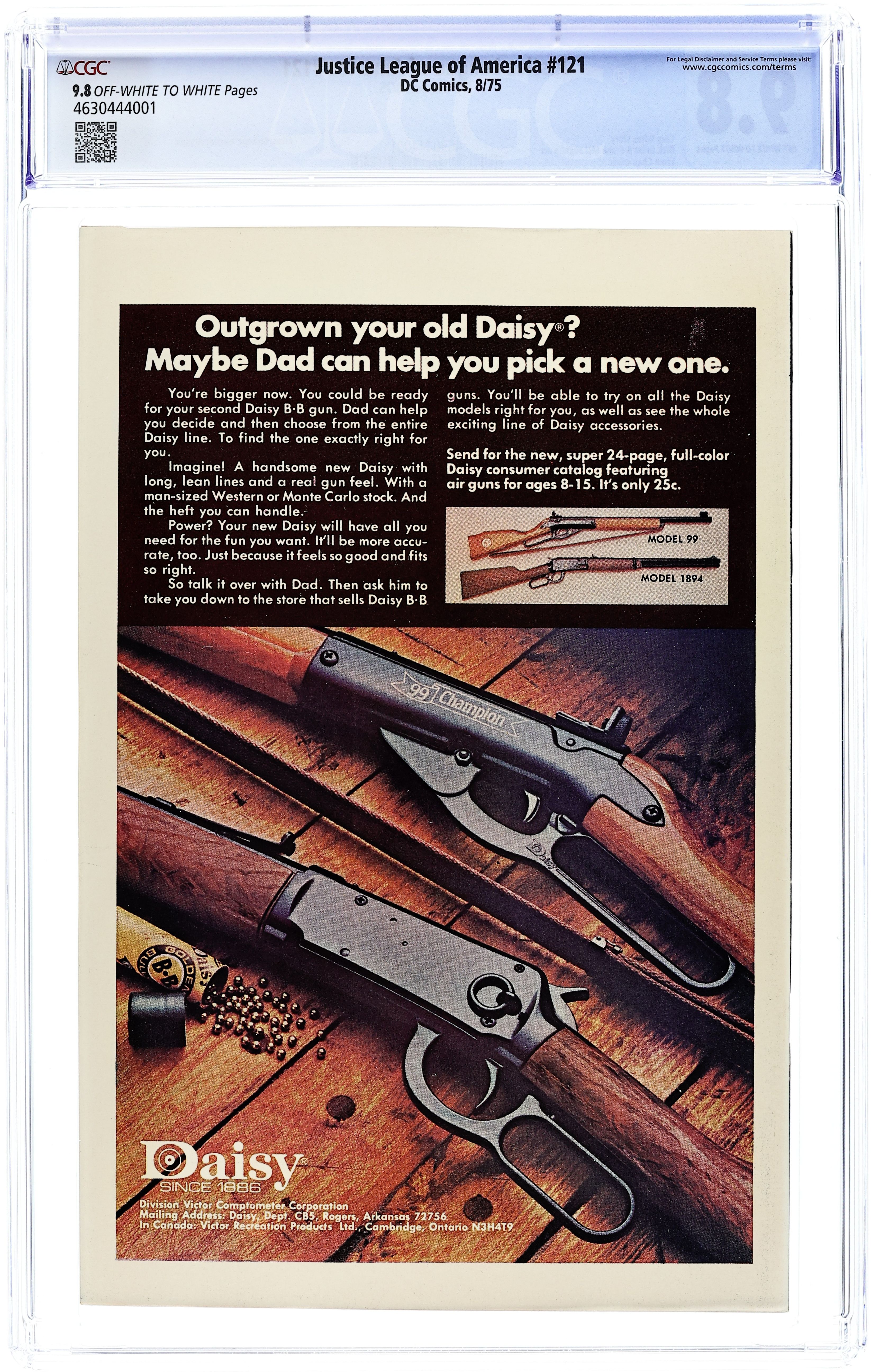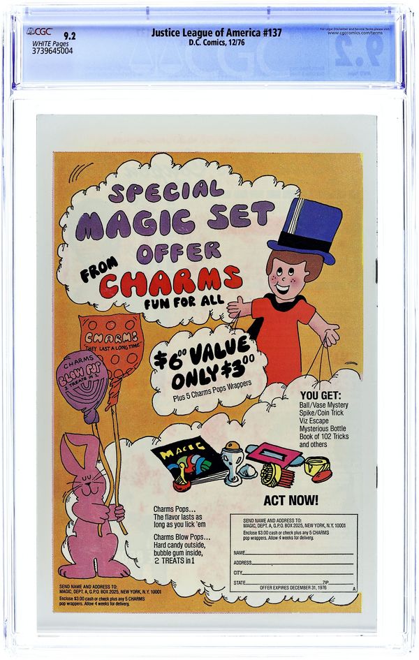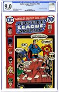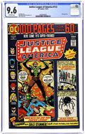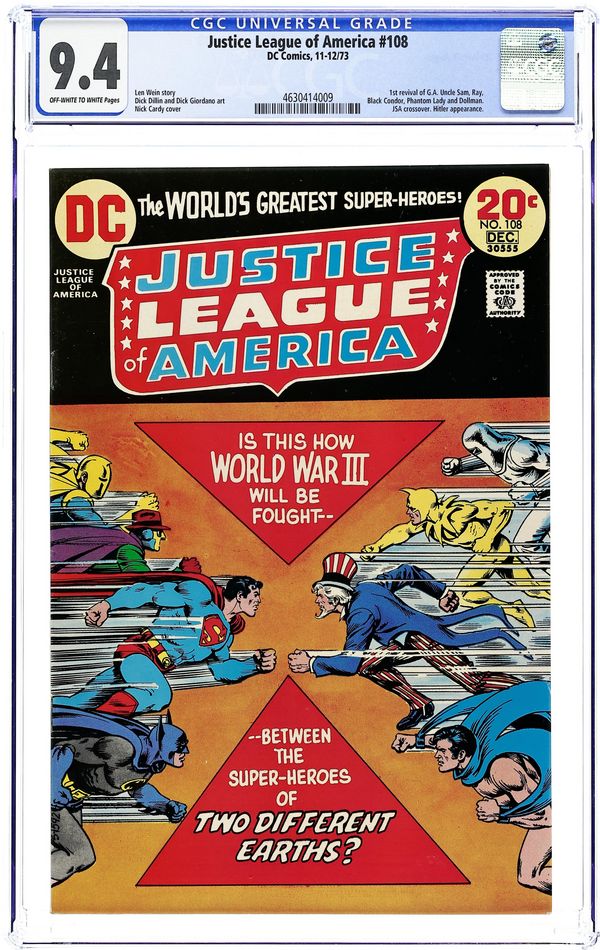 100-page giant issue. Cover art by Nick Cardy. The Creature in the Velvet Cage!, script by Len Wein, pencils by Dick Dillin, inks by Dick Giordano; After the beginnings of the annual get-together betwen the JLA and JSA as they capture the Horned Owl Gang on Earth-2, a silent alarm is triggered inside of Sandman's old lab; When both teams arrive, they discover a sand monster that they must face has escaped; After further explanations as to who or what the monsters is by Sandman, it's revealed it was once his former partner, Sandy, who had been struck accidentally by an energy beam in his lab, that changed his body into pure silica. The Freedom Train starring the JLA. The Case of the Patriotic Crimes, script by Gardner Fox, pencils by Carmine Infantino, inks by Frank Giacoia (Chapter 1) pencils by Arthur Peddy, inks by Bernard Sachs (Chapter 2) pencils & inks by Irwin Hasen (Chapter 3). The Cavern of Deadly Spheres!, script by Gardner Fox, pencils by Mike Sekowsky, inks by Bernard Sachs; features a character called Jerry Thomas, a character whose name is a combination of Jerry Bails and Roy Thomas. 100 pgs. $0.60. Cover price $0.60.