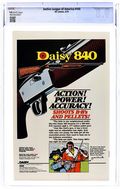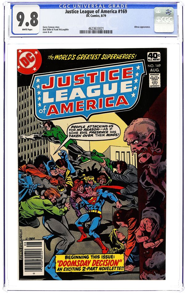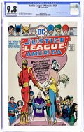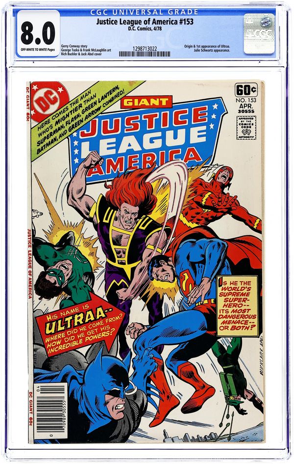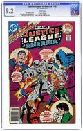 Direct Edition. "A League Divided" is written by Gerry Conway, with art by George Perez and Brett Breeding, with chapter art by Pat Broderick/Terry Austin, Jim Aparo, Dick Giordano, Gil Kane, Carmine Infantino/Frank Giacoia, Brian Bolland, and Joe Kubert. Characters: Martian Manhunter [J'onn J'onzz]; Aquaman; Wonder Woman [Earth-1]; Green Lantern [Hal Jordan]; Flash [Barry Allen]; Superman [Earth-1]; Batman [Earth-1]; Firestorm; Red Tornado; Hawkman [Katar Hol]; Zatanna; Black Canary; Atom [Ray Palmer]; Snapper Carr (all as the Justice League of America/JLA, origin recap); green kryptonite (flashback); Green Arrow [Earth-1] (guest star); Adam Strange (guest star); Phantom Stranger (guest star); Alanna (cameo); Rulers of Appellax (villains); green kryptonite. Wraparound cover by George Perez. Cover price $1.50.