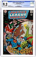 1st Silver Age appearance Vigilante. 1st appearance of the Justice League Satellite. Cover art by Gil Kane. The Coming of the Doomsters, script by Denny O'Neil, pencils by Dick Dillin, inks by Joe Giella; The League moves into their new satellite headquarters, which is located 22,300 miles above the United States. The Man Who Hated Science, script by Jack Miller, art by John Giunta. 36 pgs. $0.15. Cover price $0.15.