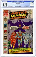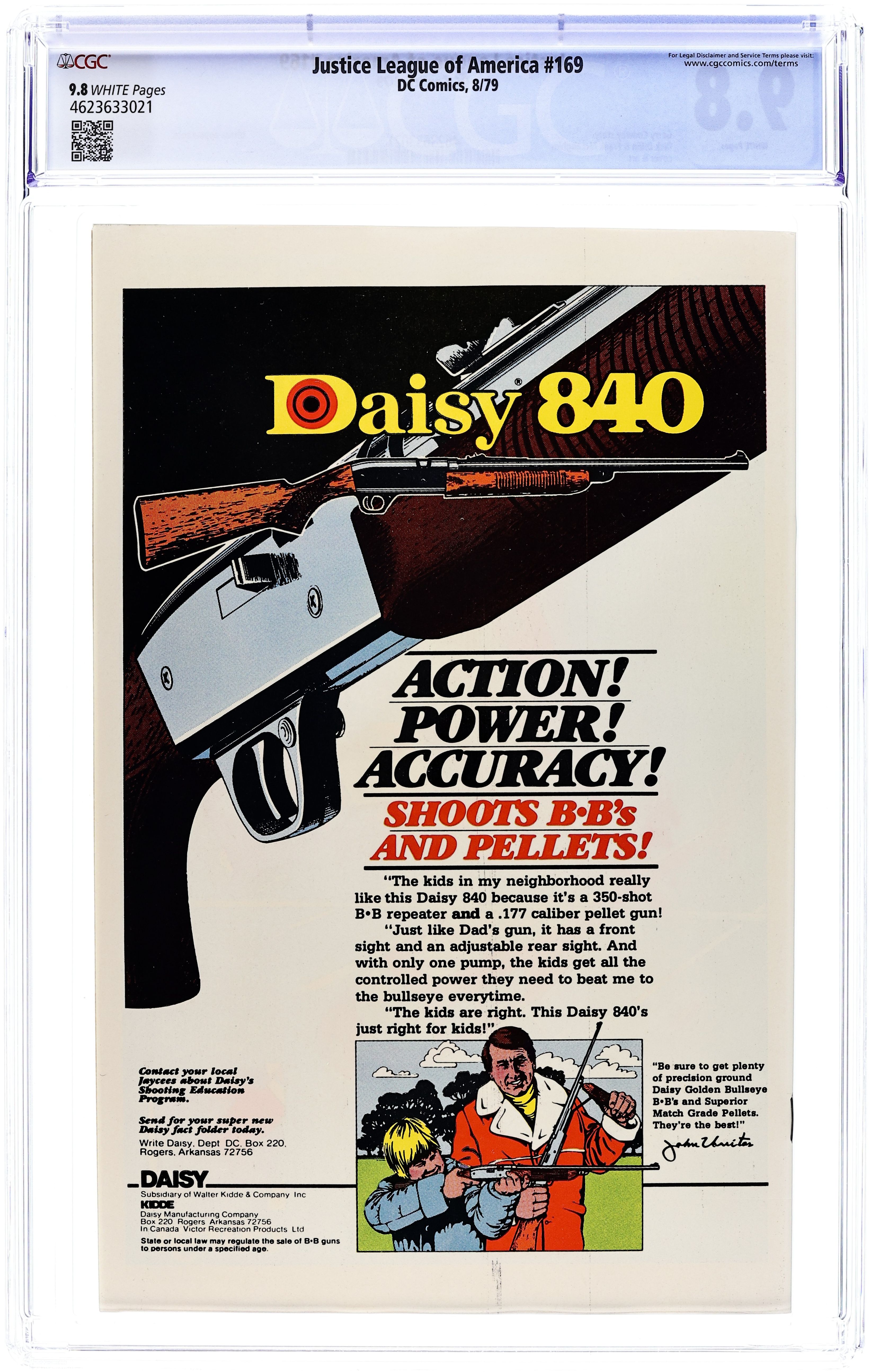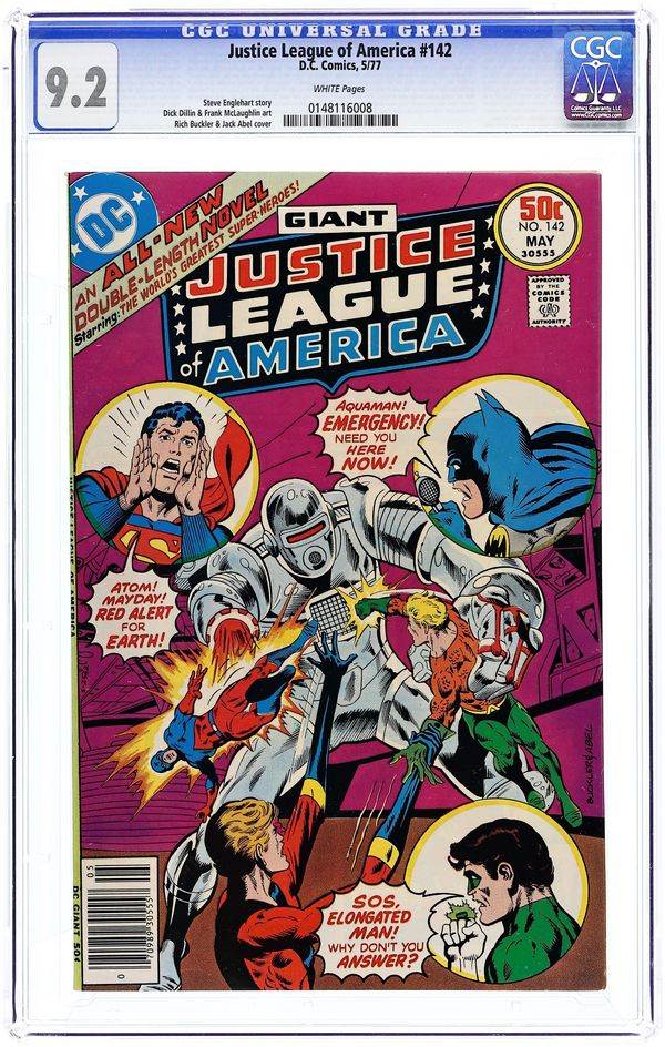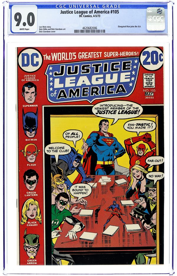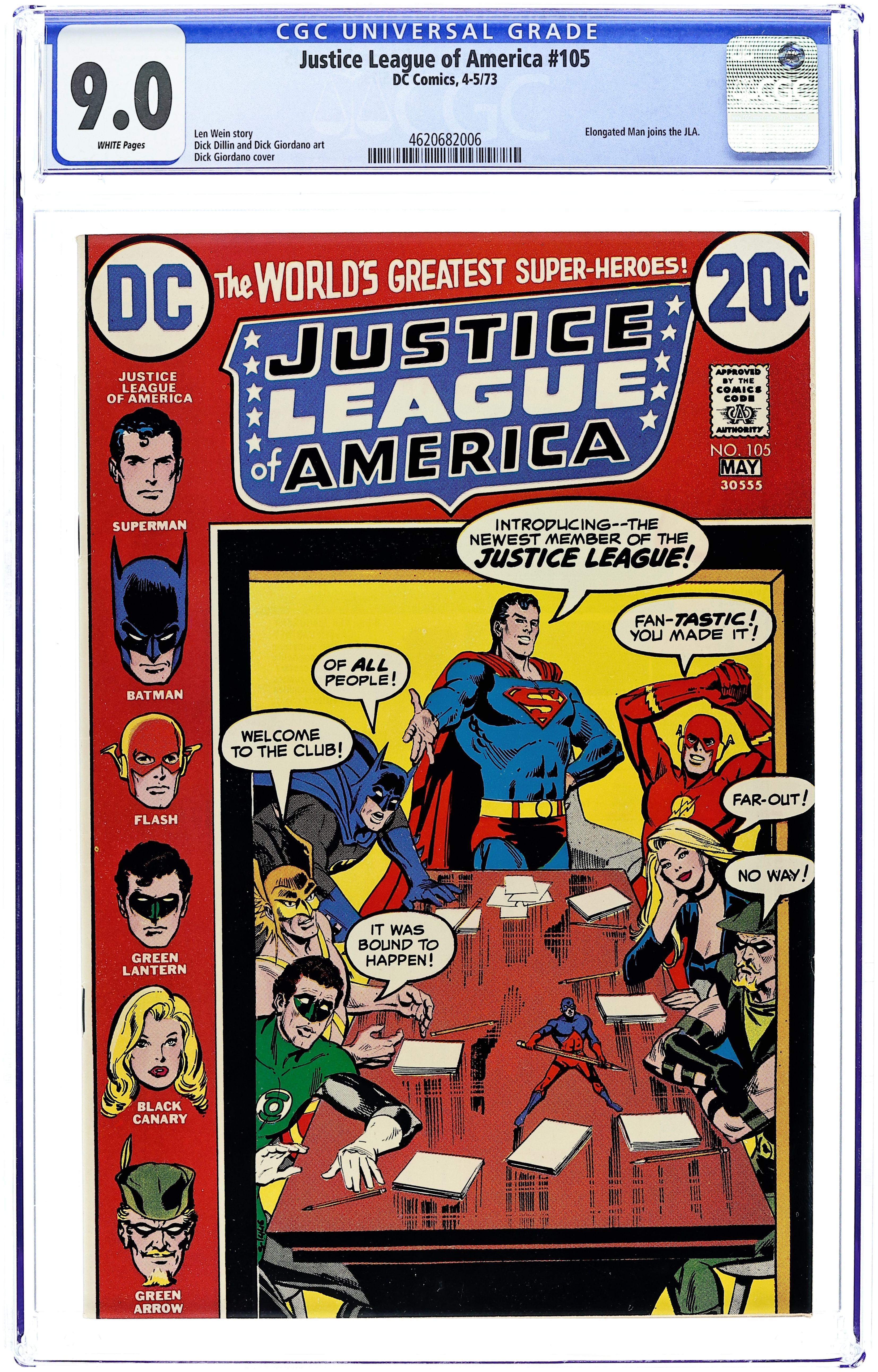 Cover art by Dick Giordano. Specter in the Shadows! starring Aquaman, Hawkman [Katar Hol], Green Arrow, Batman, Black Canary, The Atom [Ray Palmer], Superman, Green Lantern [Hal Jordan], The Flash [Barry Allen], Elongated Man, The Putty-Men, Red Tornado (cameo), and Sue Dibny, script by Len Wein, pencils by Dick Dillin, inks by Dick Giordano; the Elongated Man gets inducted into JLA. 36 pgs. $0.20. Cover price $0.20.