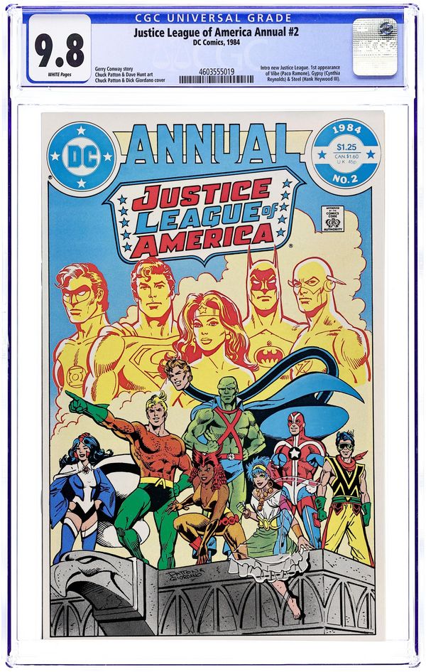 Direct Edition. Cover by Chuck Patton and Dick Giordano. "…The End of the Justice League. Story by Gerry Conway. Pencils by Chuck Patton. Inks by Dave Hunt. JLA Detroit begins here. Disgusted that the Earth was almost conquered while many Leaguers were away, Aquaman dissolves the old League to create a new group committed to being a team full time. A few old members stick around, joined by new characters Steel, Vixen, Vibe and Gypsy. 48 pages. Full color. Cover price $1.25.