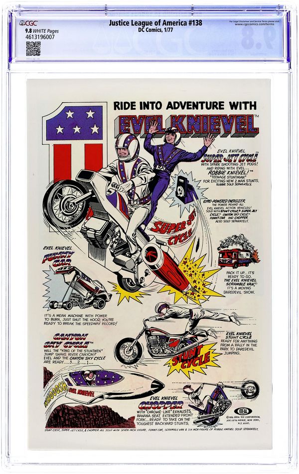 Newsstand Edition. A Thunderbolt berserk in "Crisis in the Thunderbolt Dimension!" Guest-starring the all-star Justice Society! Continued next issue. Written by Roy Thomas and Gerry Conway, with art by Chuck Patton and Romeo Tanghal. Characters: Flash [Barry Allen]; Black Canary; Green Arrow [Hal Jordan]; Red Tornado; Zatanna; Elongated Man; Firestorm; Batman [Earth-1] (flashback); Atom [Ray Palmer] (flashback); Hawkman [Katar Hol] (flashback); Superman [Earth-1] (all as the Justice League of America/JLA); Huntress [Helena Wayne]; Dr. Mid-Nite (flashback); Superman [Earth-2] (flashback); Power Girl; Starman [Ted Knight]; Hourman [Rex Tyler] Flash [Jay Garrick]; Johnny Thunder's Thunderbolt (all as the Justice Society of America/JSA); Fiddler; Chronos; Dr. Alchemy; Icicle; The Wizard; Felix Faust; Aquarius (flashback); Johnny Thunder [Earth-1] (villain); Black Canary [Dinah Lance]. Cover by George Perez. Cover price $0.60.