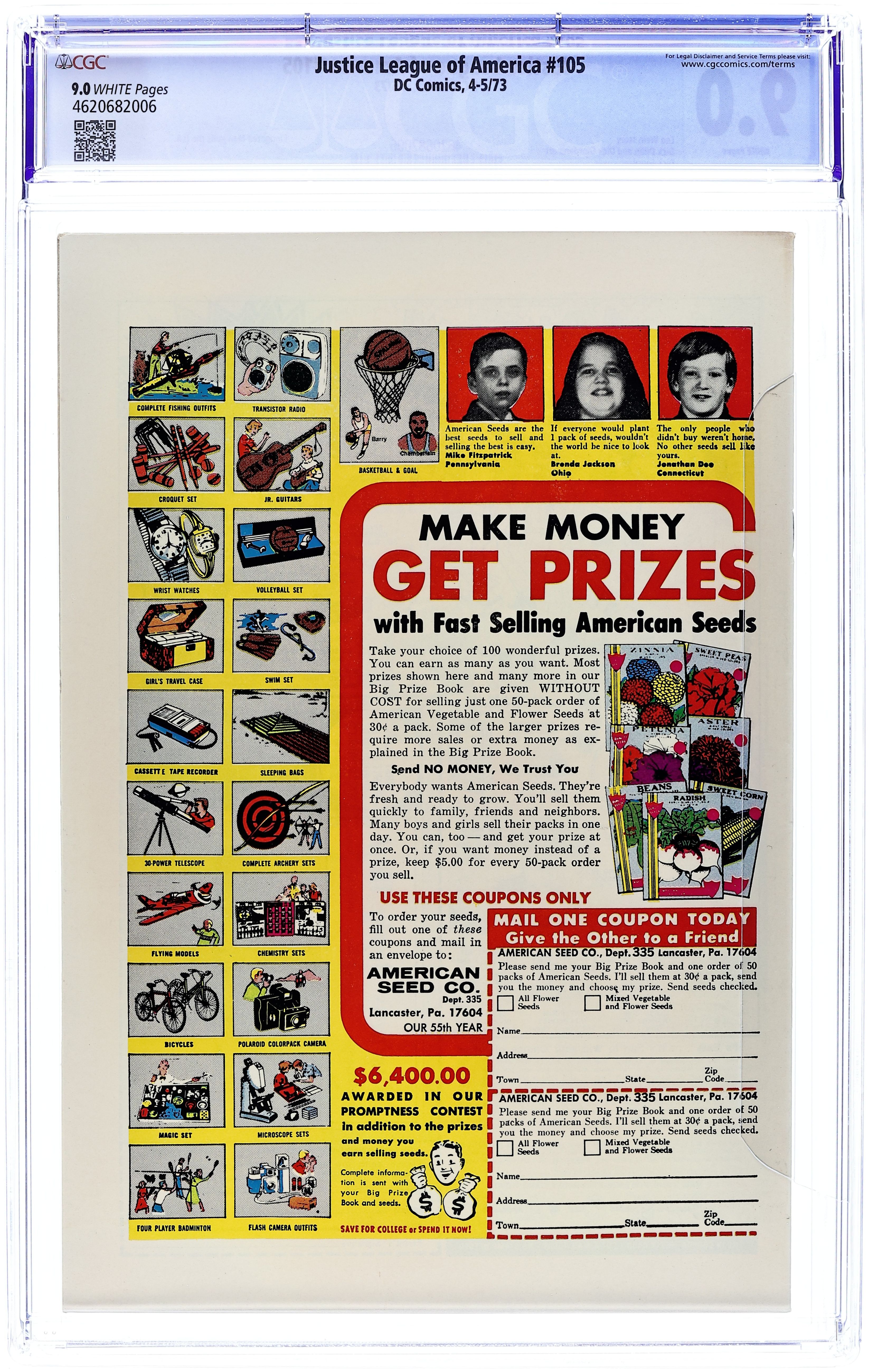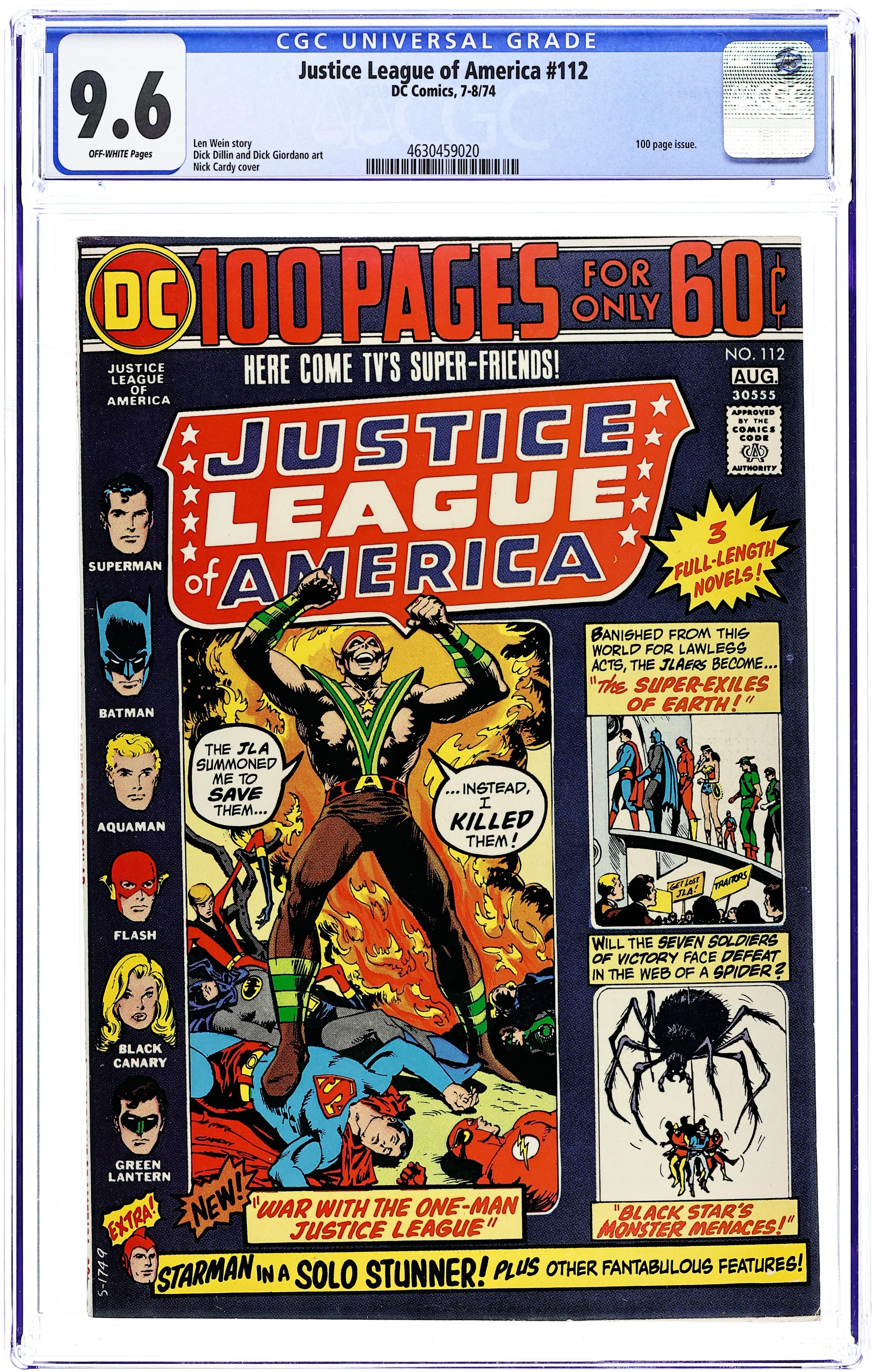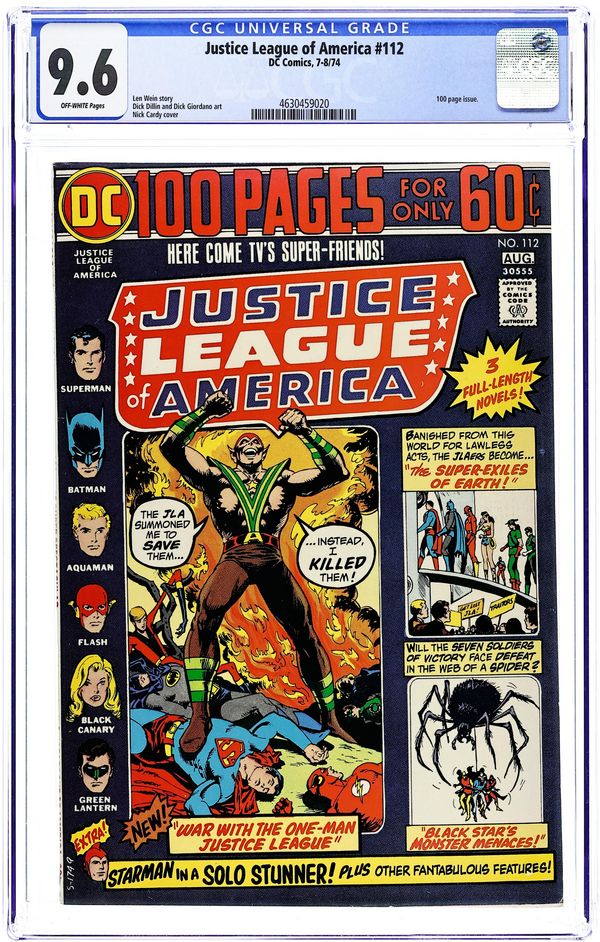 100-page giant issue. Cover art by Nick Cardy. War with the One-Man Justice League!, script by Len Wein, pencils by Dick Dillin, inks by Dick Giordano; The Justice League has lost some of their powers and frees Amazo to gather the powers unto himself, and thereafter transfer their powers back to the JLA members using a machine. Amazo and His Creator, script by Martin Pasko, pencils by Mike Sekowsky and Carmine Infantino, inks by Bernard Sachs, Joe Giella, and Sid Greene. Beware! The Black Star Shines! starring the Seven Soldiers of Victory, art by Jon Smalle. The Case of the Twisted Twins! starring the Crimson Avenger, art by Jack Lehti. The Sixty Kiddie Club! starring Vigilante, script by Bill Finger, art by Mort Meskin. The Origin of Starman article by Julius Schwartz. Starman's Lucky Star!, script by Gardner Fox, pencils by Mort Meskin, inks by George Roussos. The Super-Exiles of Earth! starring the Justice League of America, script by Gardner Fox, pencils by Mike Sekowsky, inks by Bernard Sachs. 100 pgs. $0.60. Cover price $0.60.