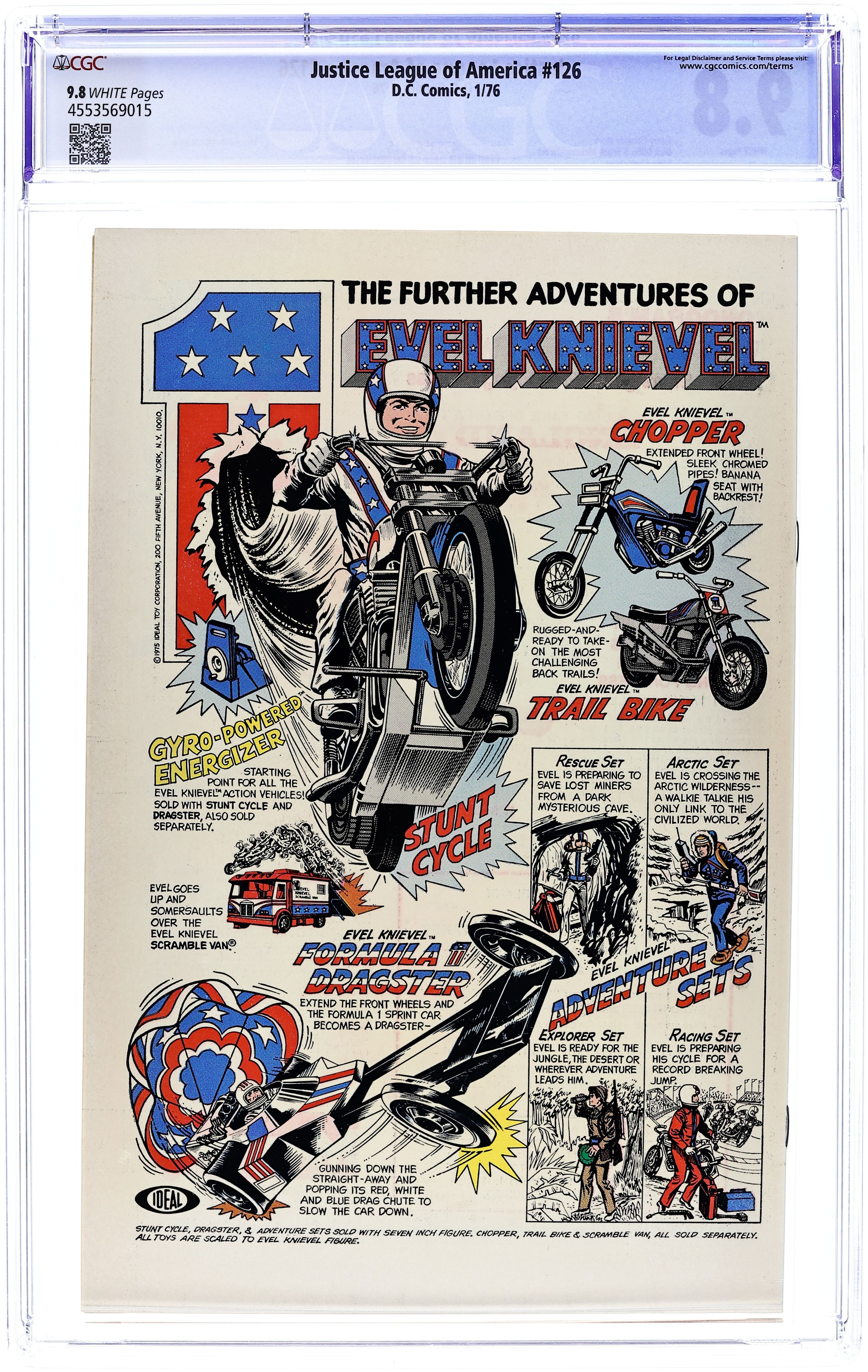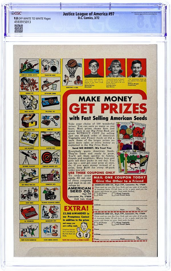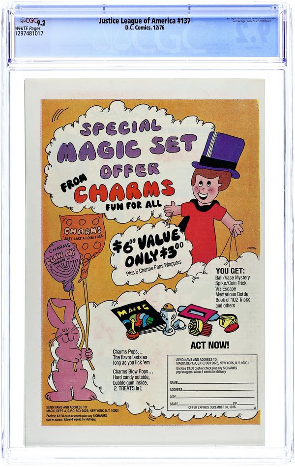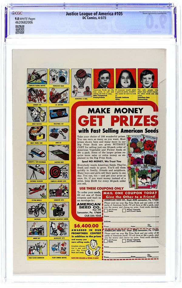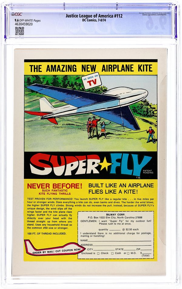 100-page giant issue. Cover art by Nick Cardy. War with the One-Man Justice League!, script by Len Wein, pencils by Dick Dillin, inks by Dick Giordano; The Justice League has lost some of their powers and frees Amazo to gather the powers unto himself, and thereafter transfer their powers back to the JLA members using a machine. Amazo and His Creator, script by Martin Pasko, pencils by Mike Sekowsky and Carmine Infantino, inks by Bernard Sachs, Joe Giella, and Sid Greene. Beware! The Black Star Shines! starring the Seven Soldiers of Victory, art by Jon Smalle. The Case of the Twisted Twins! starring the Crimson Avenger, art by Jack Lehti. The Sixty Kiddie Club! starring Vigilante, script by Bill Finger, art by Mort Meskin. The Origin of Starman article by Julius Schwartz. Starman's Lucky Star!, script by Gardner Fox, pencils by Mort Meskin, inks by George Roussos. The Super-Exiles of Earth! starring the Justice League of America, script by Gardner Fox, pencils by Mike Sekowsky, inks by Bernard Sachs. 100 pgs. $0.60. Cover price $0.60.