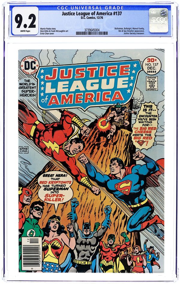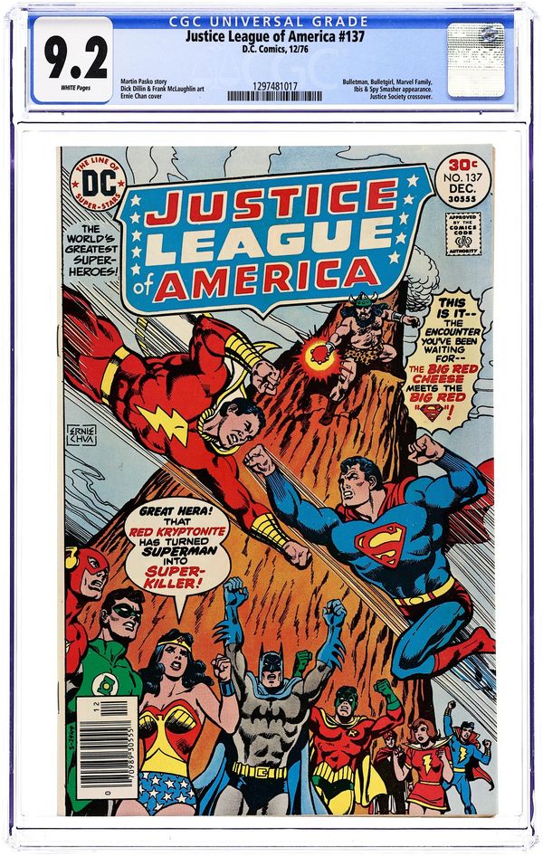 First 15c cover-priced issue. 1st Silver Age appearance of Golden Age Superman. Cover art by Joe Kubert. Star Light, Star Bright--Death Star I See Tonight!, script by Denny O'Neil, pencils by Dick Dillin, inks by Sid Greene; Starman relays his story to the JSA of a new menace, Aquarius, a stellar being who had been disincorporated after his evil acts, and sensing Starman's Cosmic Rod's energies, steals the rod from him to reincorporate himself; After nearly being defeated by the JSA, Aquarius uses the rod to blink Earth-2 out of existence, but not before several members protect themselves in an energy bubble using Fate's magicks and GL's ring's mystic energies. Red Tornado, meanwhile, has been sent to Earth-1 to the JLA to get help battling Aquarius. First 15c cover-priced issue. 36 pgs. $0.15. Cover price $0.15.
