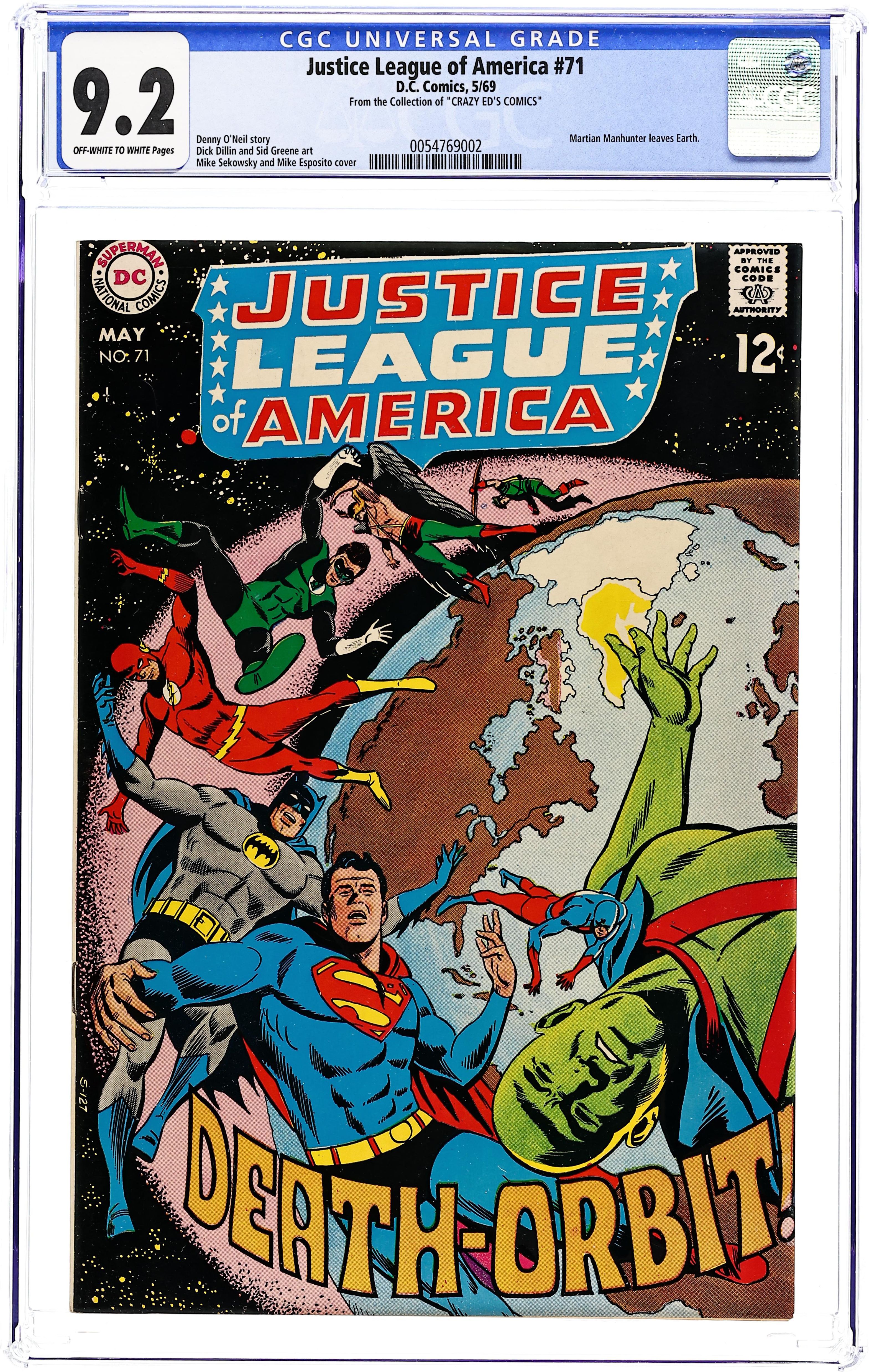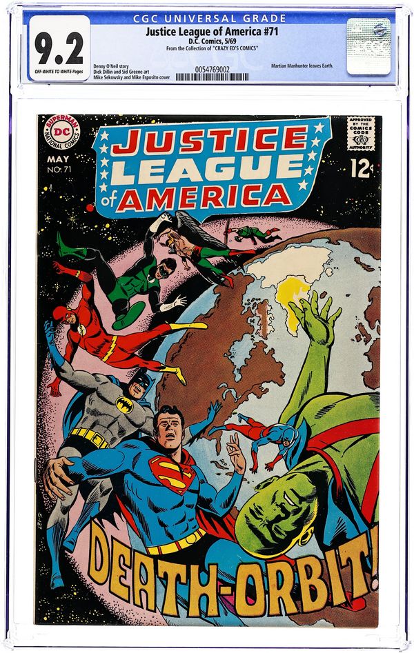 Cover pencils by Mike Sekowsky, inks by Mike Esposito. ...And So My World Ends!, script by Denny O'Neil, pencils by Dick Dillin, inks by Sid Greene; Features the Martian Manhunter as he fights General Blanx, and the population of Mars leaves to colonize another planet; J'onn J'onzz goes with them and leaves the League. 36 pgs. $0.12. Cover price $0.12.