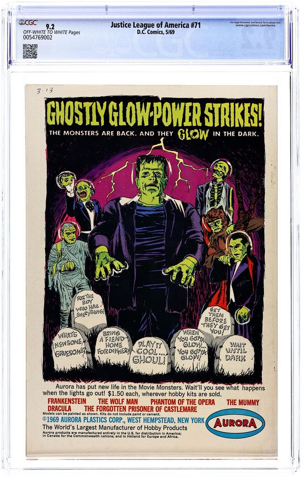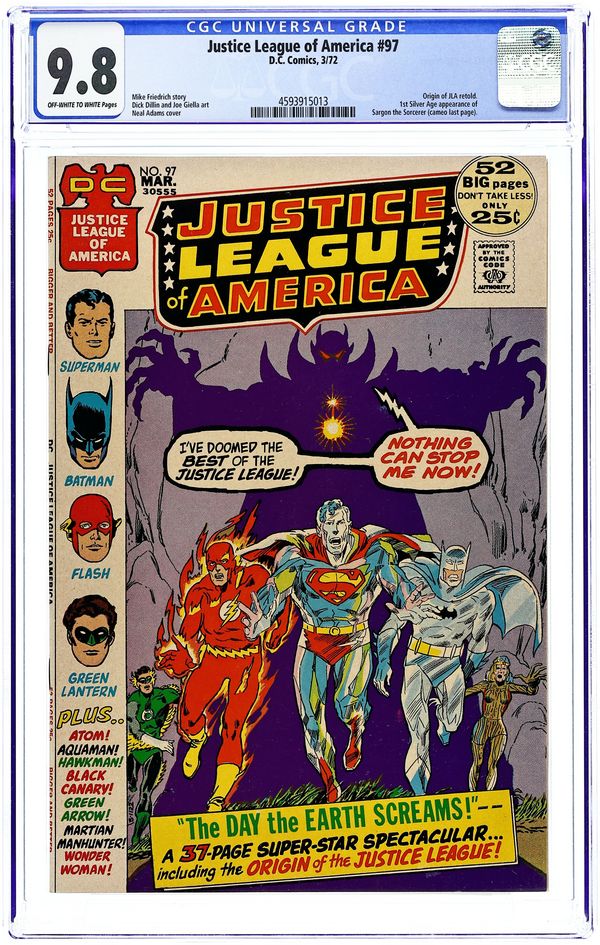 Cover pencils by Neal Adams, inks by Murphy Anderson. The Day the Earth Screams, script by Mike Friedrich (1-14, 27, 29-37) and Gardner Fox (15-26, 28), pencils by Dick Dillin (1-14, 27, 29-37) and Mike Sekowsky (15-26, 28), inks by Joe Giella (1-14, 27, 29-37) and Bernard Sachs (15-26, 28); Superman, Flash, Green Lantern, and Hawkman battle Starbraker, the cosmic vampire; Sargon the Sorcerer guest-stars; the JLA reflect on their origin. 52 pgs. $0.25. Cover price $0.25.