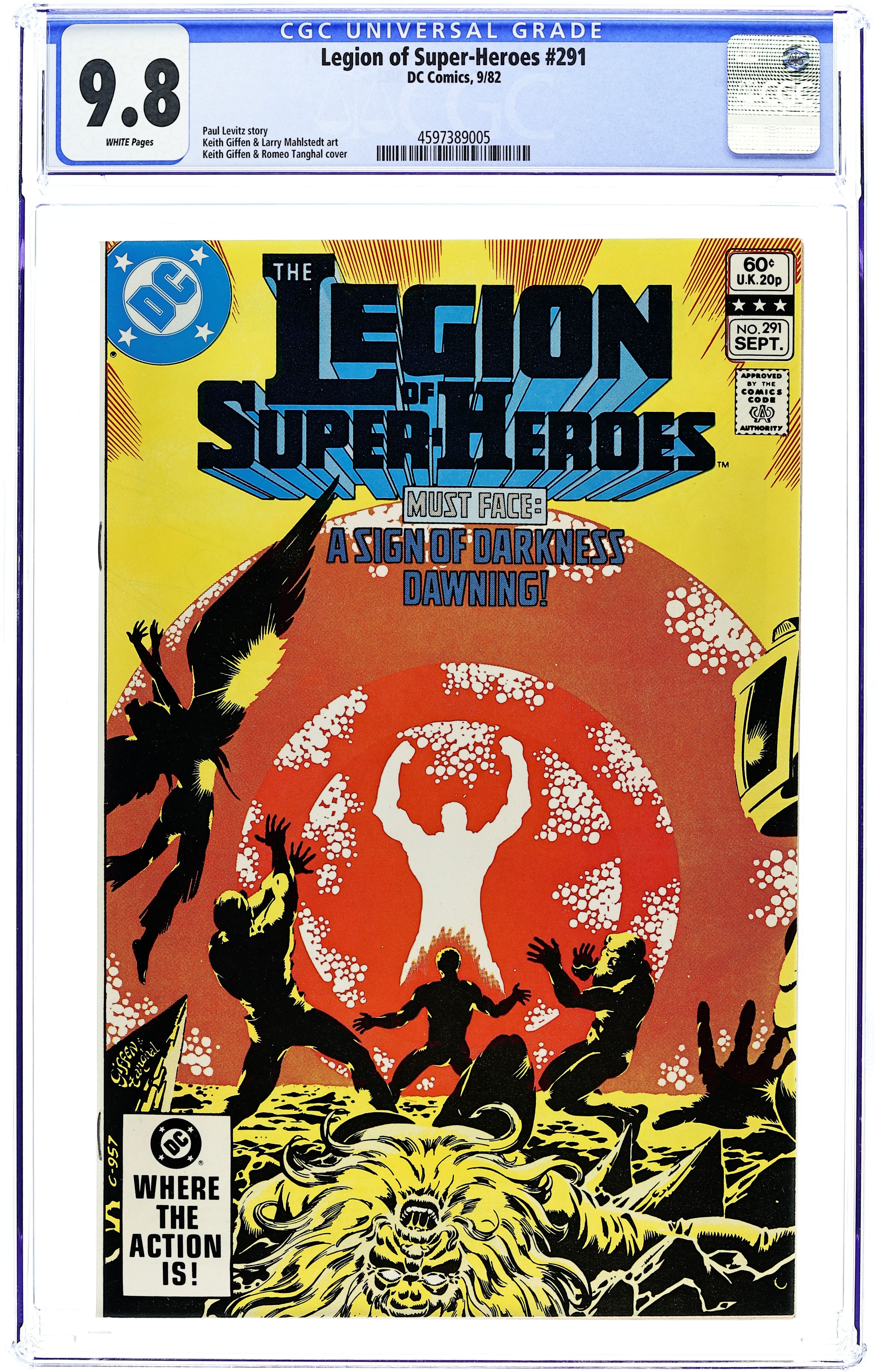 "Here a Villain, There a Villain..." Beginning a new era in the lives of the Legionnaires! The Legion's first deluxe format issue opens the door on a suspenseful, very mysterious and exciting five-part epic destined to be a classic! The Legion of Super-Villains is back--with a plan to destroy the Legion and the universe! Light Lass is kidnapped, the prisoners of Takron-Galtos are broken out, Micro Lad makes trouble, Chameleon Chief, Ronn Karr and other nasties battle our heroes--and Dream Girl's lot is the worst, for she has had a vision that a Legionnaire will die! Written by Paul Levitz and Keith Giffen, with art and cover by Keith Giffen and Larry Mahlstedt. Deluxe format. Cover price $1.25.