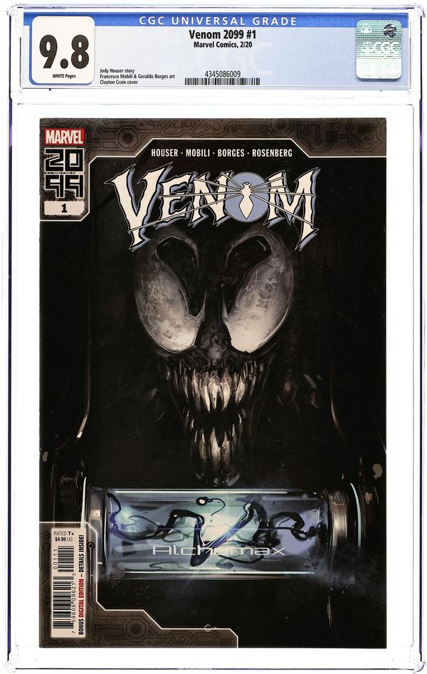 Written by Jody Houser. Art by Francesco Mobili and Geraldo Borges. Cover by Ron Lim. WHAT IS VENOM 2099? Welcome to the future, where the cure for what ails you is at your fingertips with ALCHEMAX! Our industry-leading pharmaceutical department (HELP) is providing consumers with (FREE ME) the bleeding-edge technology you've come to know from our (SAVE ME) products with VENOM, our all-cure drug. Trials begin (DON'T LET THEM DESTORY ME) this December! 32 pages, full color. Rated T+ Cover price $4.99.