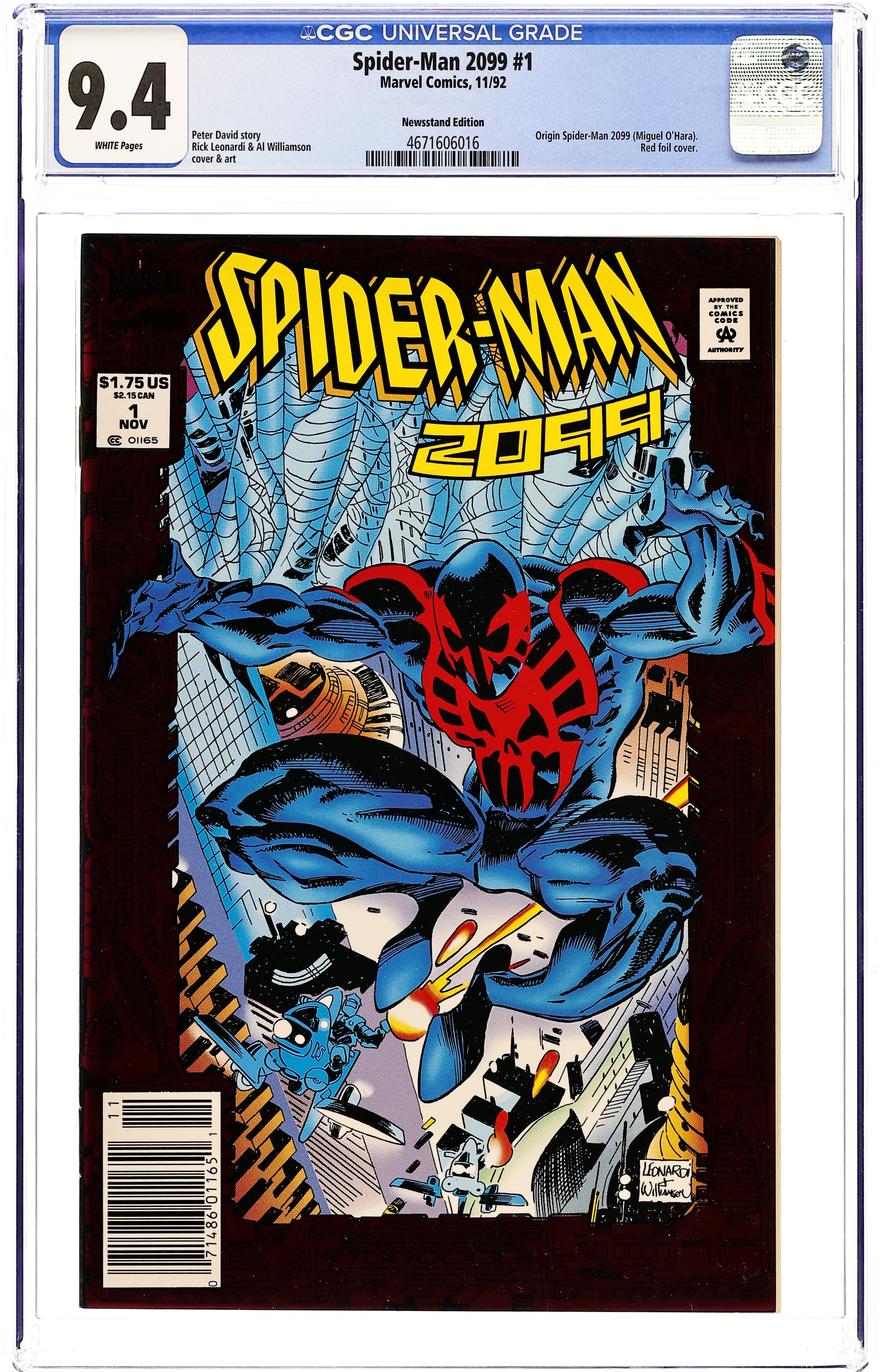 Newsstand Edition. Miguel O'Hara may be a genius, but he's not quick enough to keep from getting addicted to Rapture. So he experiments on himself, but the outcome isn't quite what he expected in this untitled tale. Script by Peter David, pencils by Rick Leonardi, inks by Al Williamson. Red foil stamped cover by Leonardi & Williamson. Cover price $1.75.